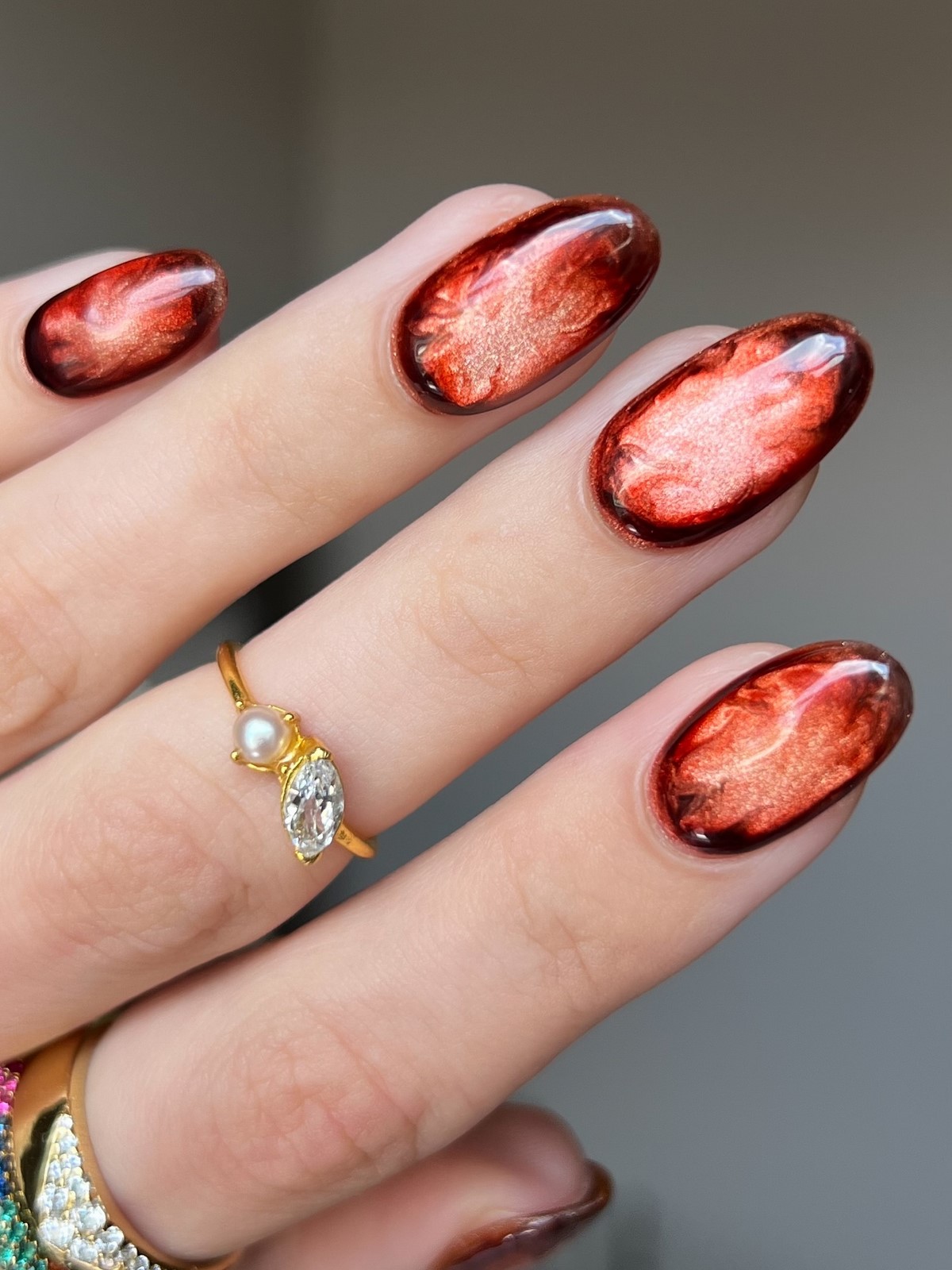 В январе 2026 сияние становится более утонченным. Вместо крупного глиттера используются перламутровые пигменты, микро-шиммер и эффект «влажного блеска». Сияние словно исходит изнутри ногтя, подчеркивая аура-градиент.