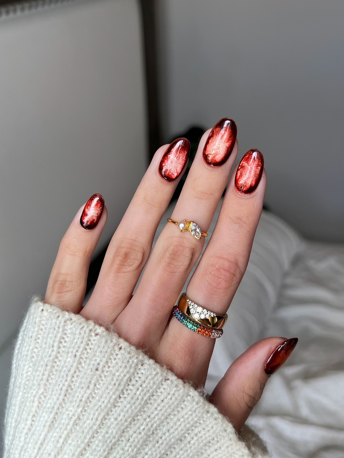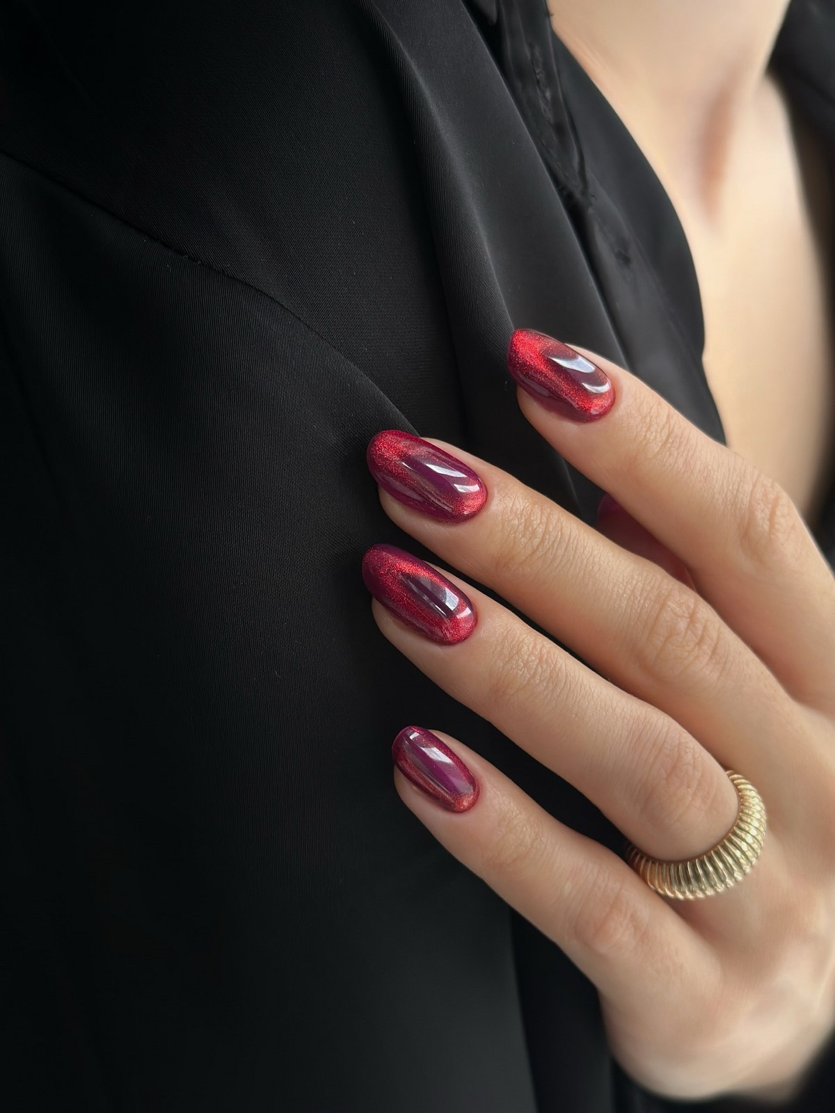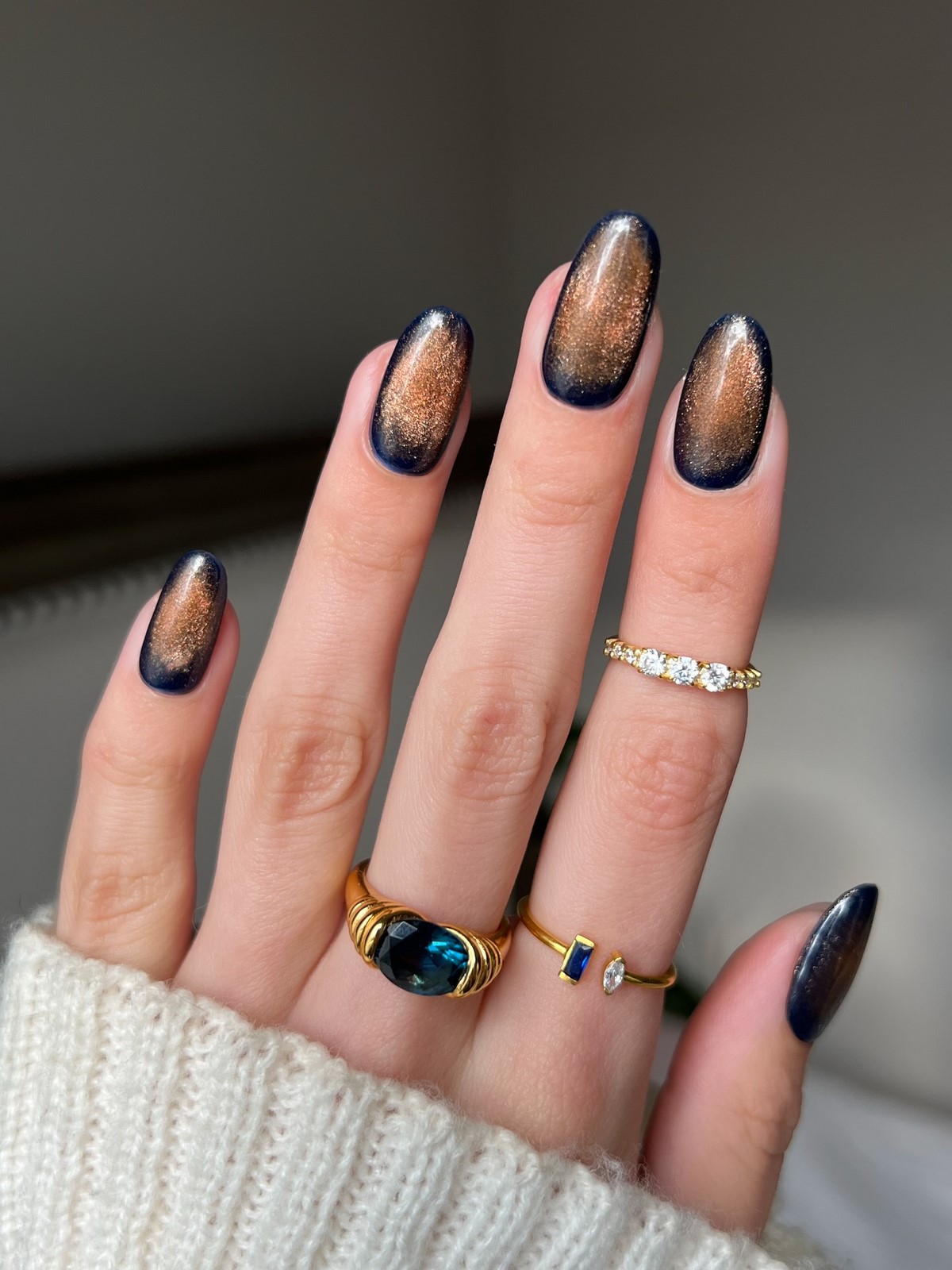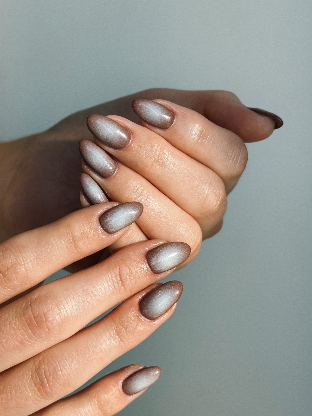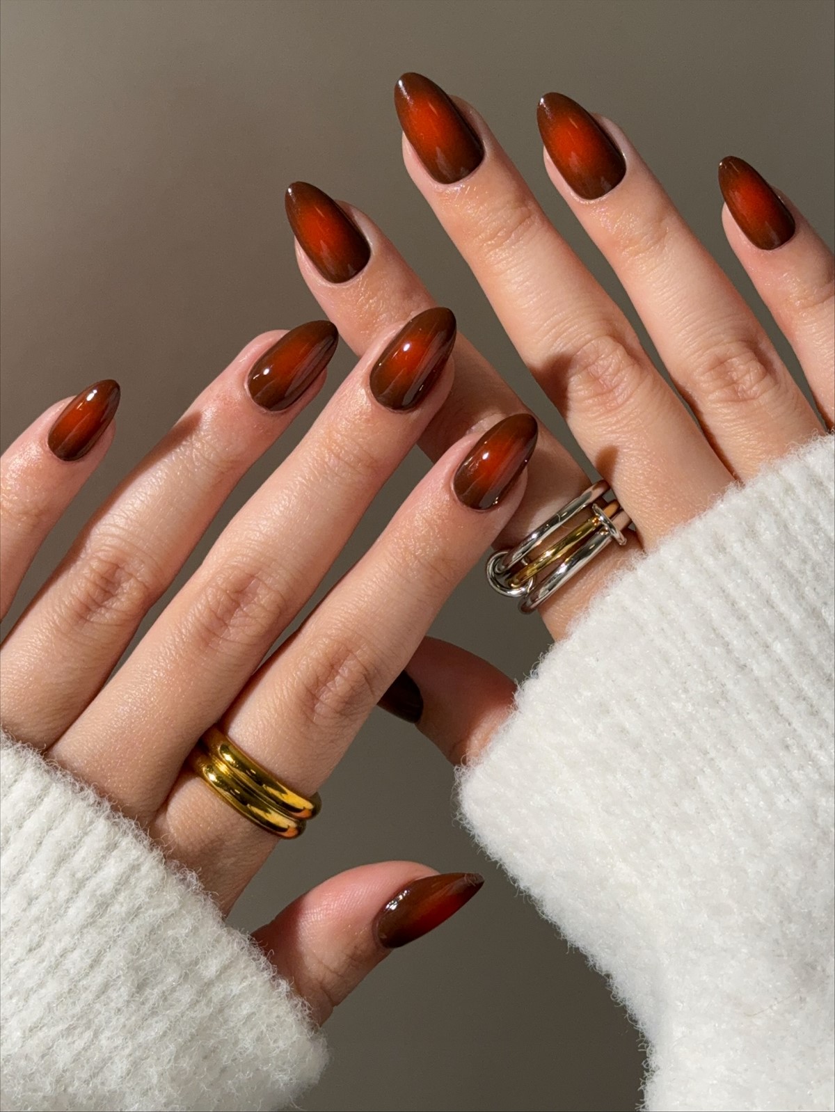 Этот вариант идеально подходит для повседневных зимних образов, когда хочется выглядеть стильно без излишней вычурности. Особенно красиво глубокая аура смотрится на миндалевидной и овальной форме ногтей средней длины.