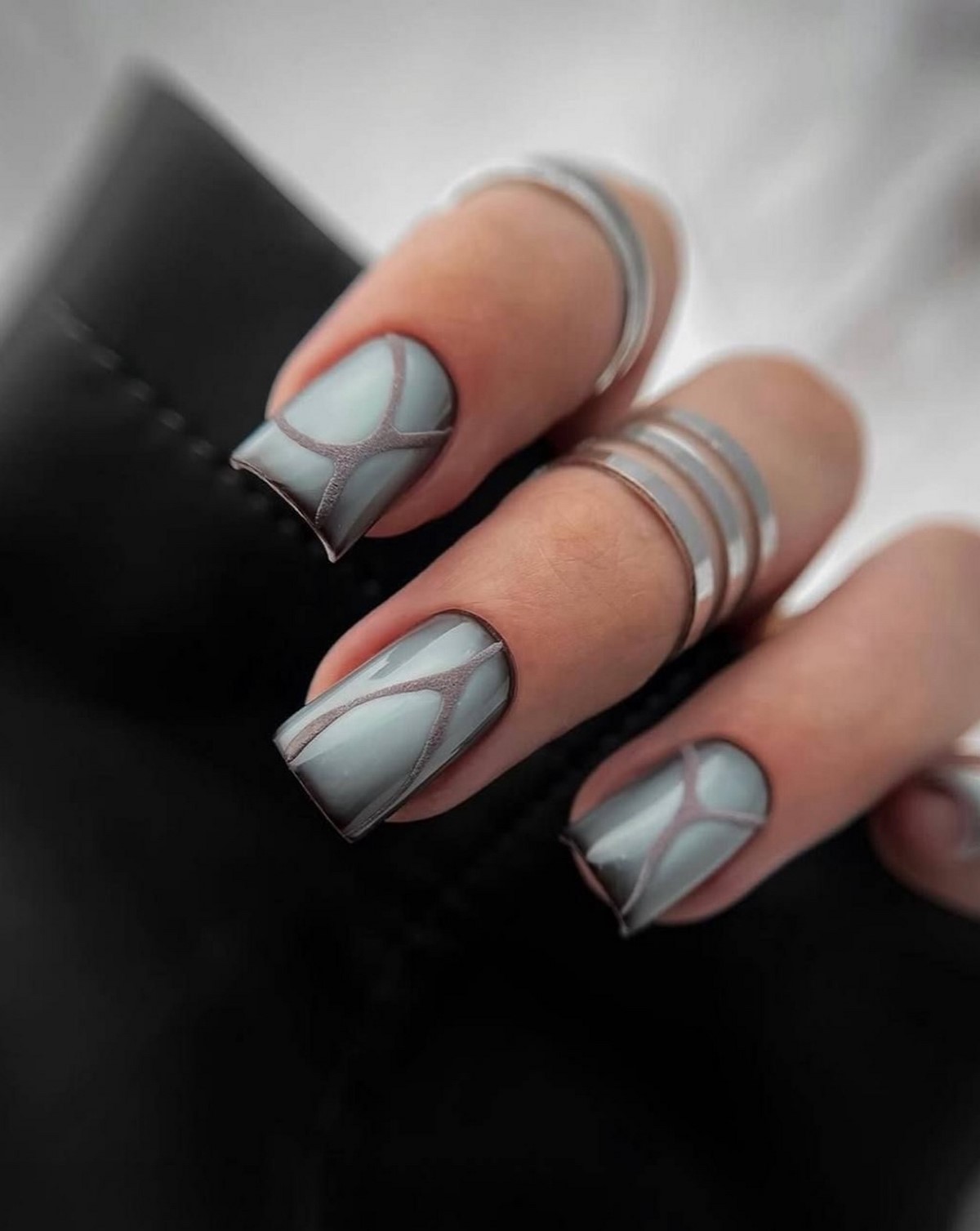 Такой аура маникюр выглядит дорого и концептуально, особенно в холодной палитре — серо-голубой, ледяной белой или приглушенно-фиолетовой. Это отличный выбор для тех, кто ценит нестандартные детали.