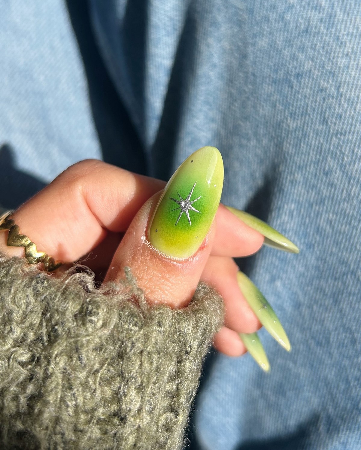 Звезды могут быть выполнены в виде тонких наклеек, ручной росписи или микро-фольги. На фоне светящейся зеленой ауры они выглядят особенно выразительно и добавляют маникюру мистического характера.