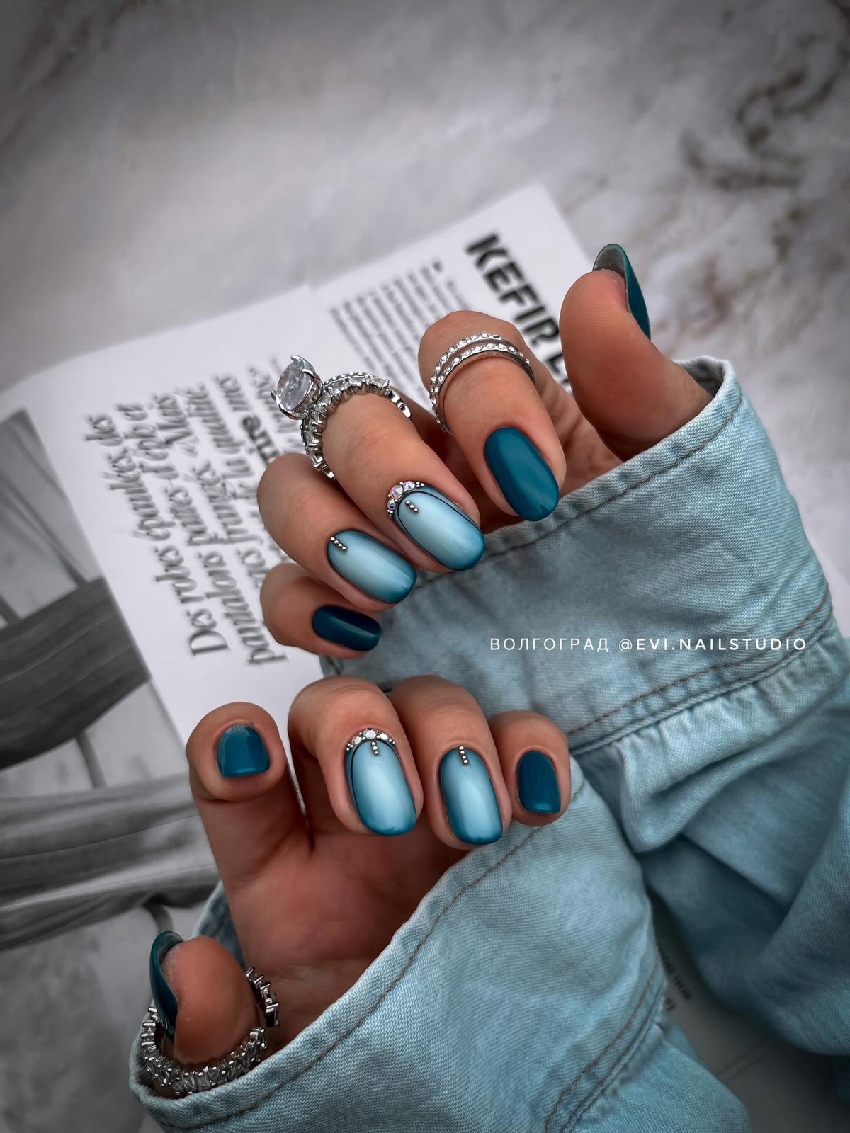 Бархатные покрытия — один из ключевых зимних акцентов 2026 года. В сочетании с аура-градиентом они создают мягкий, почти тактильный эффект. Поверхность ногтей кажется глубокой и уютной, словно покрытой тонким слоем инея.