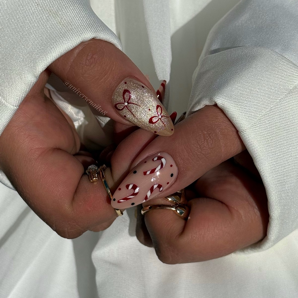 Этот тренд сочетает в себе стильный акцент и аппетитное настроение зимних праздников. Красно-бежевые бархатные полоски напоминают новогодний леденец, создавая игривый и яркий эффект. Такой маникюр отлично подходит для коротких и средних ногтей, визуально удлиняя пластину.