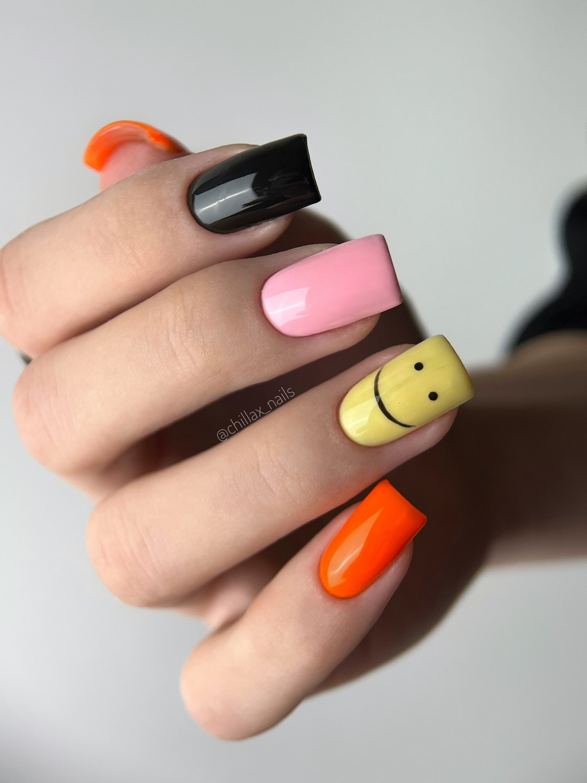 Контраст и игра цвета становятся заметным трендом февраля. Комбинация черного, нежно-розового, желтого со смайликом и оранжевого создает дерзкий, но продуманный образ. Каждый ноготь может иметь свой оттенок или дизайн, при этом общая палитра выглядит гармонично.