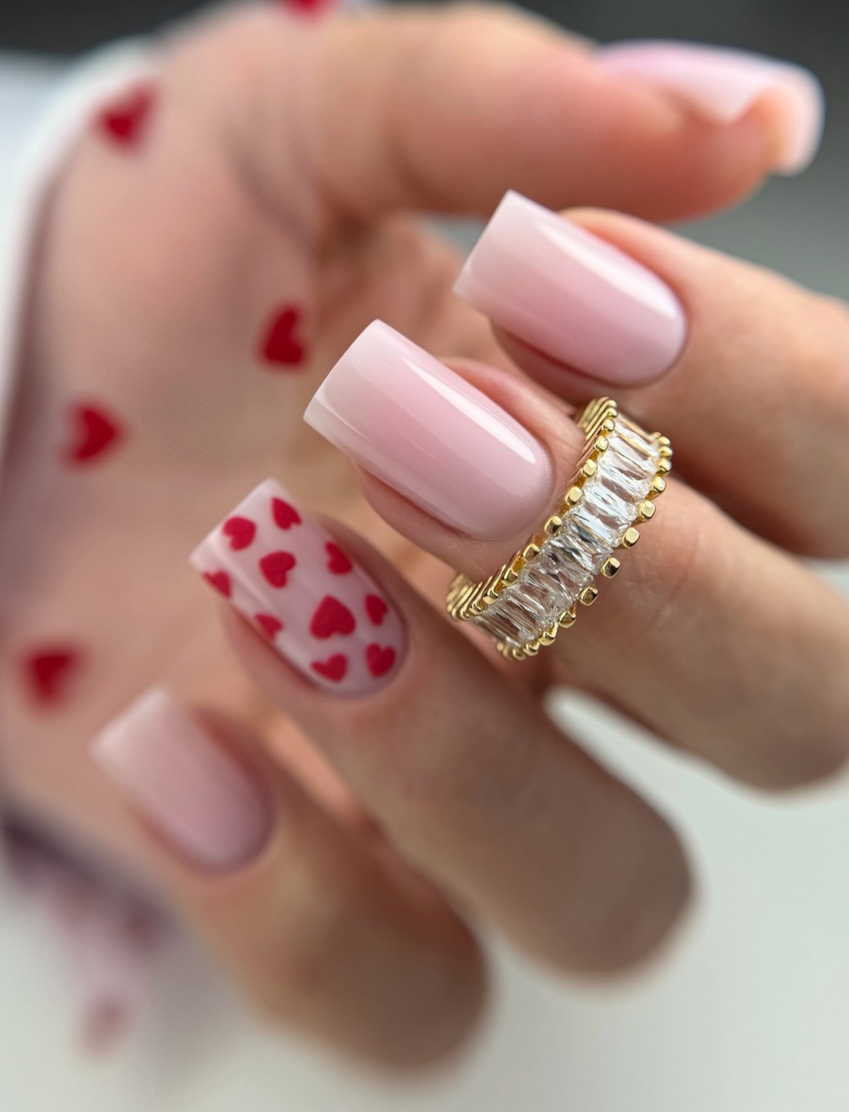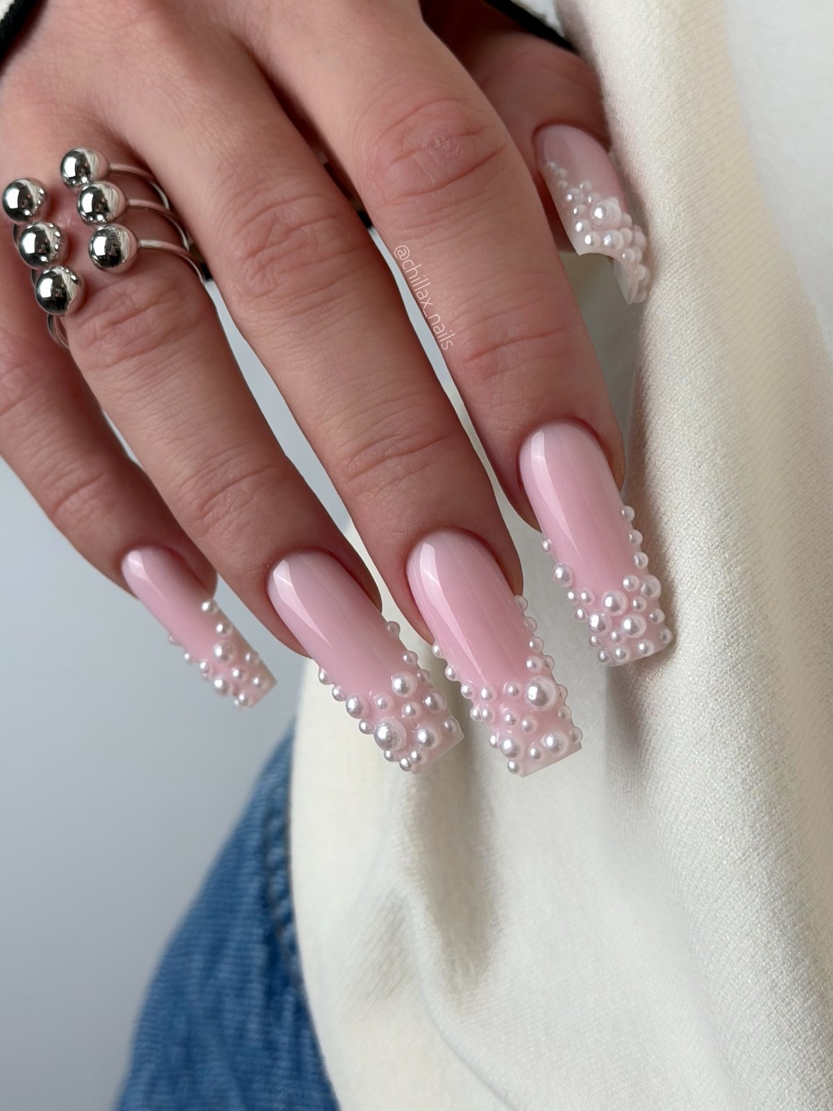 Жемчужный декор в феврале ассоциируется с утонченностью и праздничным настроением. Мелкие жемчужины располагают у основания ногтя, вдоль линии френча или используют как единичный акцент. На длинном квадрате жемчуг выглядит особенно изысканно и дорого.