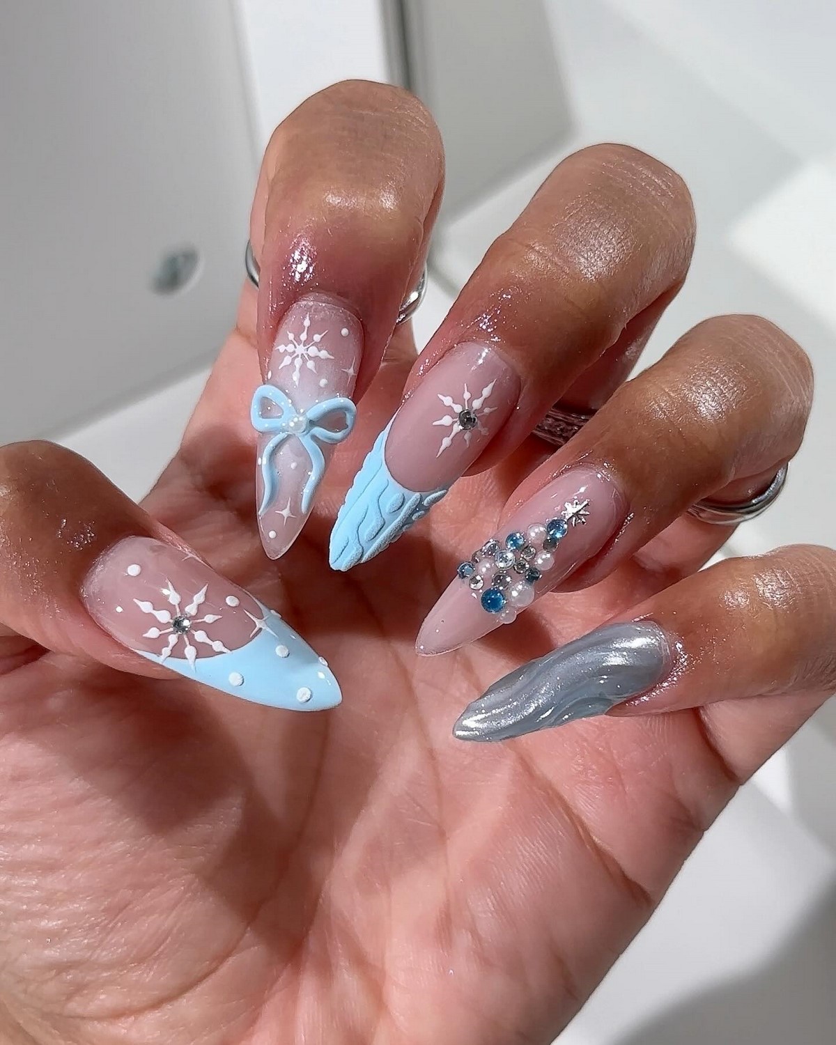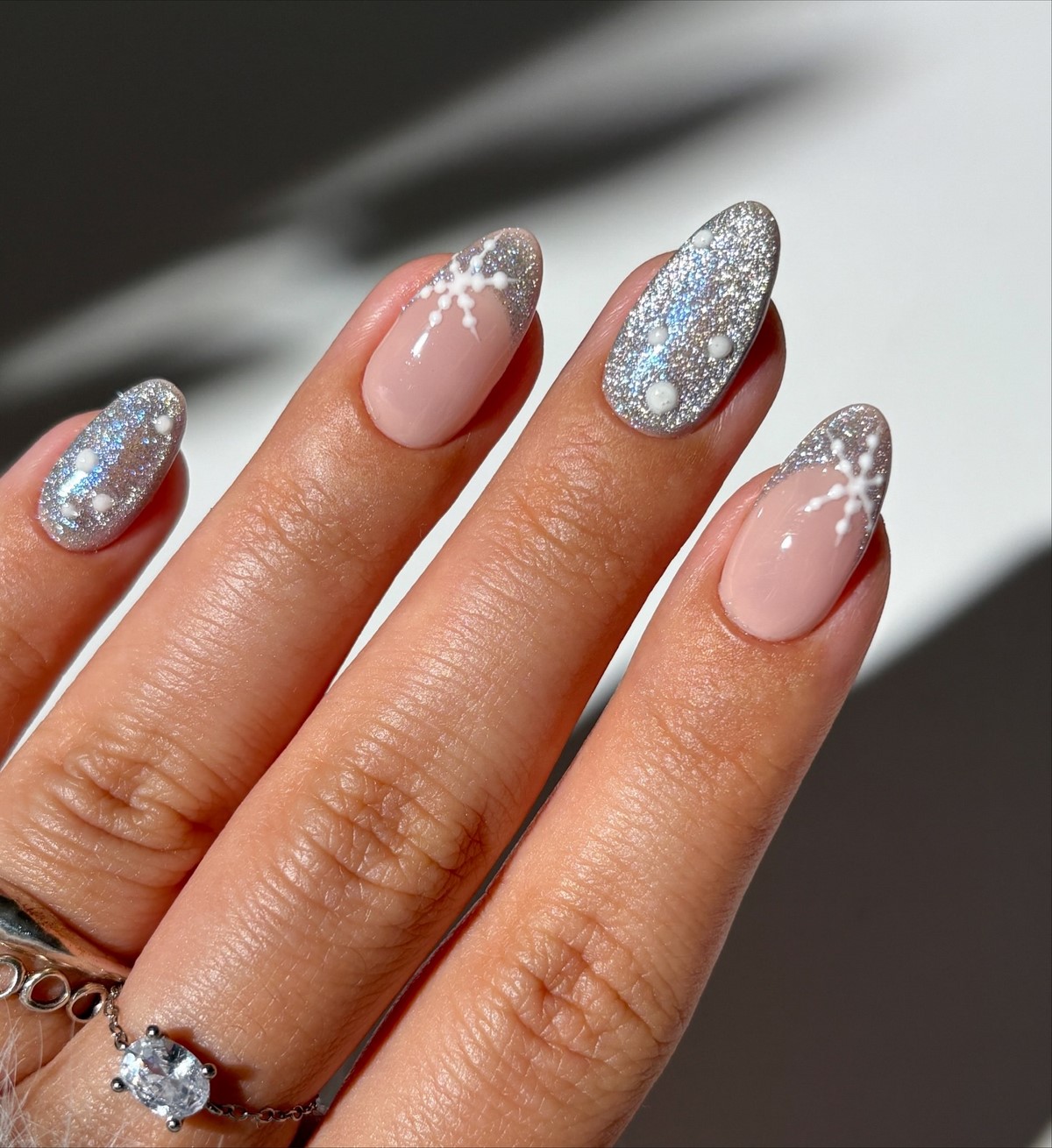 Сияющий френч со снежинками — один из самых популярных новогодних вариантов. Блестящие кончики, переливающиеся оттенки серебра и айс-блю, дополненные миниатюрными снежинками, создают мягкий зимний образ, наполненный легкостью и праздничностью. Этот дизайн легко адаптируется под любую длину ногтей, сохраняя свою воздушность.