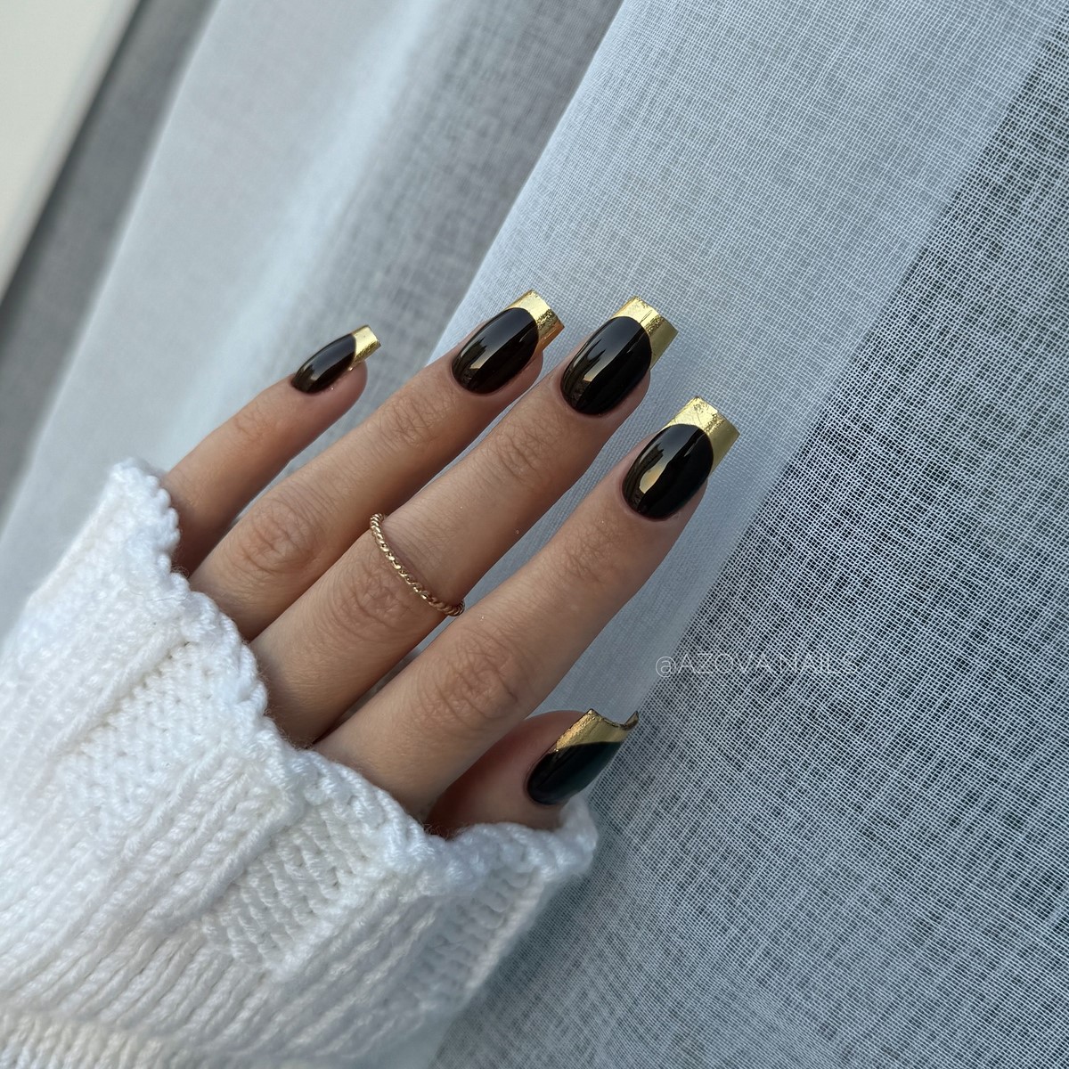 Черный фон и золотая линия френча — один из самых роскошных, драматичных и элитных вариантов новогоднего дизайна. Это сочетание создает эффект ювелирного покрытия, подчеркивая глубину черного оттенка и сияние металлического золота. Такой маникюр выглядит премиально и идеально подходит для новогодних вечеринок, балов и особых случаев.