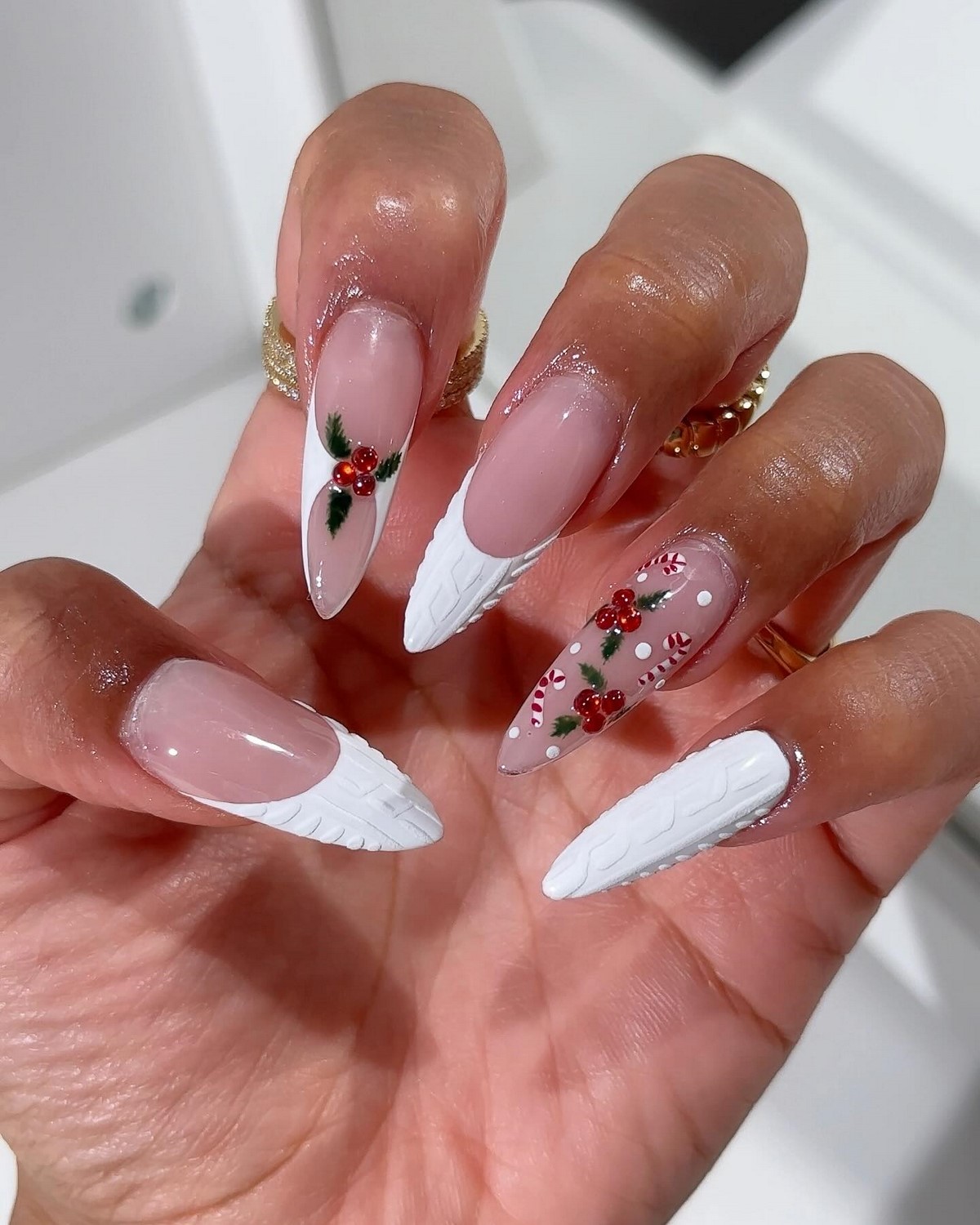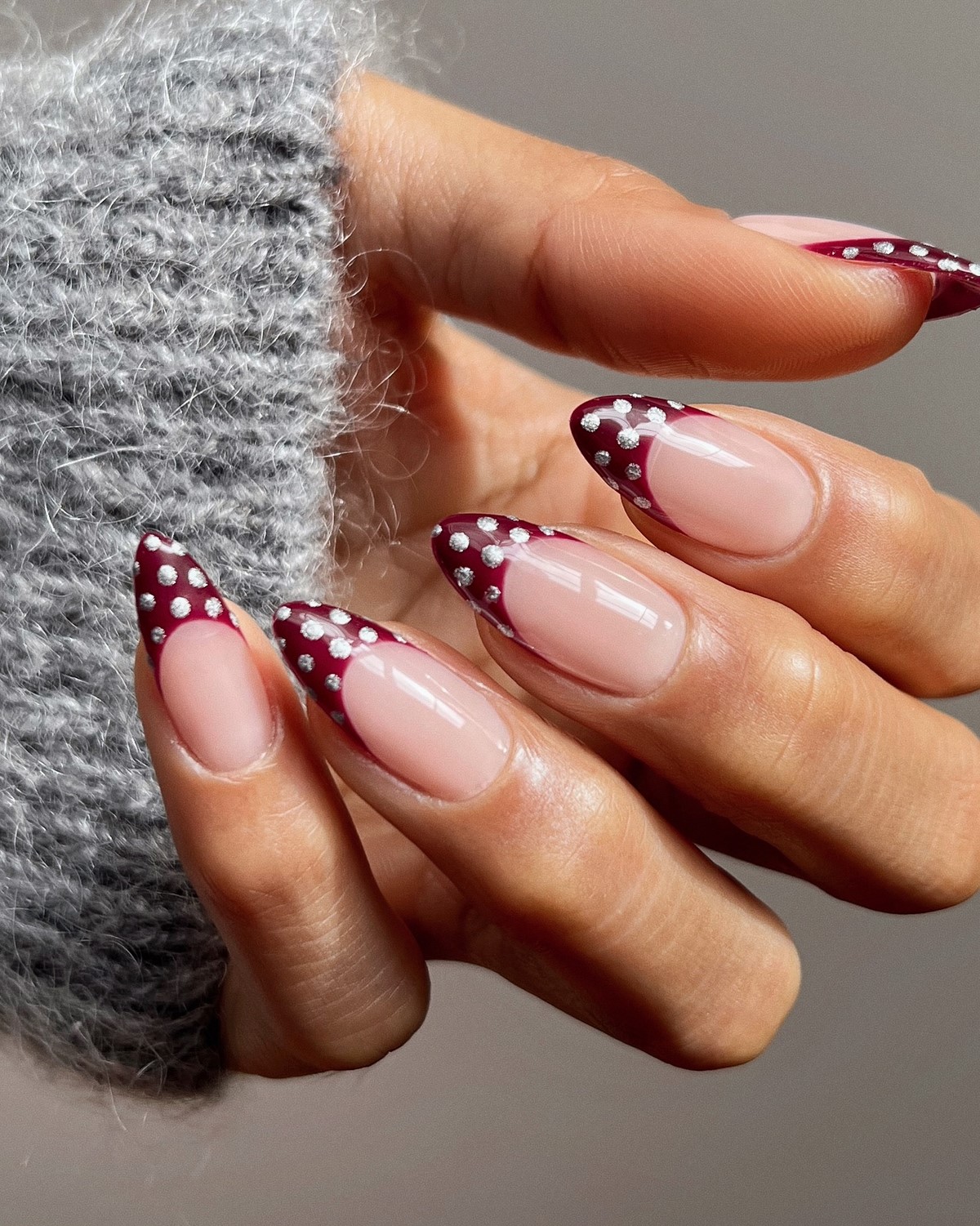 Френч с акцентом Polka Dots — забавный и яркий тренд, который идеально подходит для новогоднего настроения. Мелкие или крупные точки на кончике ногтя, выполненные в белом, серебристом, красном или золотом цвете, создают игривый, праздничный эффект. Такой маникюр может быть как минималистичным, так и насыщенным, в зависимости от плотности точек.