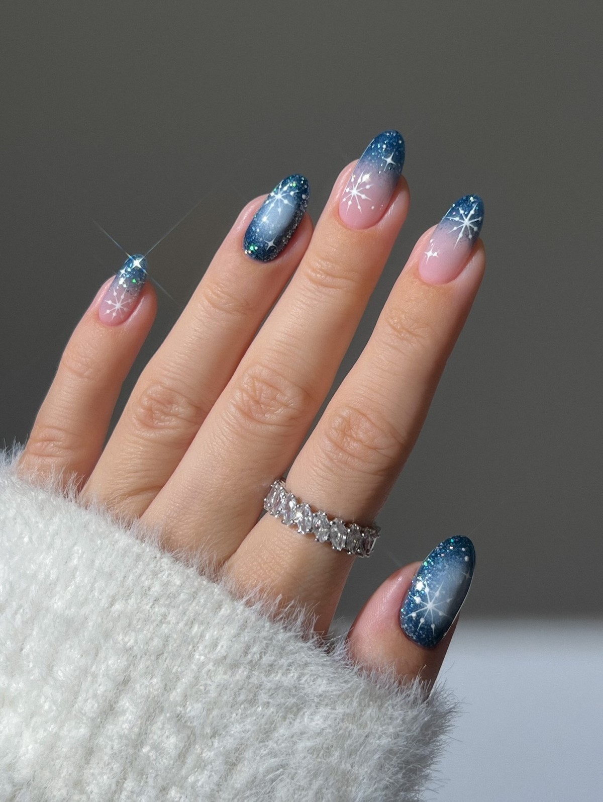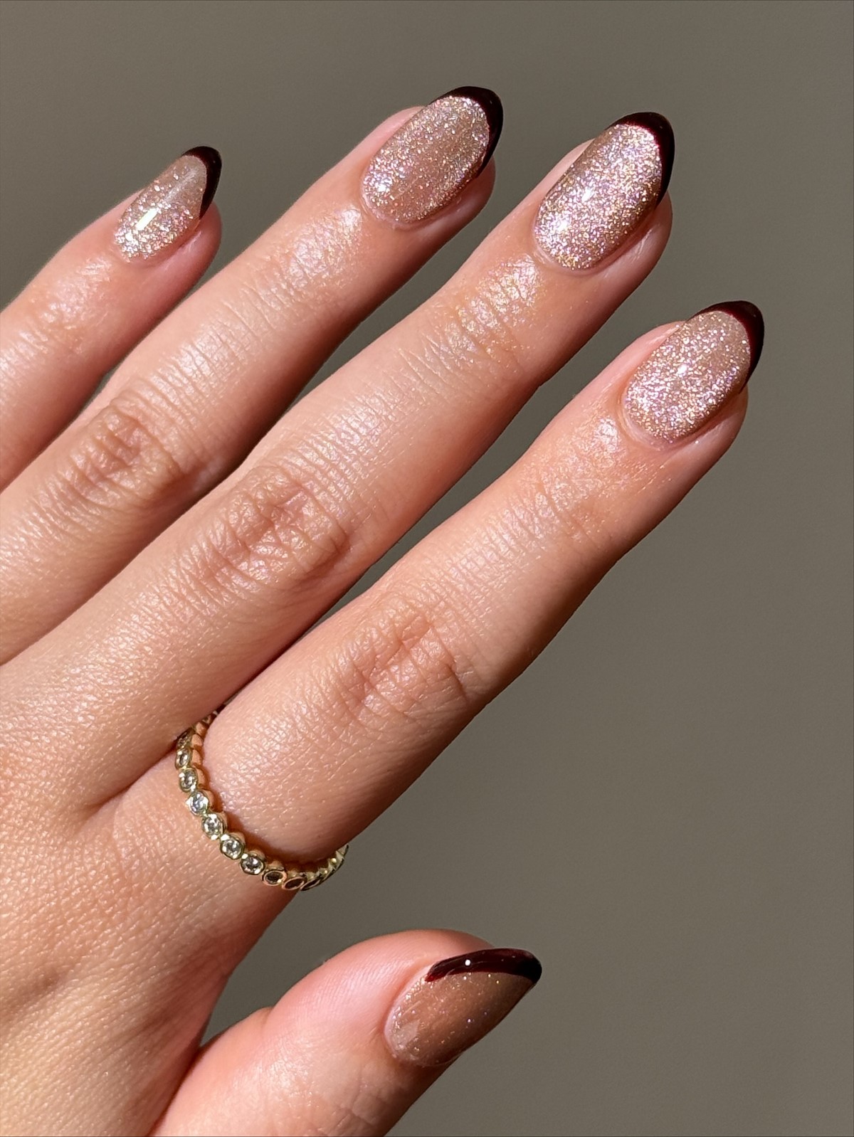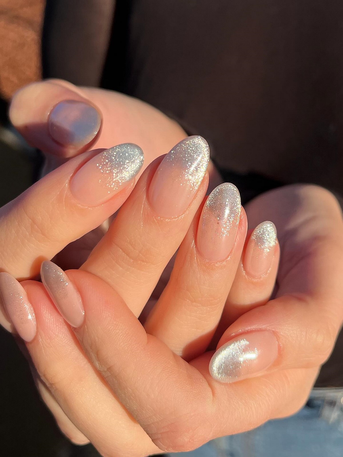 Блестки в январе 2026 выглядят более утонченно, чем в праздничном декабре. Во френче они используются точечно: в виде сияющей линии улыбки, градиента или легкого рассеянного свечения. Особенно актуальны мелкие шиммерные частицы, создающие эффект инея.