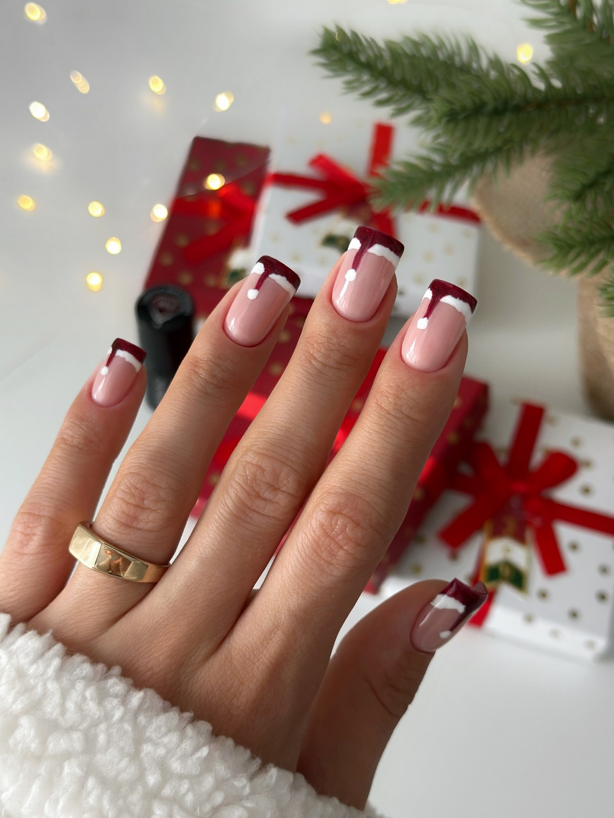 Такой френч особенно красиво смотрится при матовой базе или приглушенном сатиновом покрытии. Бархатный эффект добавляет ногтям объем и идеально подчеркивает зимний характер маникюра, создавая ощущение уюта и тепла.