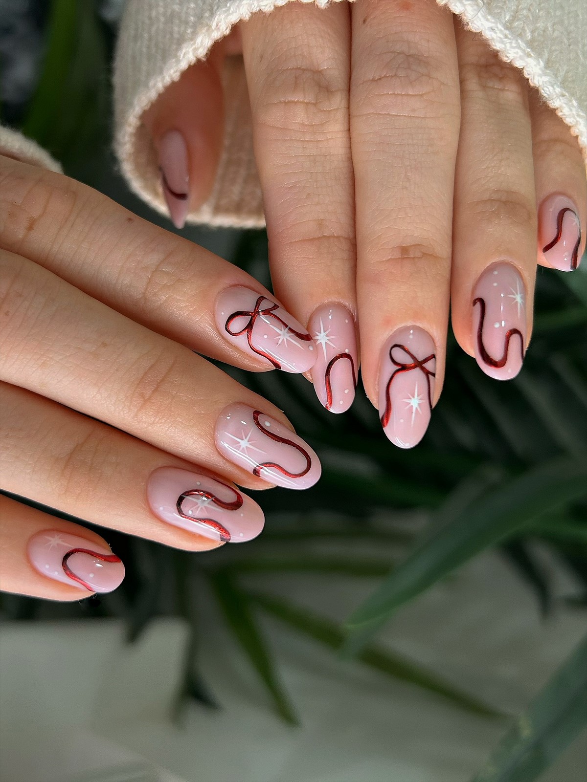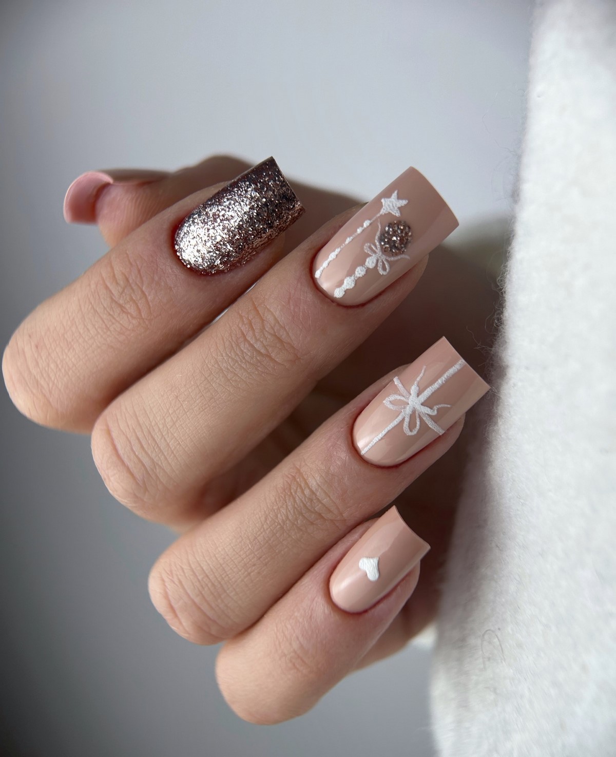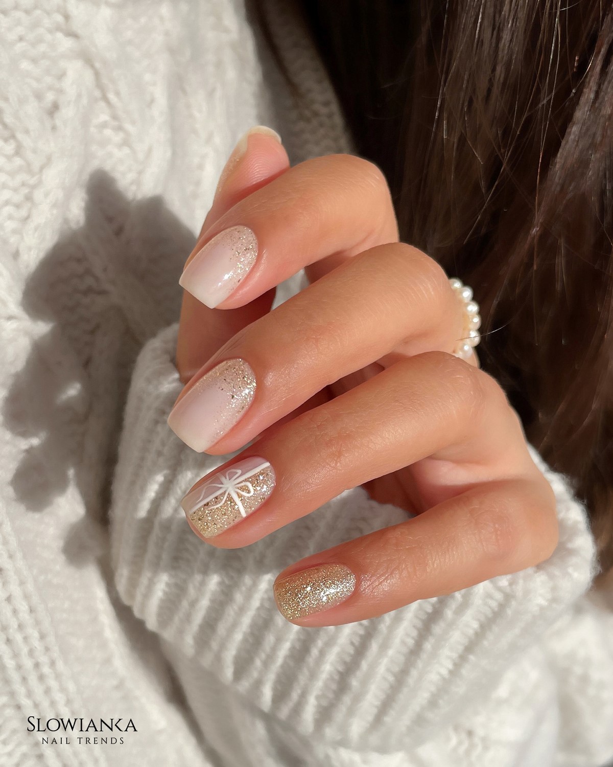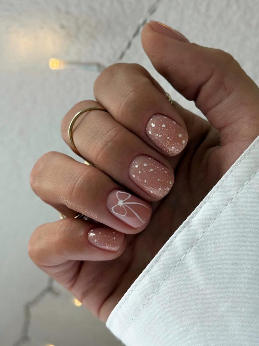 Игривые акценты в виде миниатюрных бантиков и изящных ленточек превращают классический нюд в романтичный зимний нейл-арт. Эти элементы можно выполнить как объемными, используя гель-лак, так и декоративными наклейками для более быстрого результата. Звездочки добавляют маникюру праздничного настроения, особенно актуального в предновогодний период — их можно разместить хаотично или создать изящное созвездие на одном-двух акцентных ногтях.