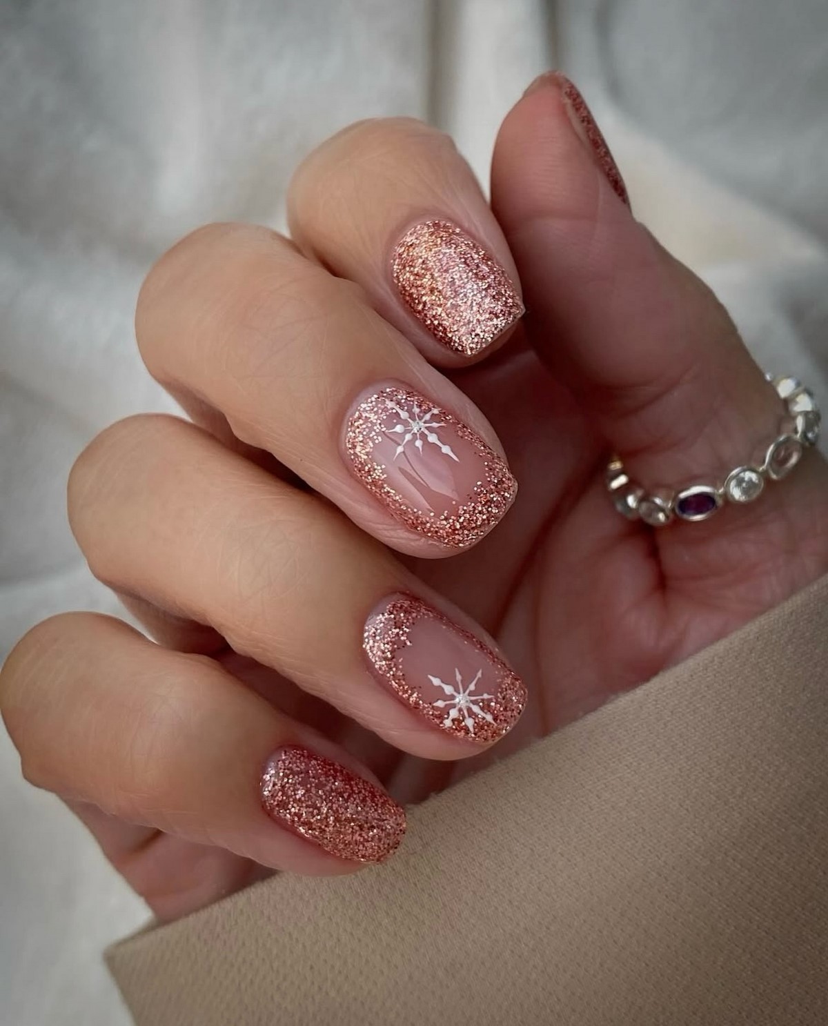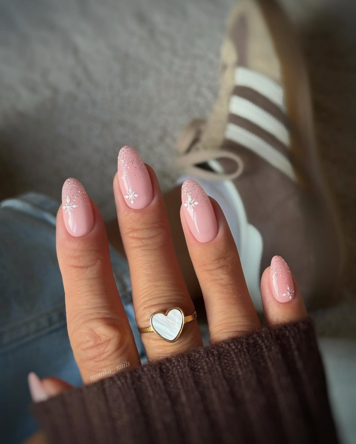 Мерцающие частицы на нюдовой основе создают эффект заснеженного покрытия, идеально вписывающийся в зимнюю эстетику. Трендом сезона становится деграде из блесток — когда мерцание концентрируется у кутикулы или на кончиках ногтей, создавая мягкий переход. Особенно популярны серебристые и золотистые микроблестки, которые добавляют маникюру благородного сияния, не перегружая образ.