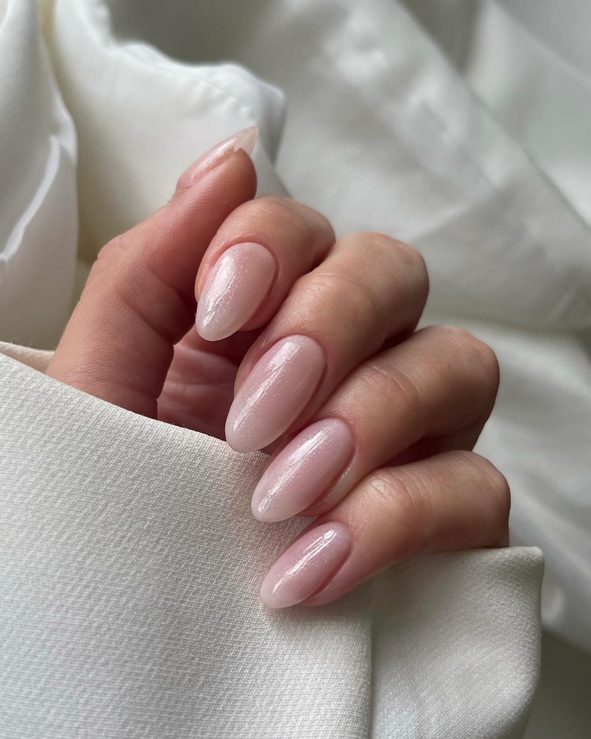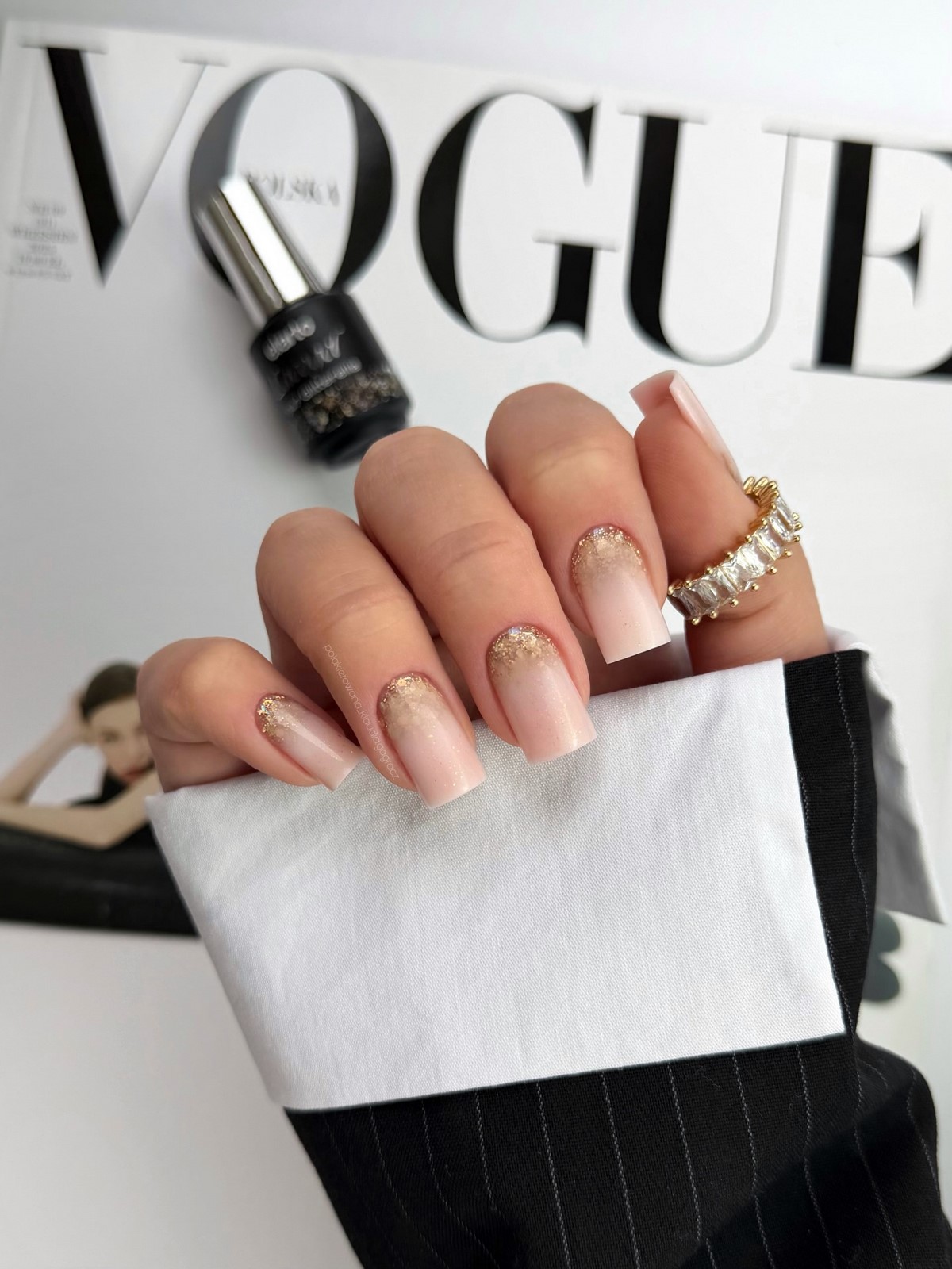Важно: Блестки на нюдовой основе должны быть деликатными — выбирайте мелкие частицы или глиттер с тонким помолом, чтобы сохранить элегантность и изысканность покрытия, характерную для нюд-маникюра.