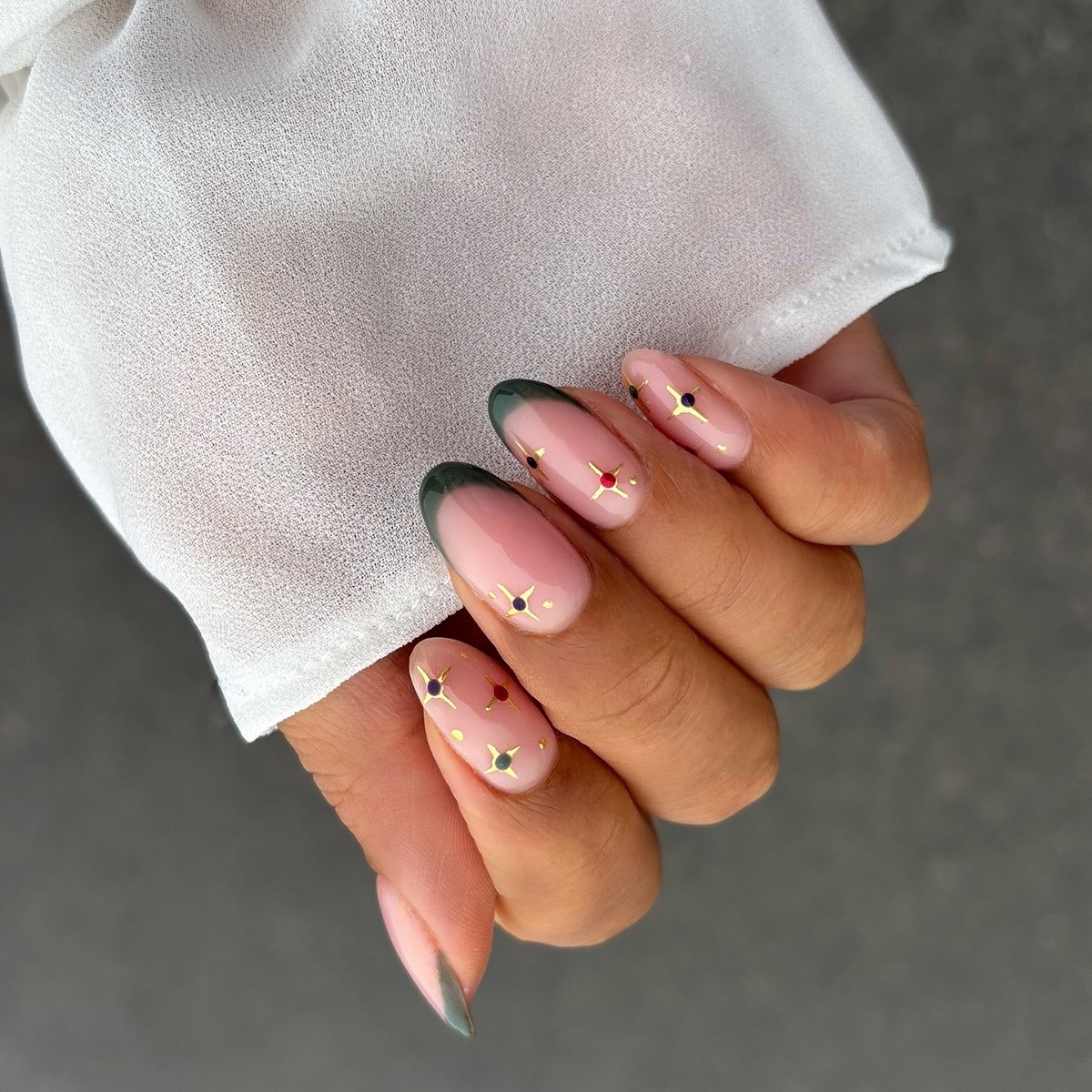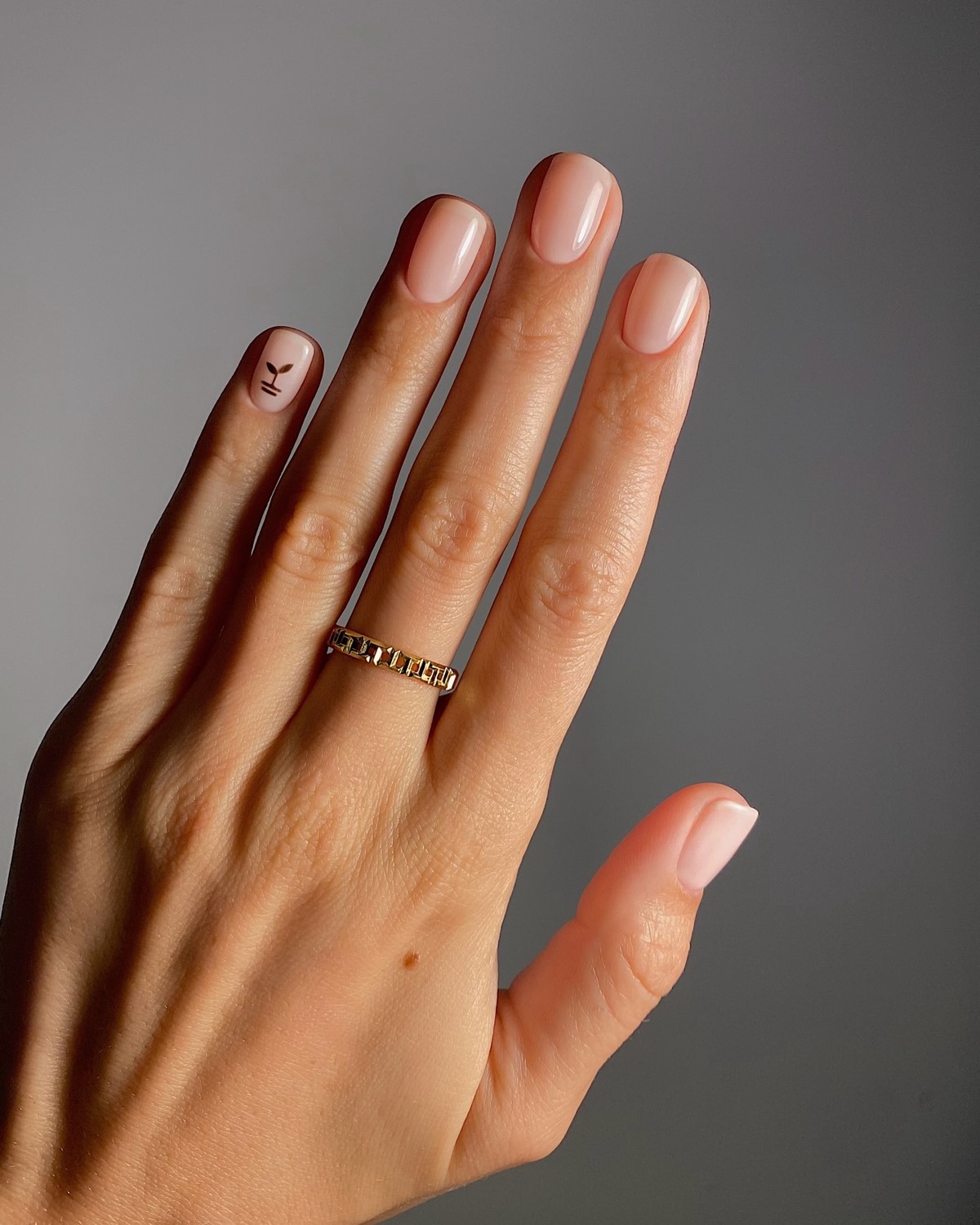 Чистые линии, точечные акценты и геометрические фигуры минимального размера продолжают доминировать в трендах нюд-маникюра. Тонкие золотые или черные полоски, едва заметные точки или единичный акцент в виде крошечного сердечка делают маникюр завершенным, но ненавязчивым. Этот вариант идеален для делового стиля и тех, кто предпочитает сдержанность в образе, но не хочет отказываться от актуальных тенденций.