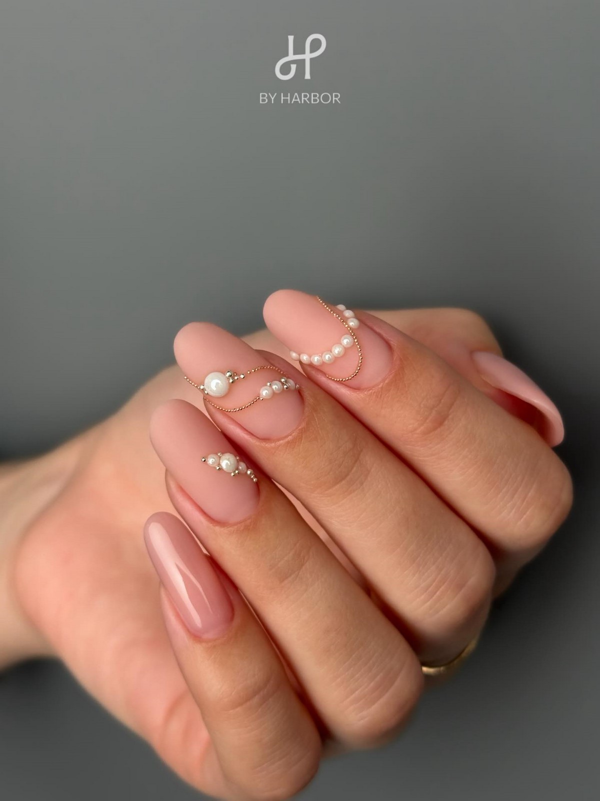 Объемный декор возвращается в тренды, но в более изящном исполнении — миниатюрные жемчужины и перламутровые бусины размещаются точечно, создавая эффект россыпи драгоценностей. Этот вариант идеален для вечерних выходов и особых случаев, когда хочется добавить образу роскоши и женственности. Жемчуг можно комбинировать с золотыми элементами или располагать в линию вдоль кутикулы для создания эффекта драгоценной оправы.
