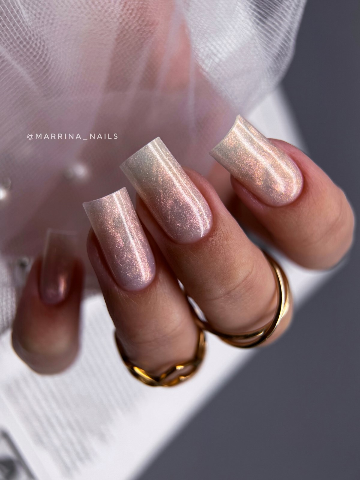 Эффект кошачьего глаза на нюдовой базе создает глубину и магнетическое мерцание, которое особенно выигрышно смотрится в холодное время года. Переливы могут быть выполнены в классической золотисто-коричневой гамме или в более холодных серебристо-серых тонах для зимнего настроения. Техника Cat Eye добавляет покрытию объем и динамику, превращая простой нюд в настоящее произведение нейл-арта с трехмерным эффектом.