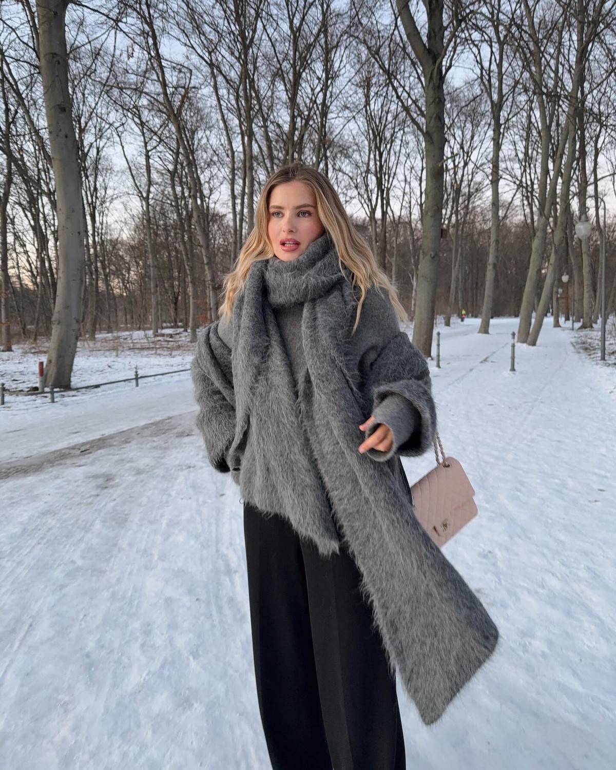 Серый идеально подчеркивает сложные зимние материалы — кашемир, альпака, шерсть букле. Образ сразу выглядит дороже и технологичнее.
