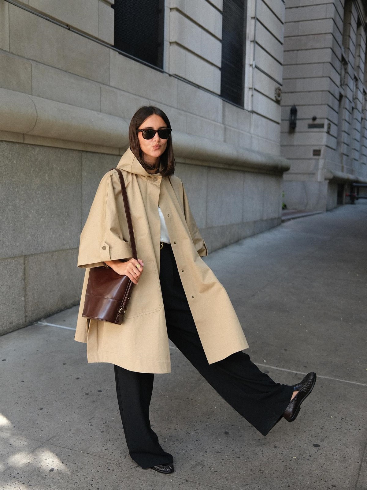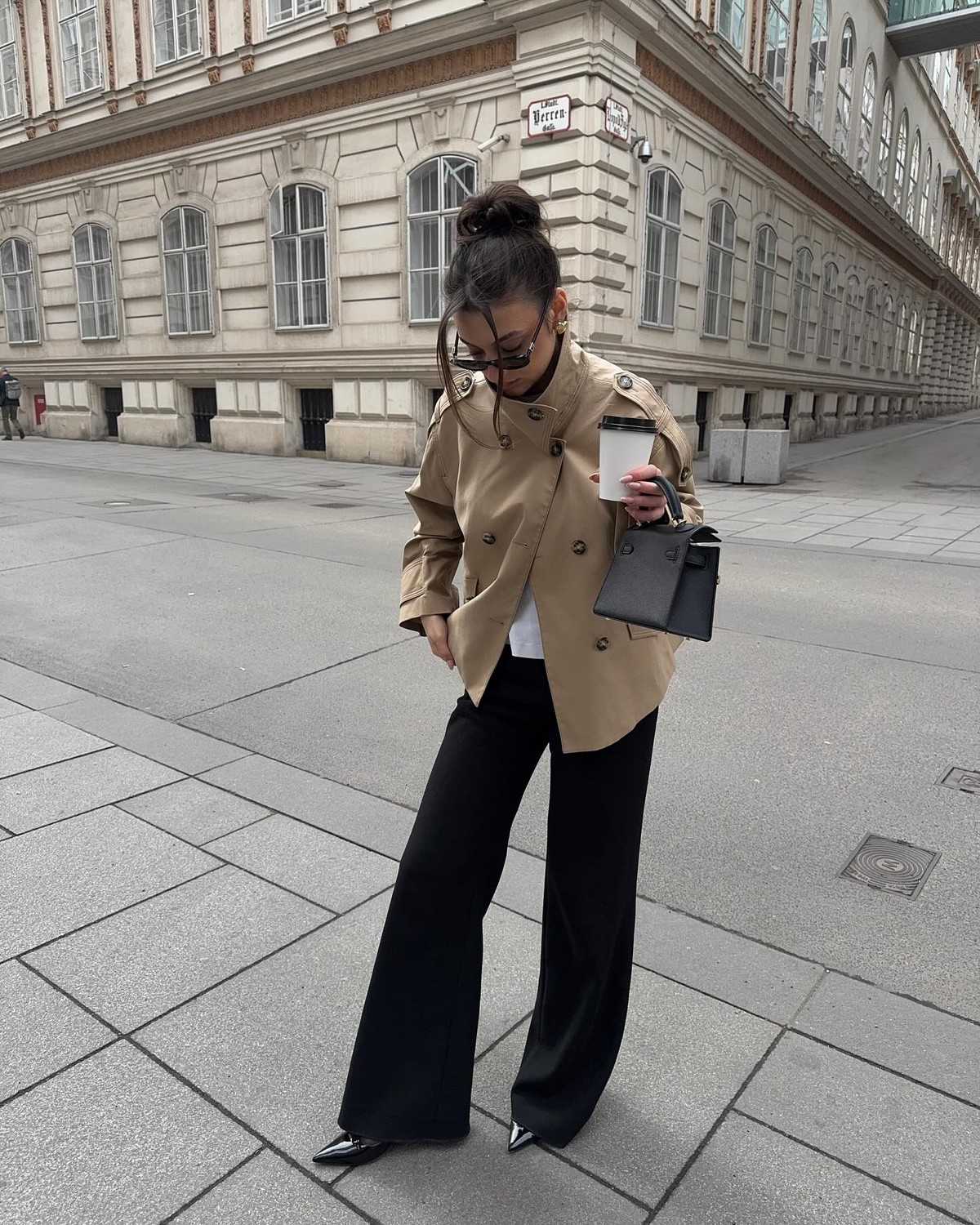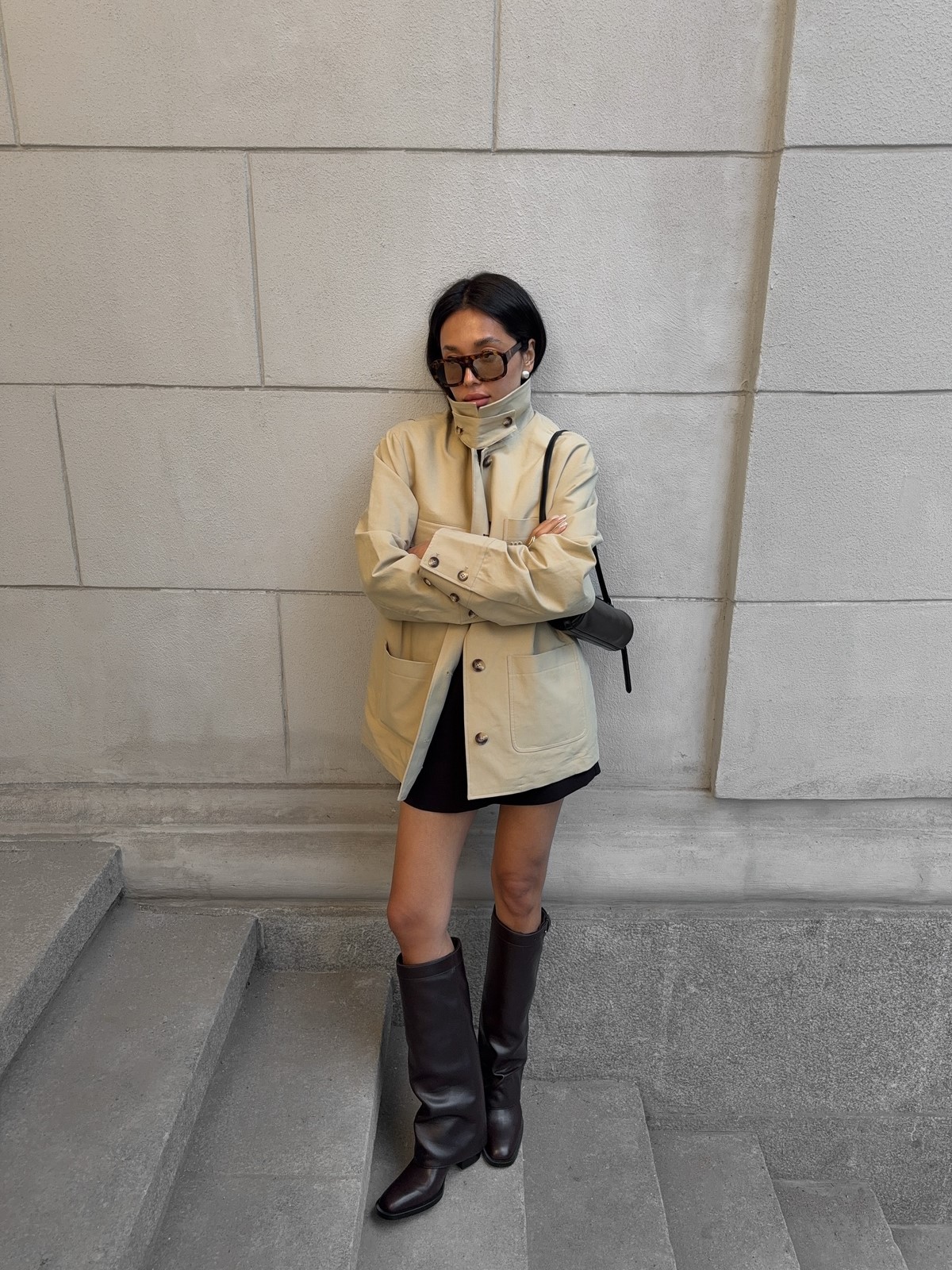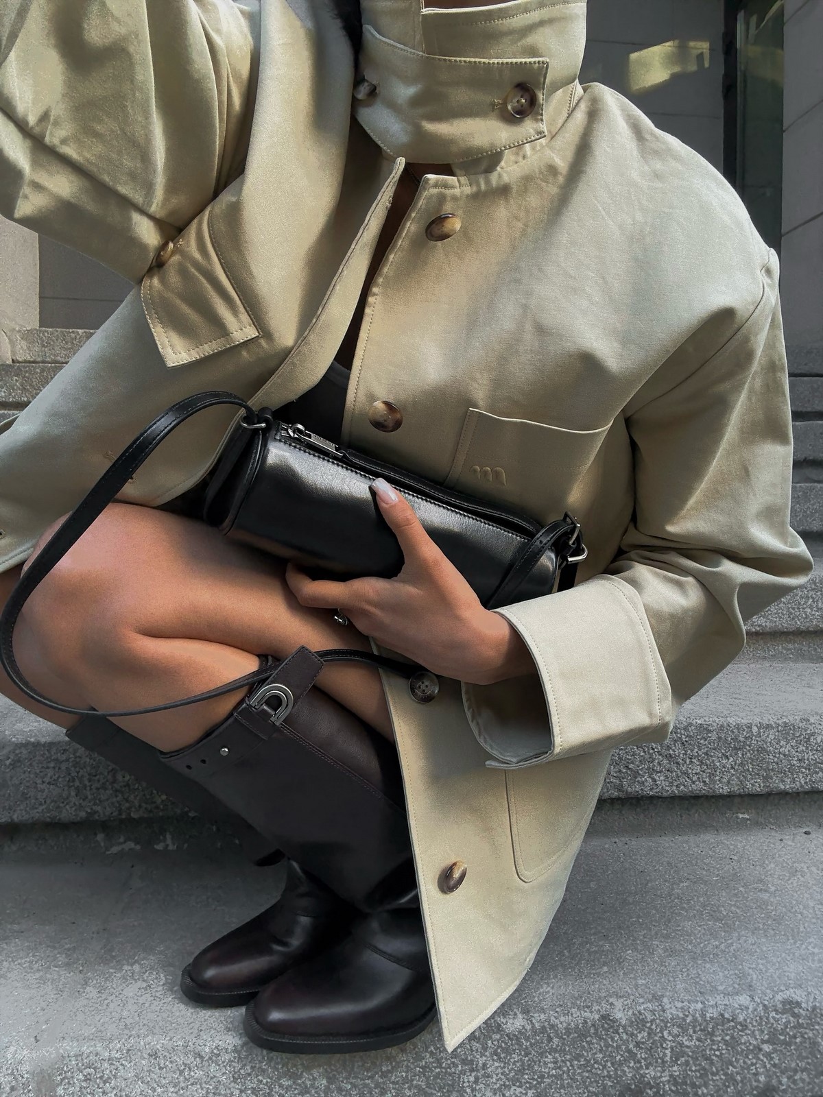Мини-длина привычного тренча придает ему свежесть. Он легко сочетается с юбками и брюками, открывает обувь и подчеркивает многослойность. Укороченный тренч — находка для межсезонья.