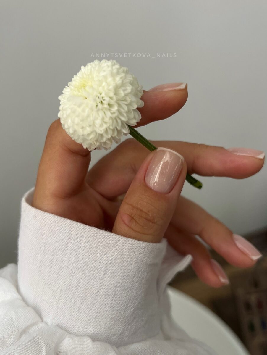 Перламутровое полупрозрачное покрытие создает эффект внутреннего свечения ногтей. Оно красиво переливается при разном освещении и делает руки визуально более ухоженными. Такой вариант отлично смотрится без дополнительного декора, подчеркивая текстуру и чистоту цвета.