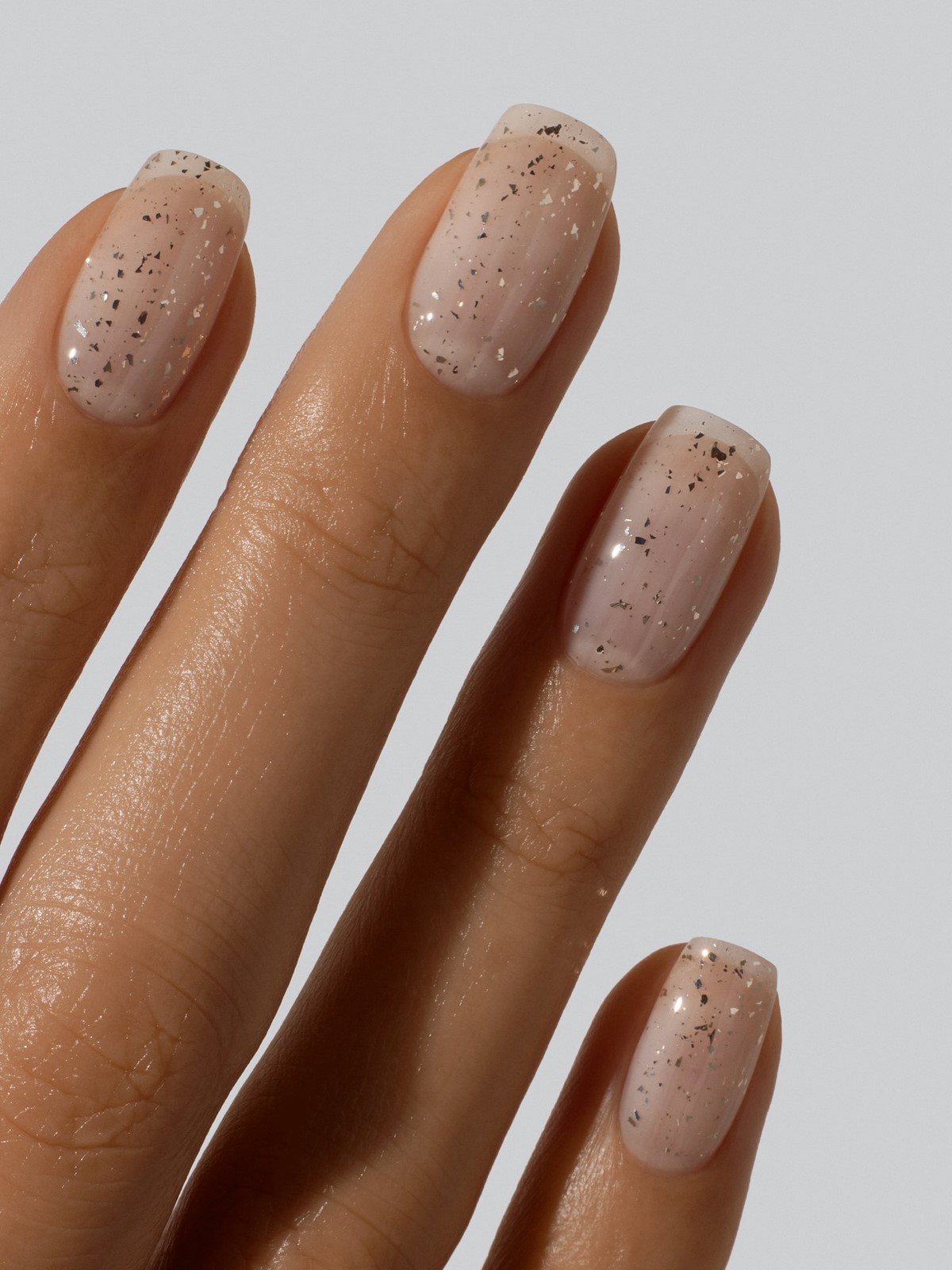 Полупрозрачная база с микроблестками смотрится нежно и деликатно. Блестки могут быть едва заметными, создавая эффект снежного сияния. Такой маникюр отлично подходит для зимних праздников и при этом остается сдержанным и стильным.