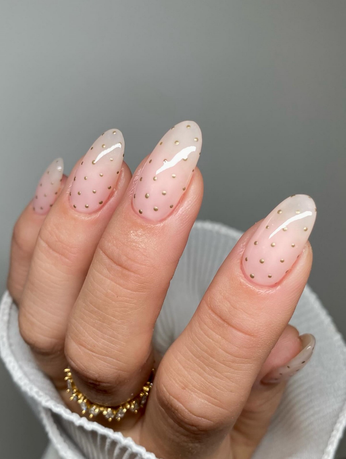 ИНТЕРЕСНО: золотой горошек особенно красиво смотрится на коротких и средних ногтях миндальной формы, подчеркивая чистоту дизайна.