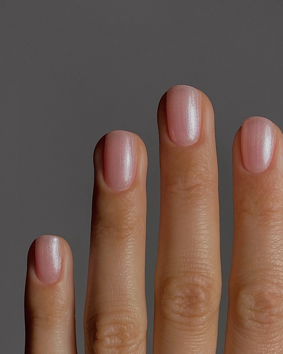 Перламутровое полупрозрачное покрытие создает эффект внутреннего свечения ногтей. Оно красиво переливается при разном освещении и делает руки визуально более ухоженными. Такой вариант отлично смотрится без дополнительного декора, подчеркивая текстуру и чистоту цвета.