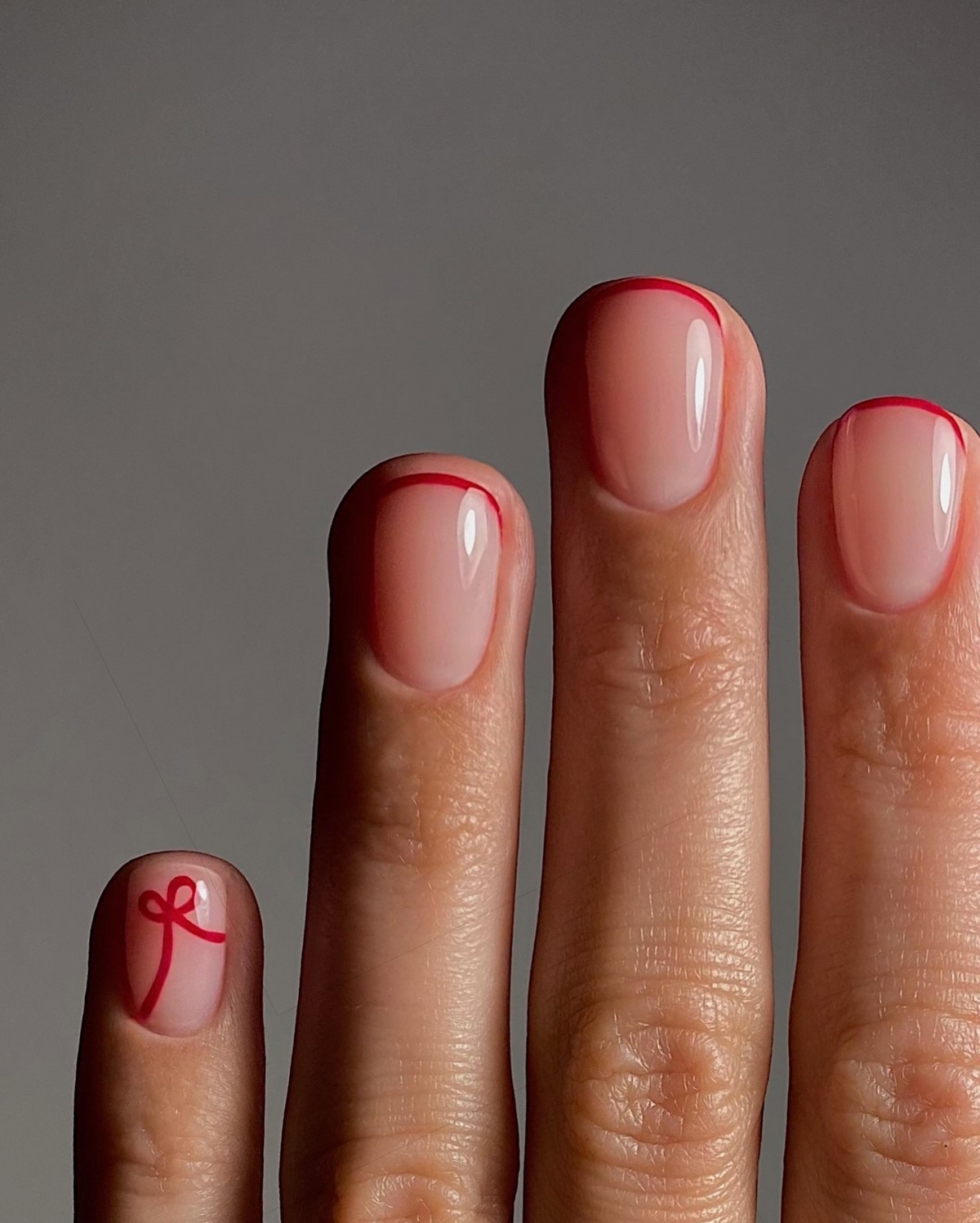 Зимний френч на полупрозрачной базе приобретает новое звучание. Вместо классической белой линии используются молочные, серебристые или едва заметные блестящие оттенки. Такой френч выглядит современно и легко вписывается в зимний гардероб.