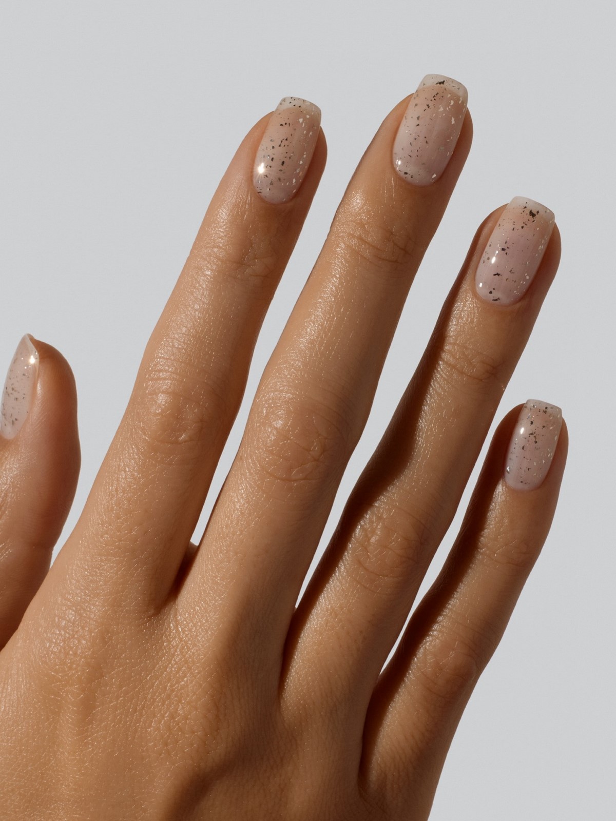 Полупрозрачная база с микроблестками смотрится нежно и деликатно. Блестки могут быть едва заметными, создавая эффект снежного сияния. Такой маникюр отлично подходит для зимних праздников и при этом остается сдержанным и стильным.