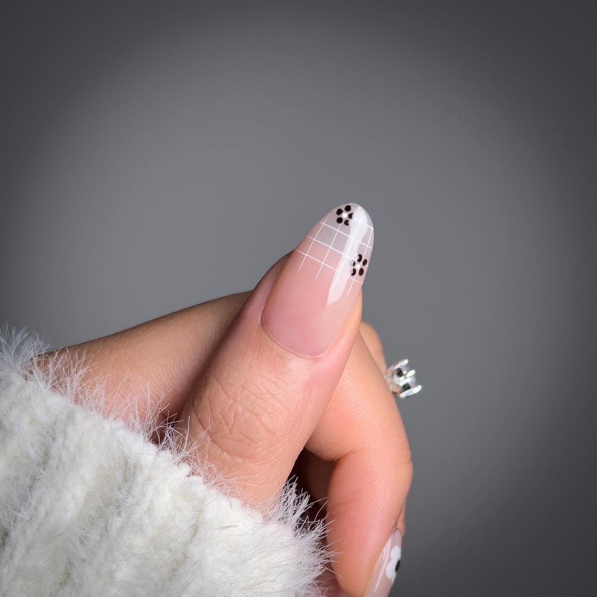 Минималистичные точки у кутикулы на полупрозрачном фоне стали настоящим фаворитом для коротких ногтей. Такой дизайн визуально вытягивает ногтевую пластину и выглядит очень аккуратно. Цвет точек может быть молочным, серебристым или нюдовым, поддерживая общую спокойную эстетику.