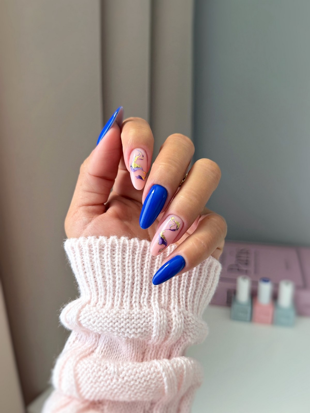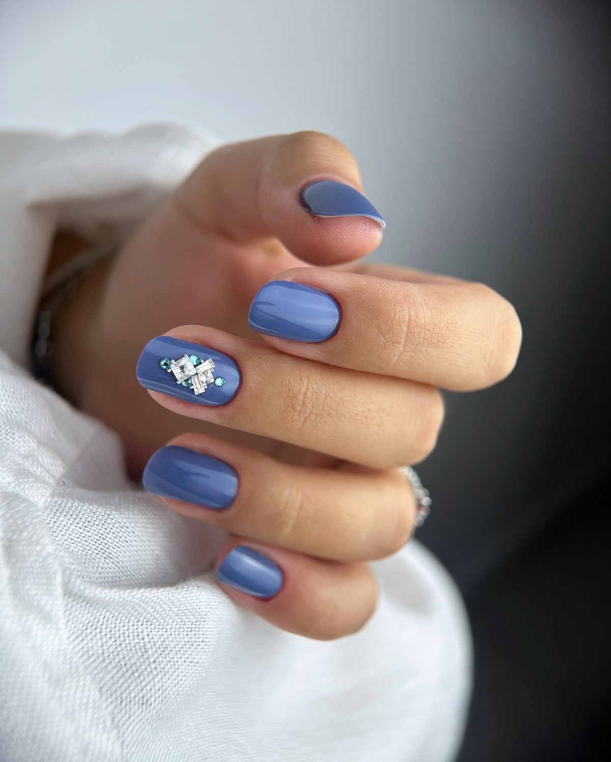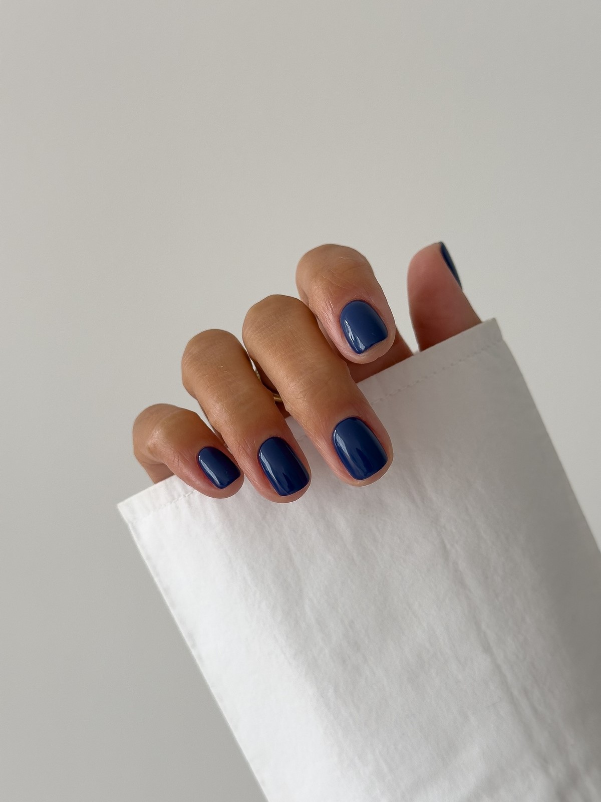 Синий — это цвет уверенности и спокойствия. В октябре особенно актуальны глубокие матовые и глянцевые покрытия, дополненные минималистичным декором. Такой маникюр подходит как для деловых встреч, так и для вечерних выходов.
