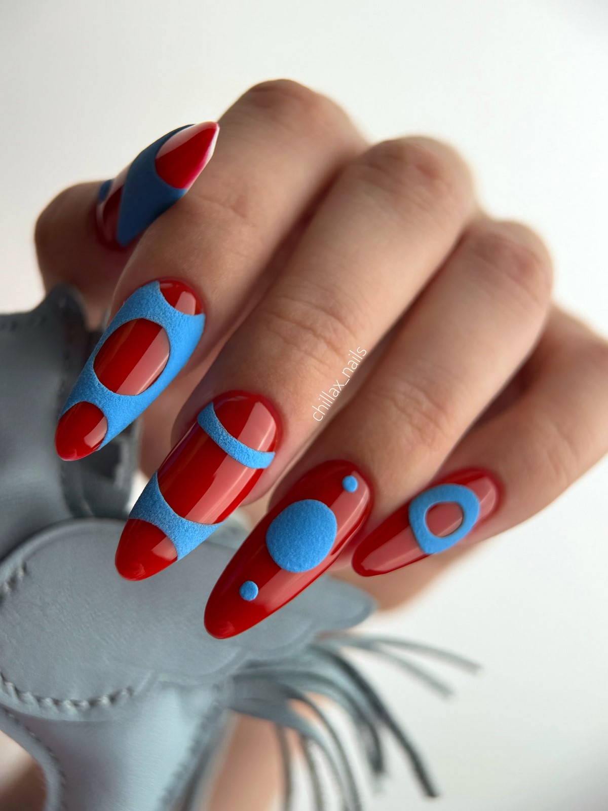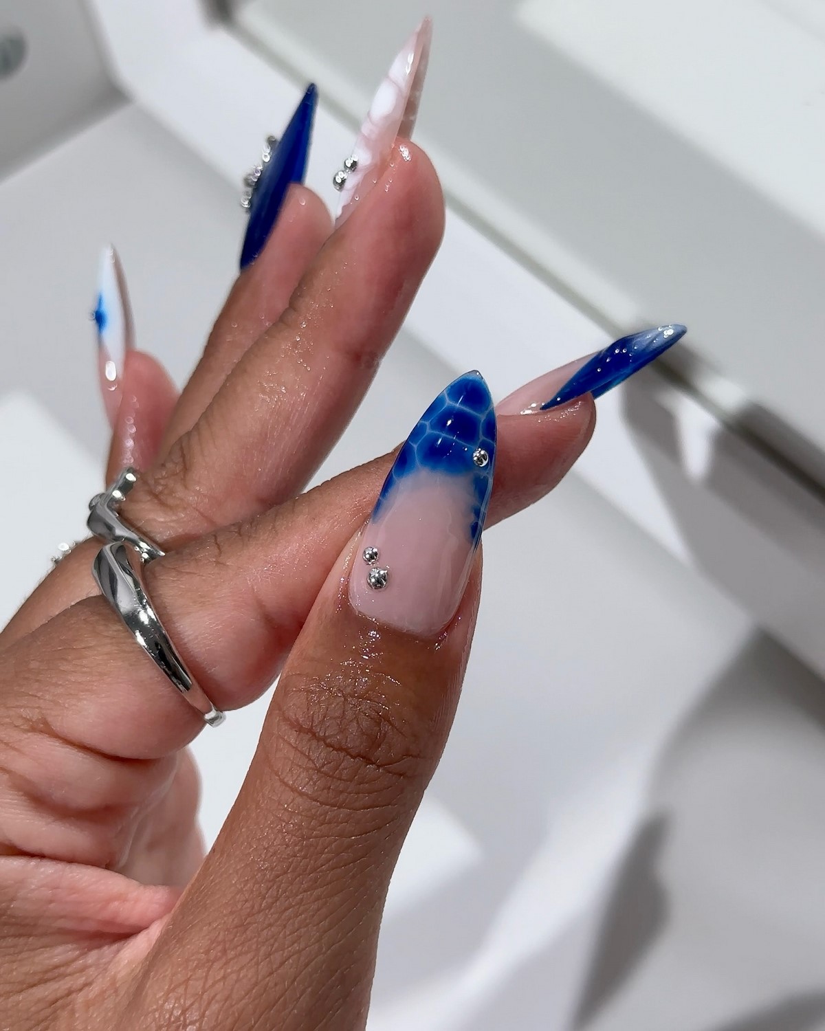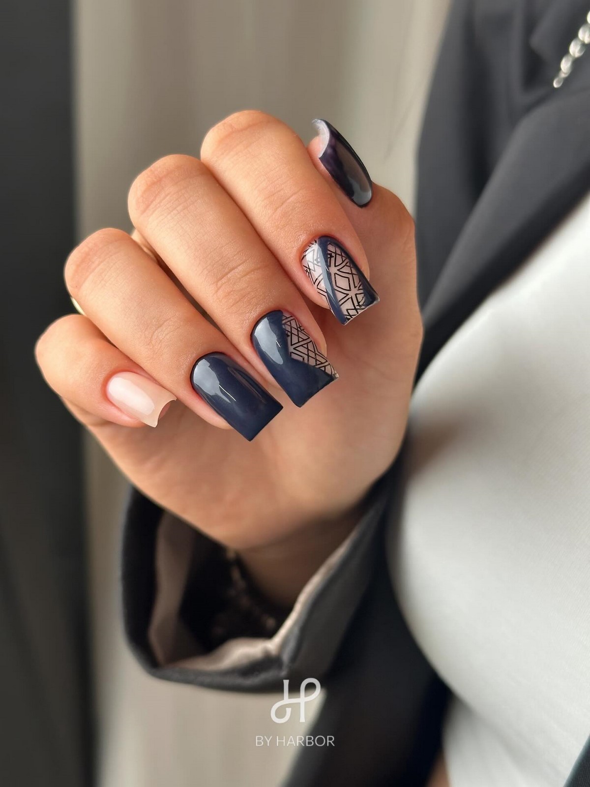 Синий — это цвет уверенности и спокойствия. В октябре особенно актуальны глубокие матовые и глянцевые покрытия, дополненные минималистичным декором. Такой маникюр подходит как для деловых встреч, так и для вечерних выходов.
