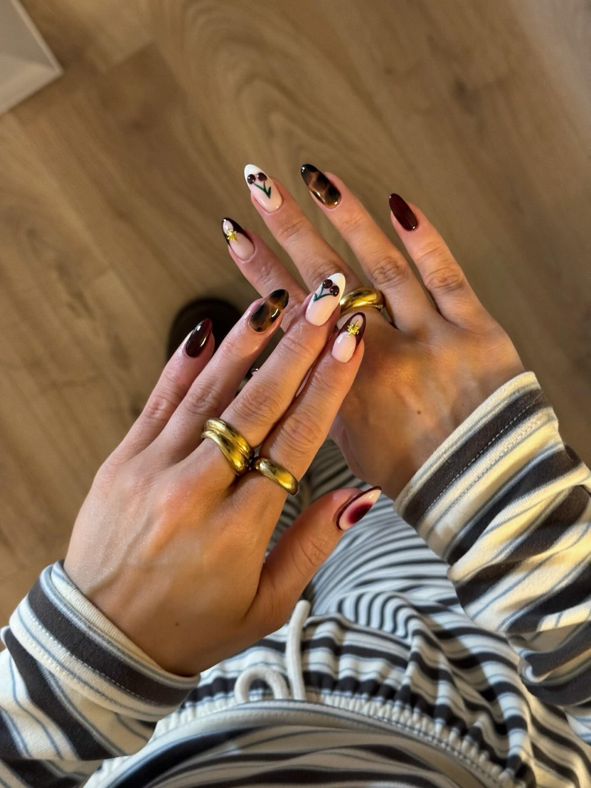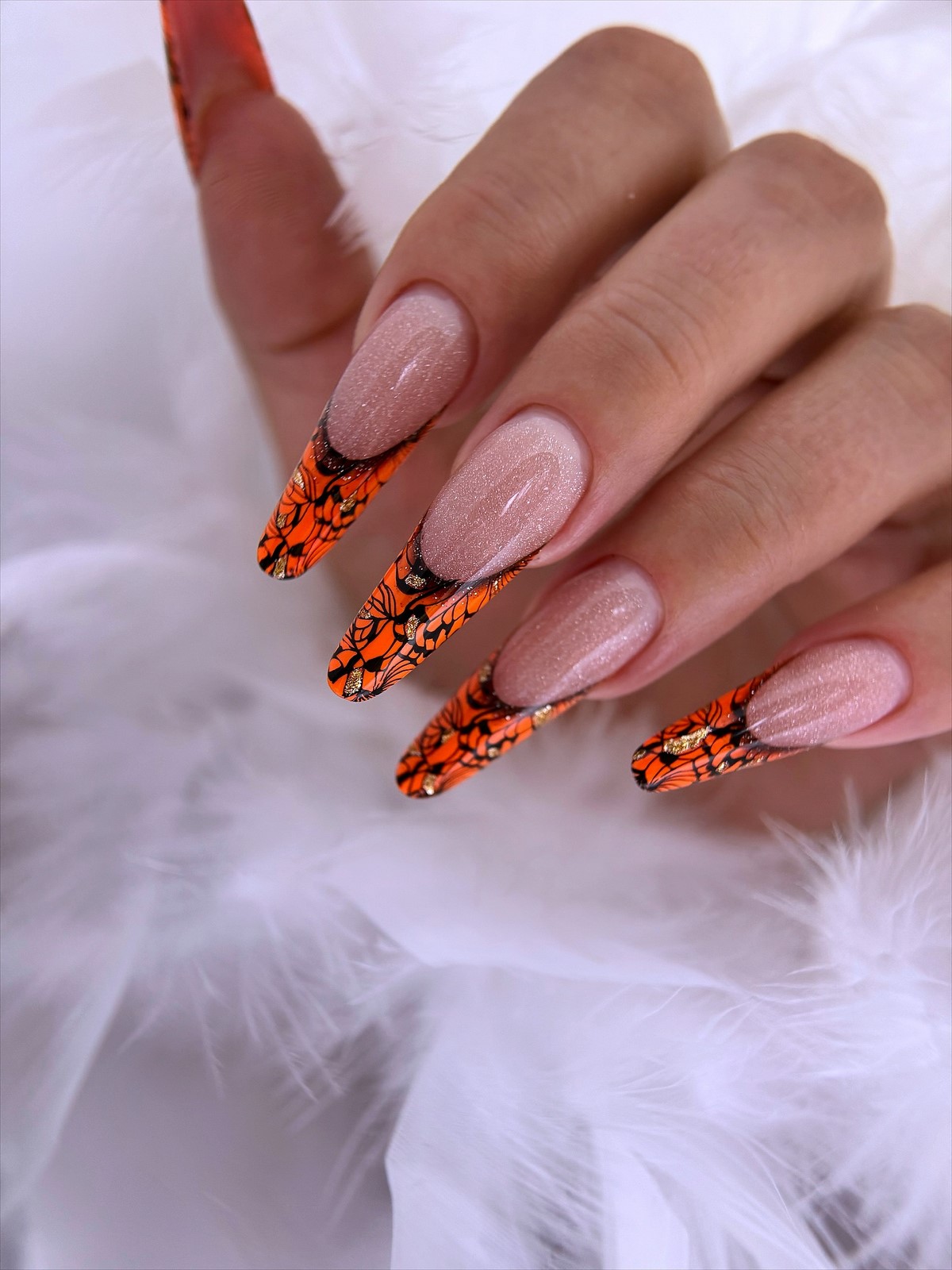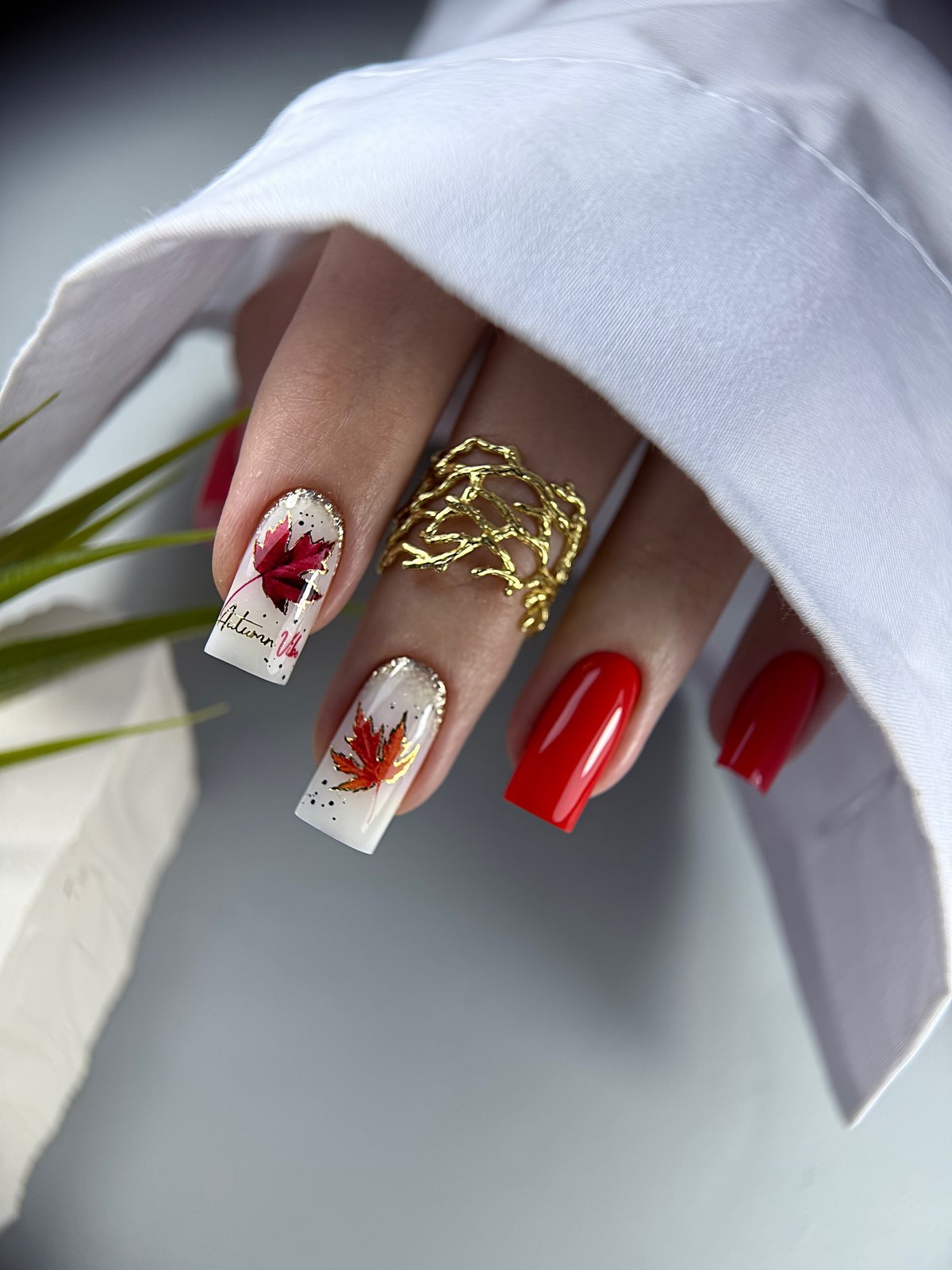 Октябрьский nail-дизайн 2025 года отличается многослойностью и сложностью исполнения. Главной особенностью становится комбинирование различных техник в одном дизайне: матовые покрытия сочетаются с глянцевыми элементами, а негативное пространство дополняется объемными деталями. Актуальными приемами становятся градиентные переходы, имитирующие осенние закаты, и техника «floating» – создание эффекта парящих в воздухе декоративных элементов.