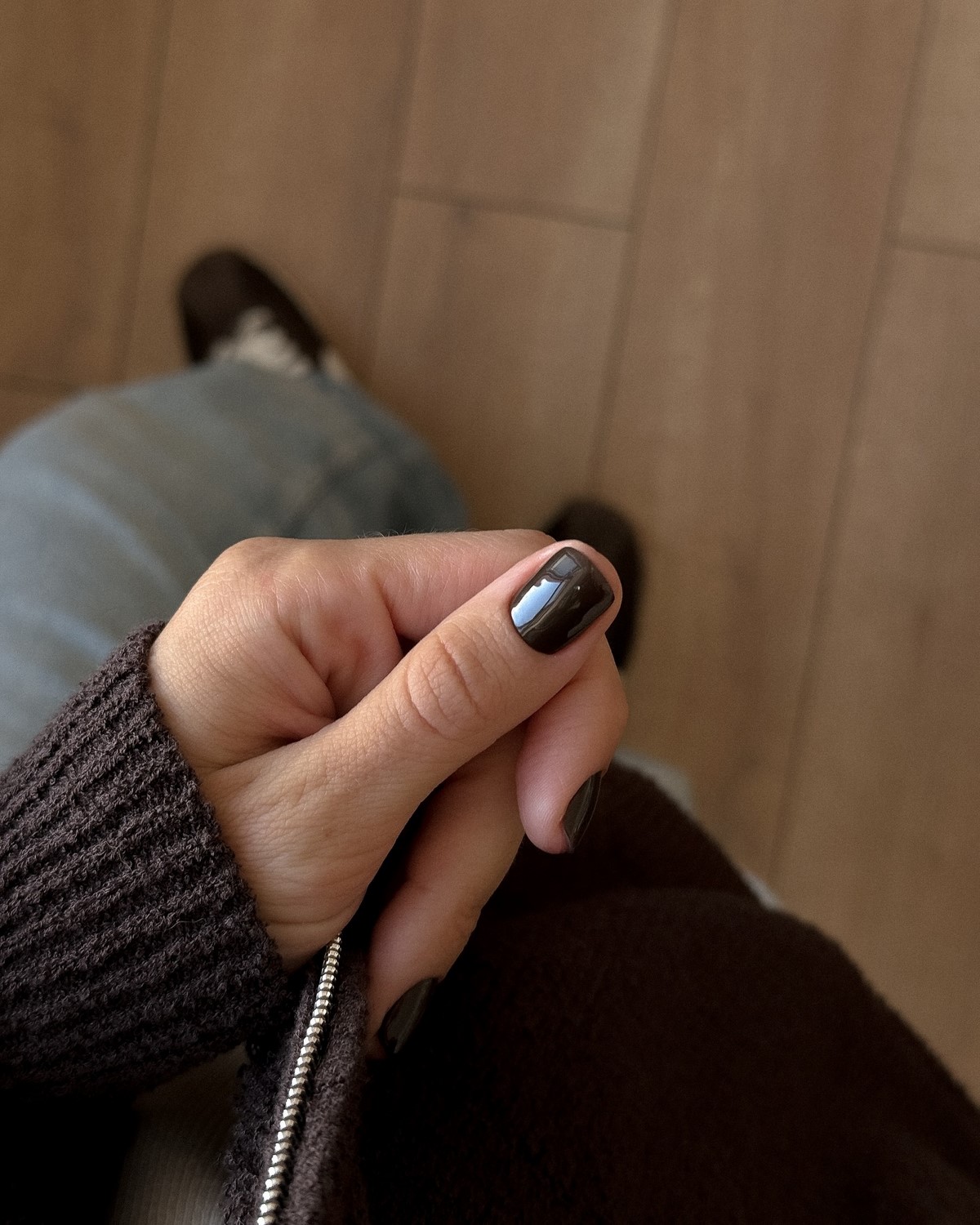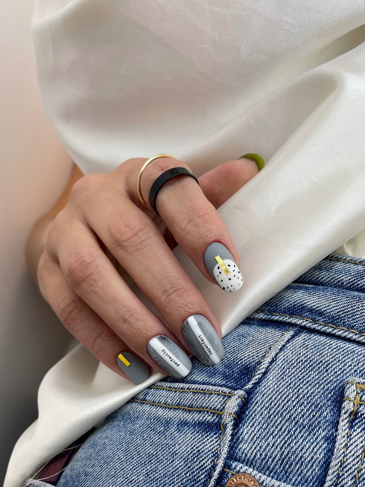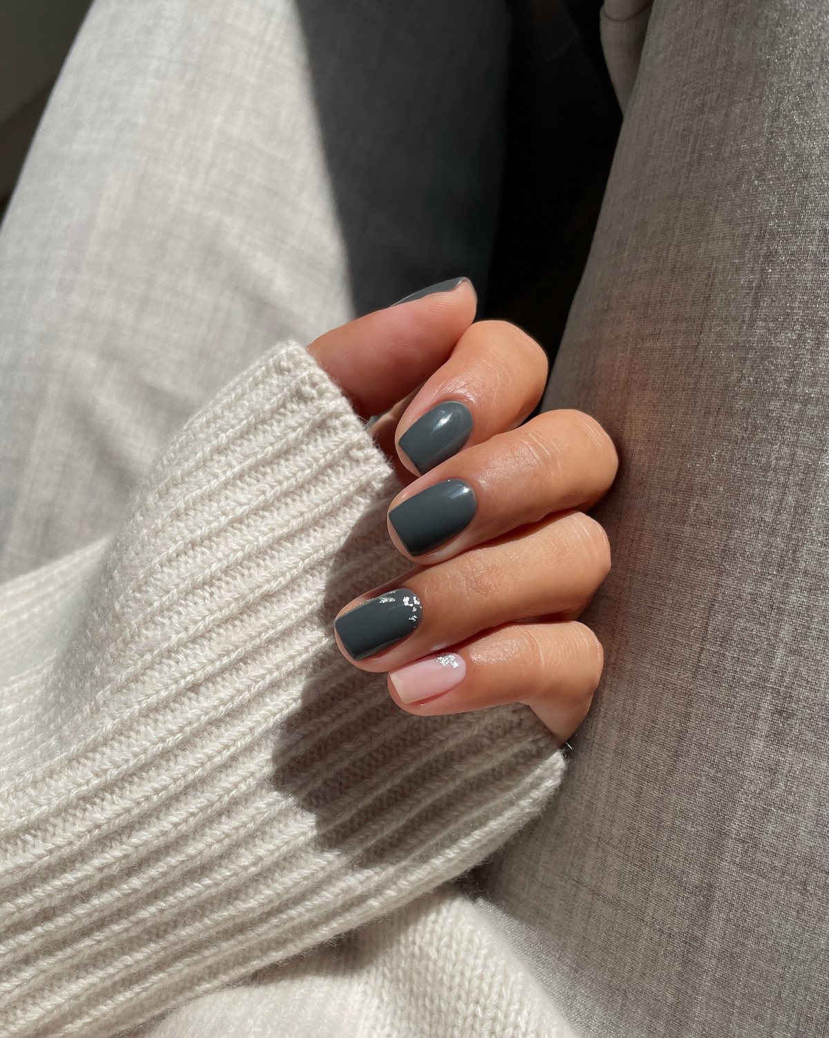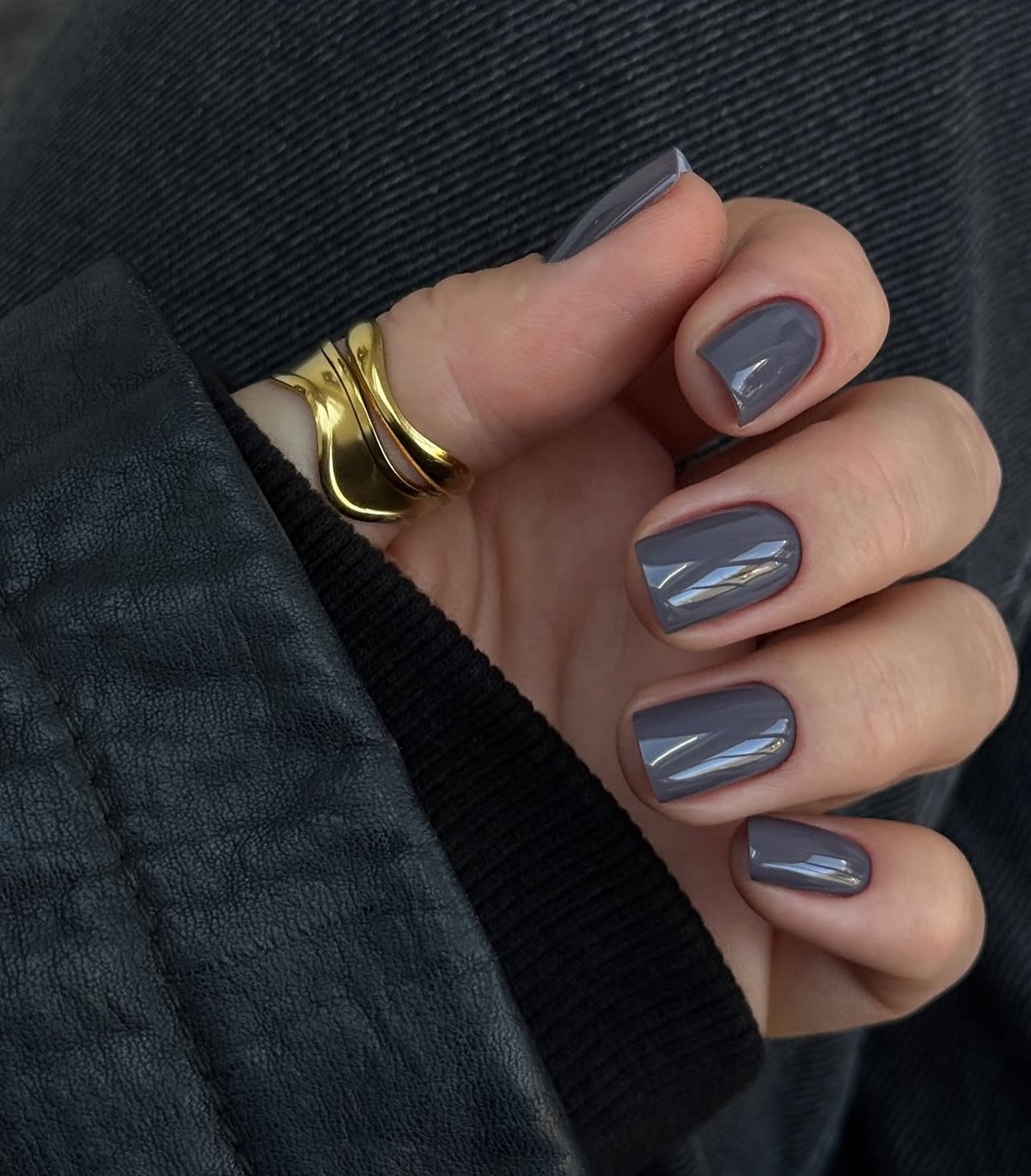 Сдержанный и универсальный оттенок, который в октябре 2025 получает новое звучание. Серый в матовой текстуре выглядит стильно и минималистично, а с добавлением блесток или страз — празднично. Такой маникюр подойдет для любых случаев.