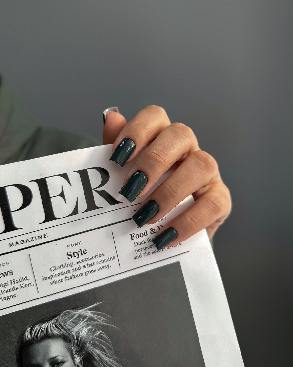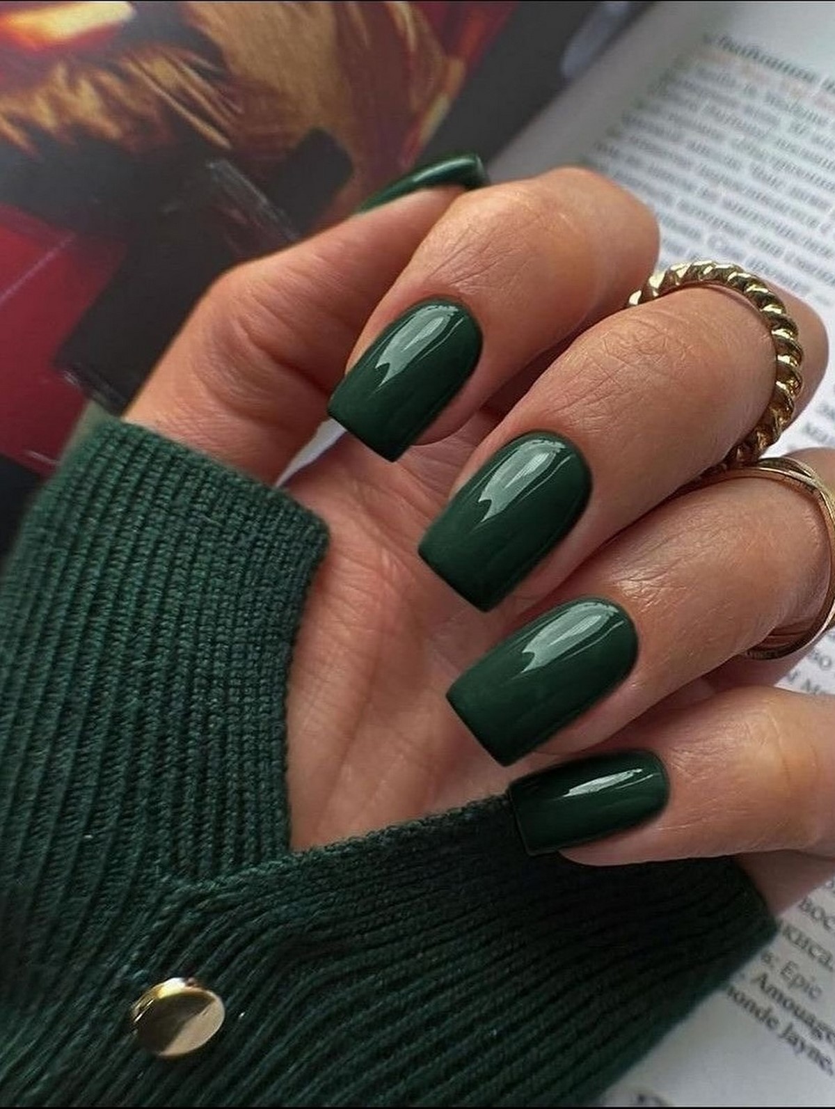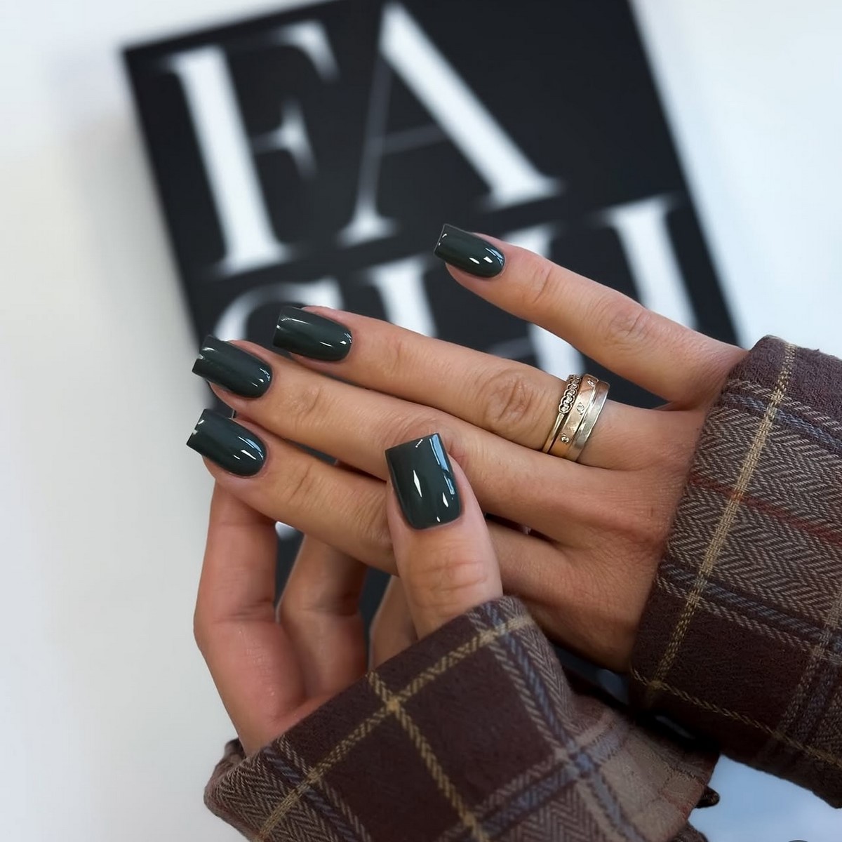 Глубокий зеленый оттенок символизирует роскошь и гармонию. В октябре 2025 он становится одним из ключевых цветов, отлично сочетаясь с золотым или серебристым декором. Такой маникюр добавляет образу элегантности и глубины.