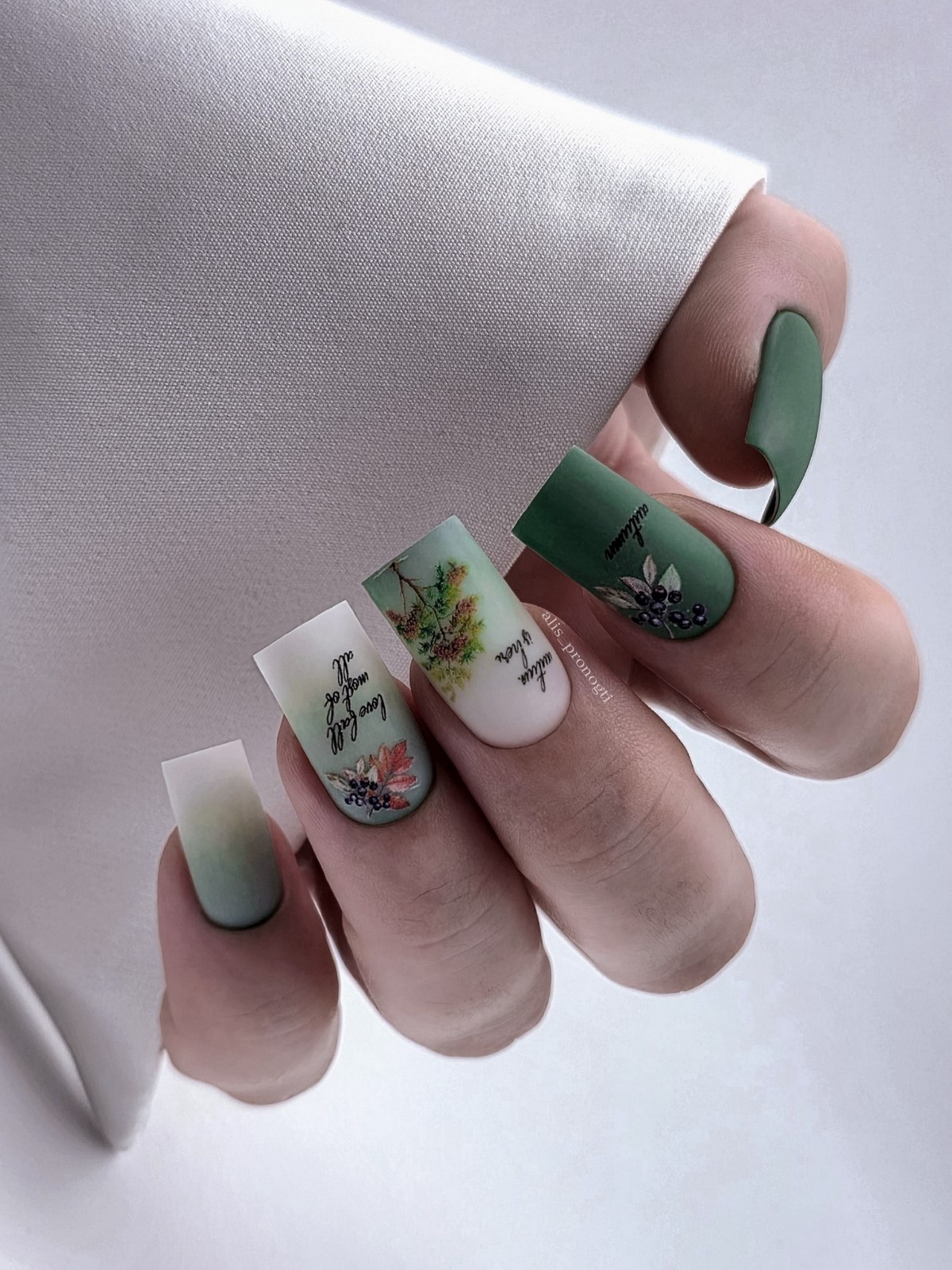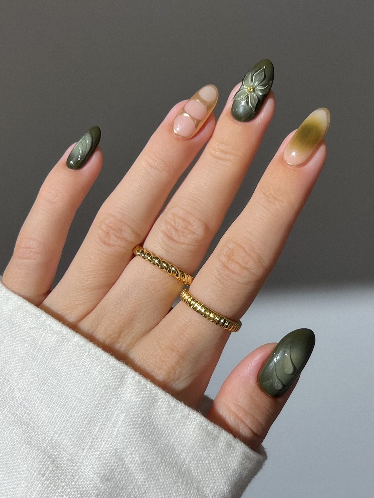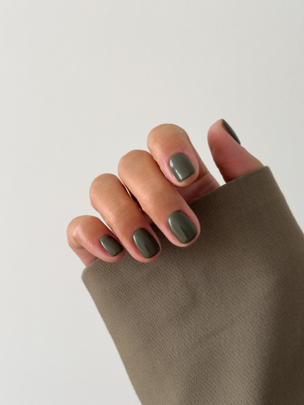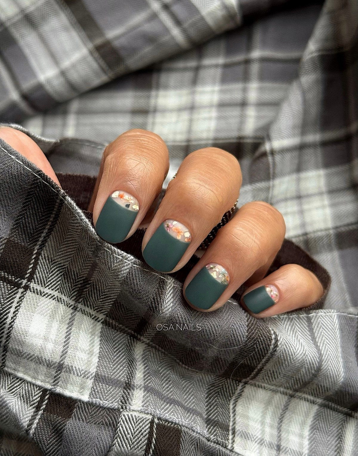 Глубокий зеленый оттенок символизирует роскошь и гармонию. В октябре 2025 он становится одним из ключевых цветов, отлично сочетаясь с золотым или серебристым декором. Такой маникюр добавляет образу элегантности и глубины.