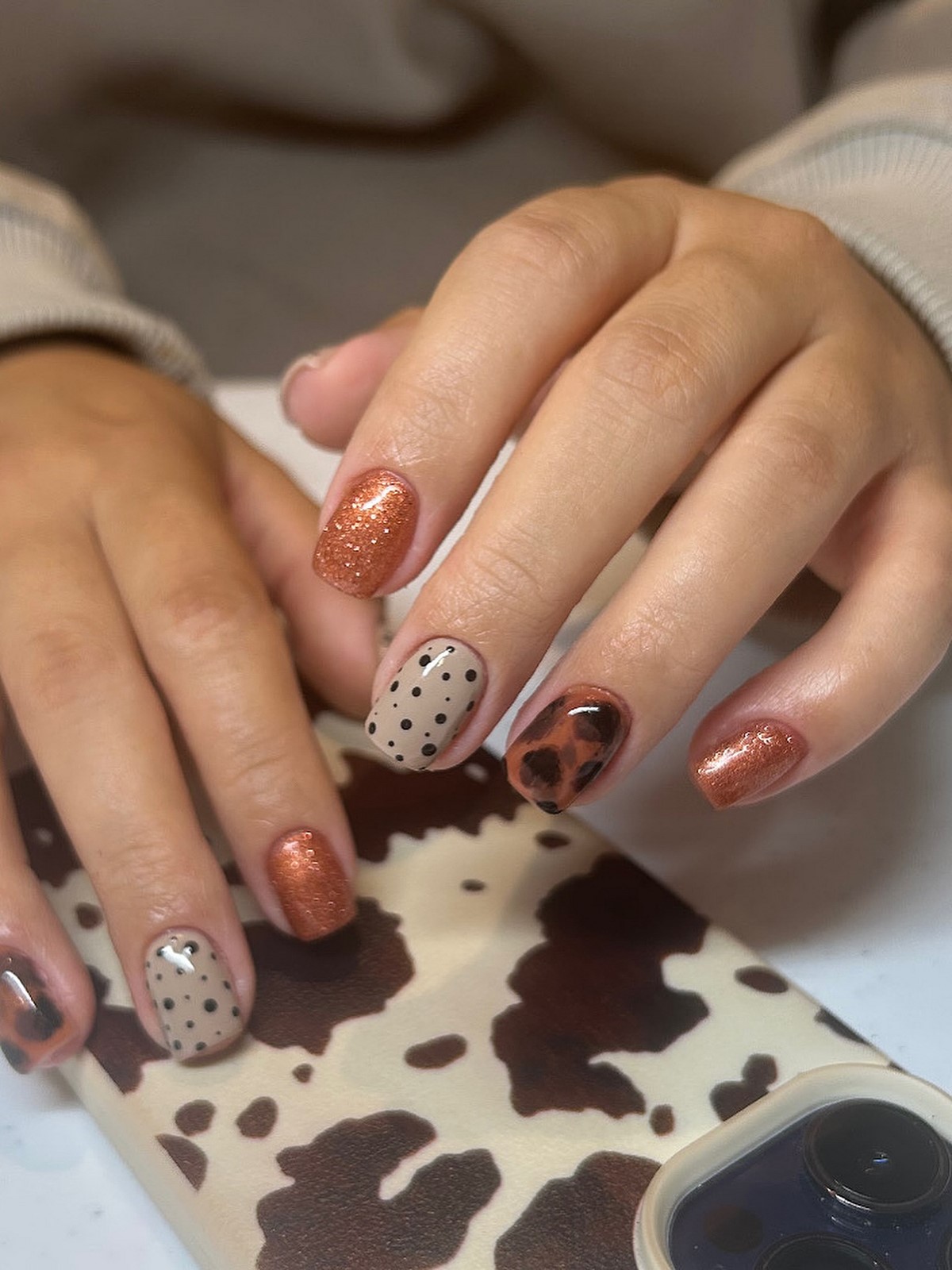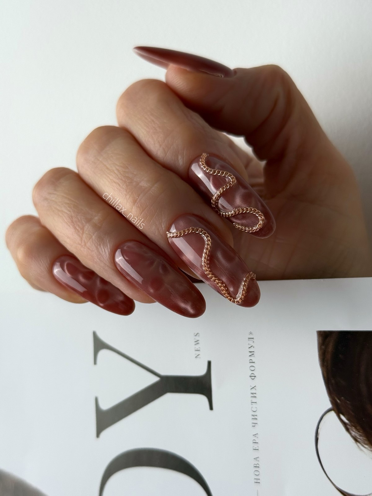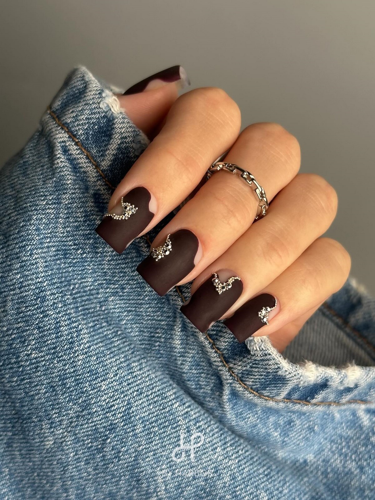 Главный цвет осени — коричневый — в этом сезоне раскрывается необычно. Матовое покрытие комбинируется с негативным пространством, а стразы добавляют изысканности. Такой дизайн напоминает теплые оттенки кофе и шоколада, идеально вписываясь в октябрьский гардероб.