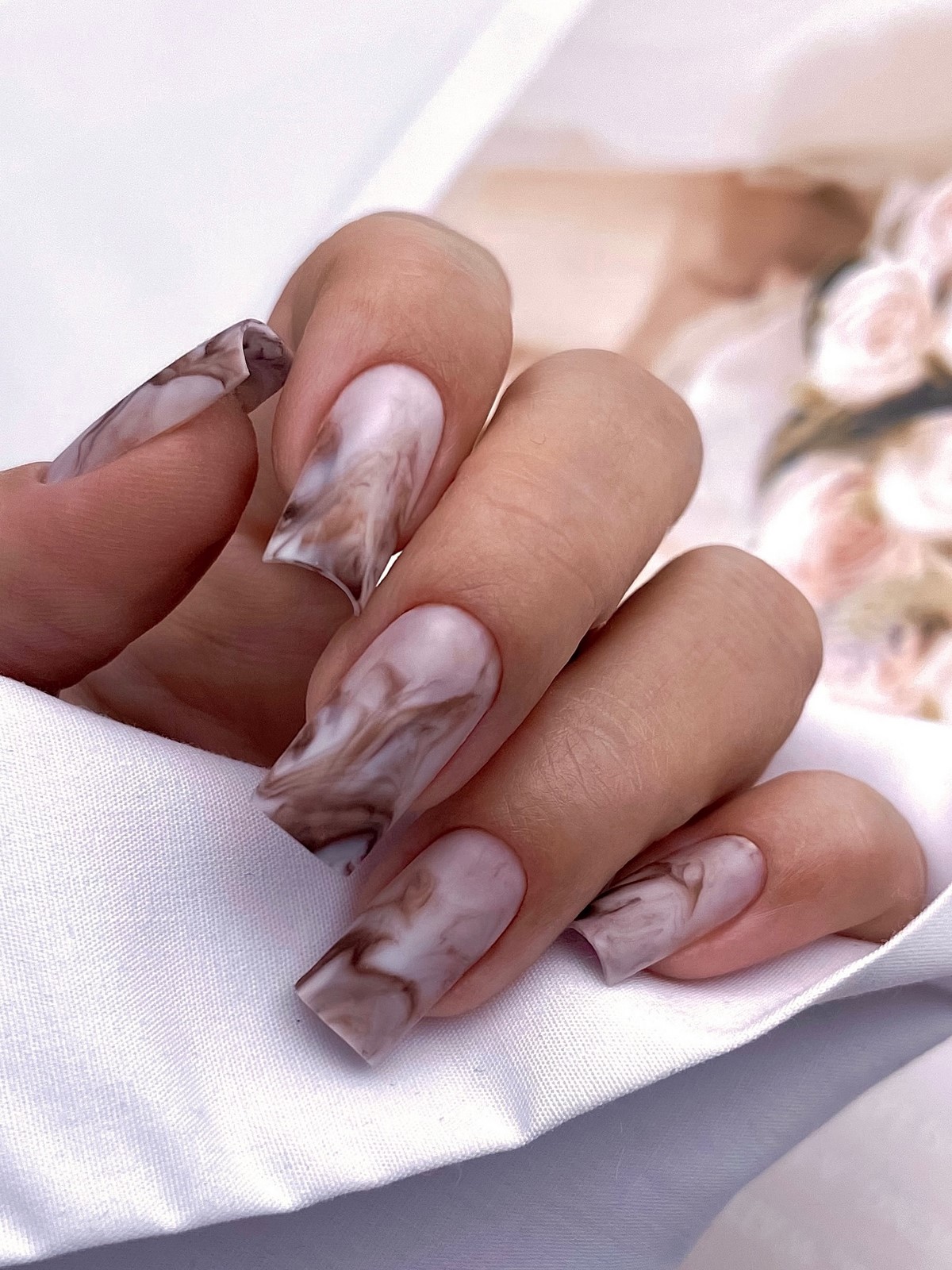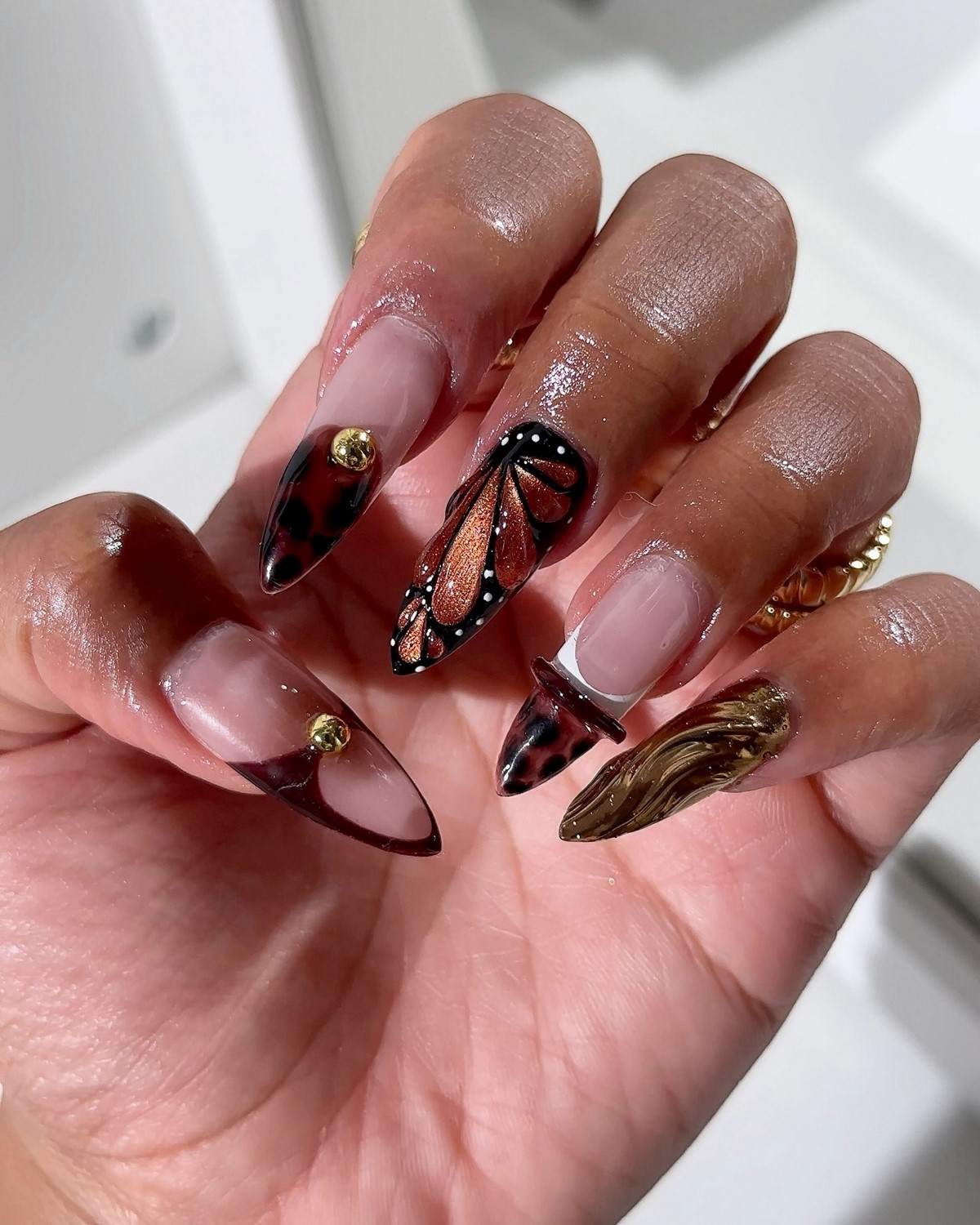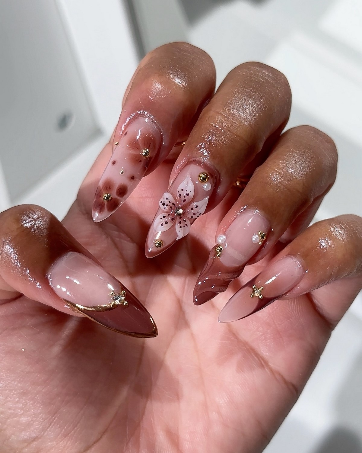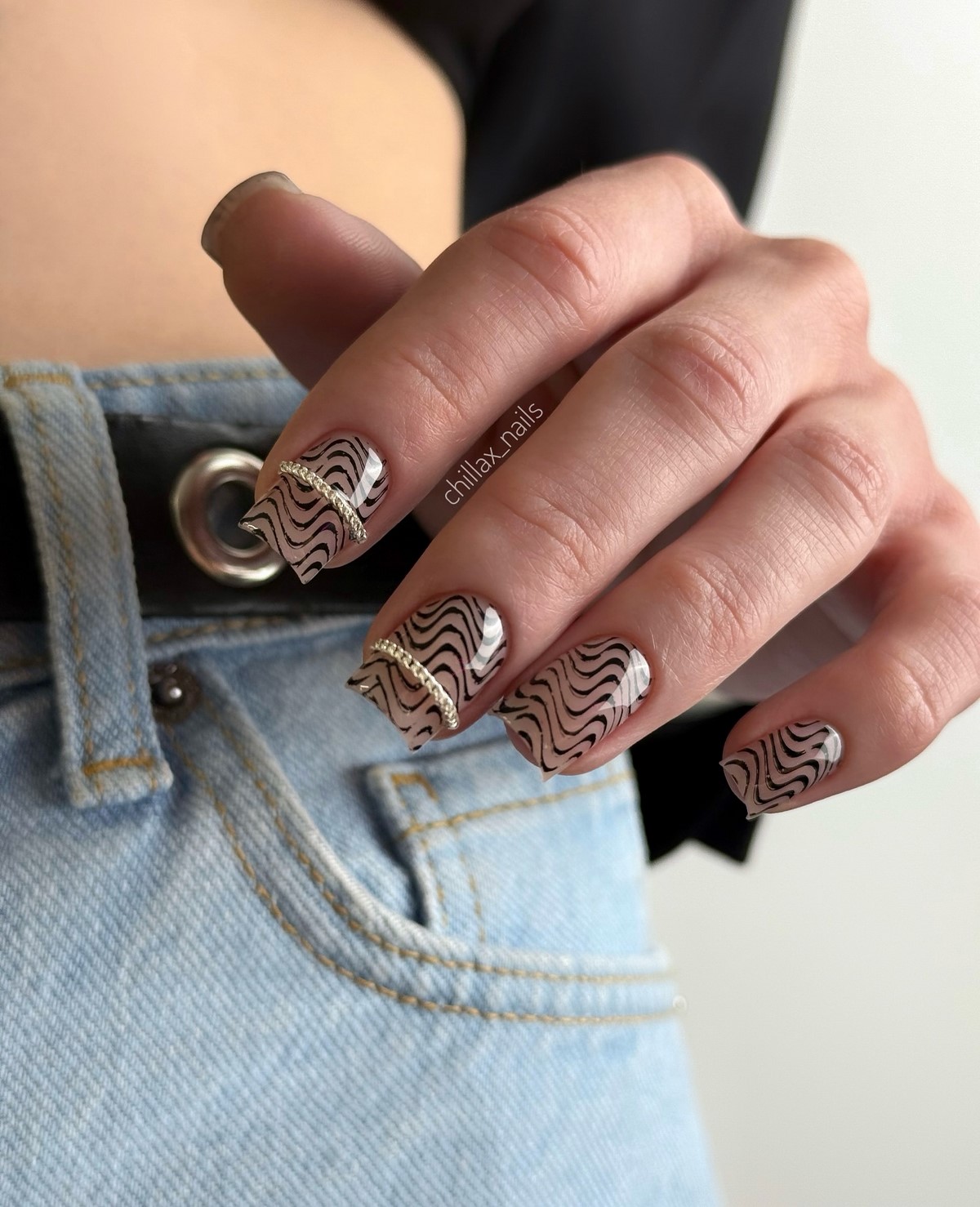 Главный цвет осени — коричневый — в этом сезоне раскрывается необычно. Матовое покрытие комбинируется с негативным пространством, а стразы добавляют изысканности. Такой дизайн напоминает теплые оттенки кофе и шоколада, идеально вписываясь в октябрьский гардероб.