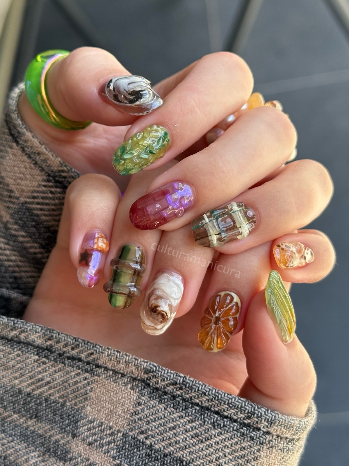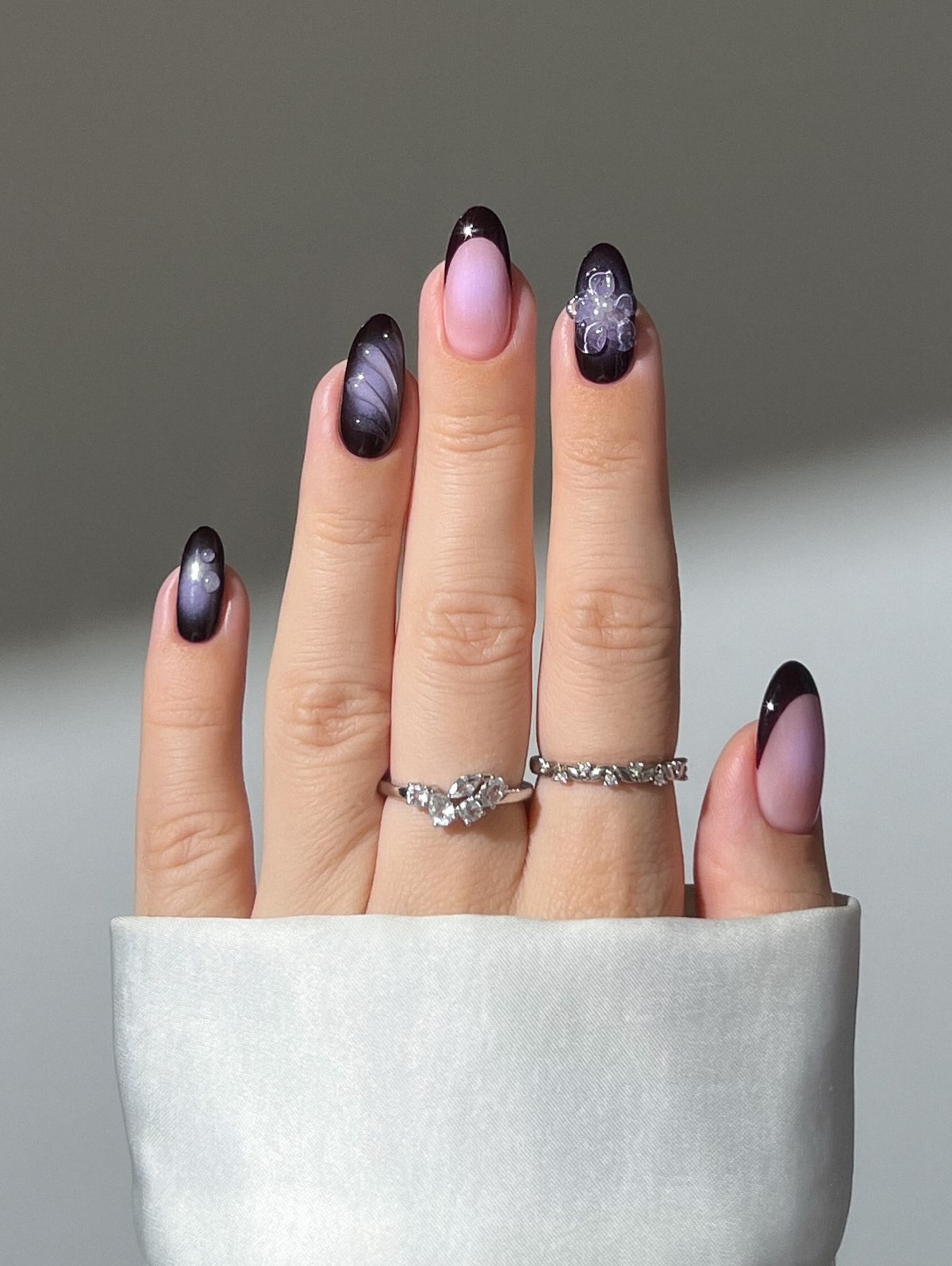- Техники: стемпинг, аура-дизайн, негативное пространство, матовое и глянцевое комбинирование, 3D-декор.