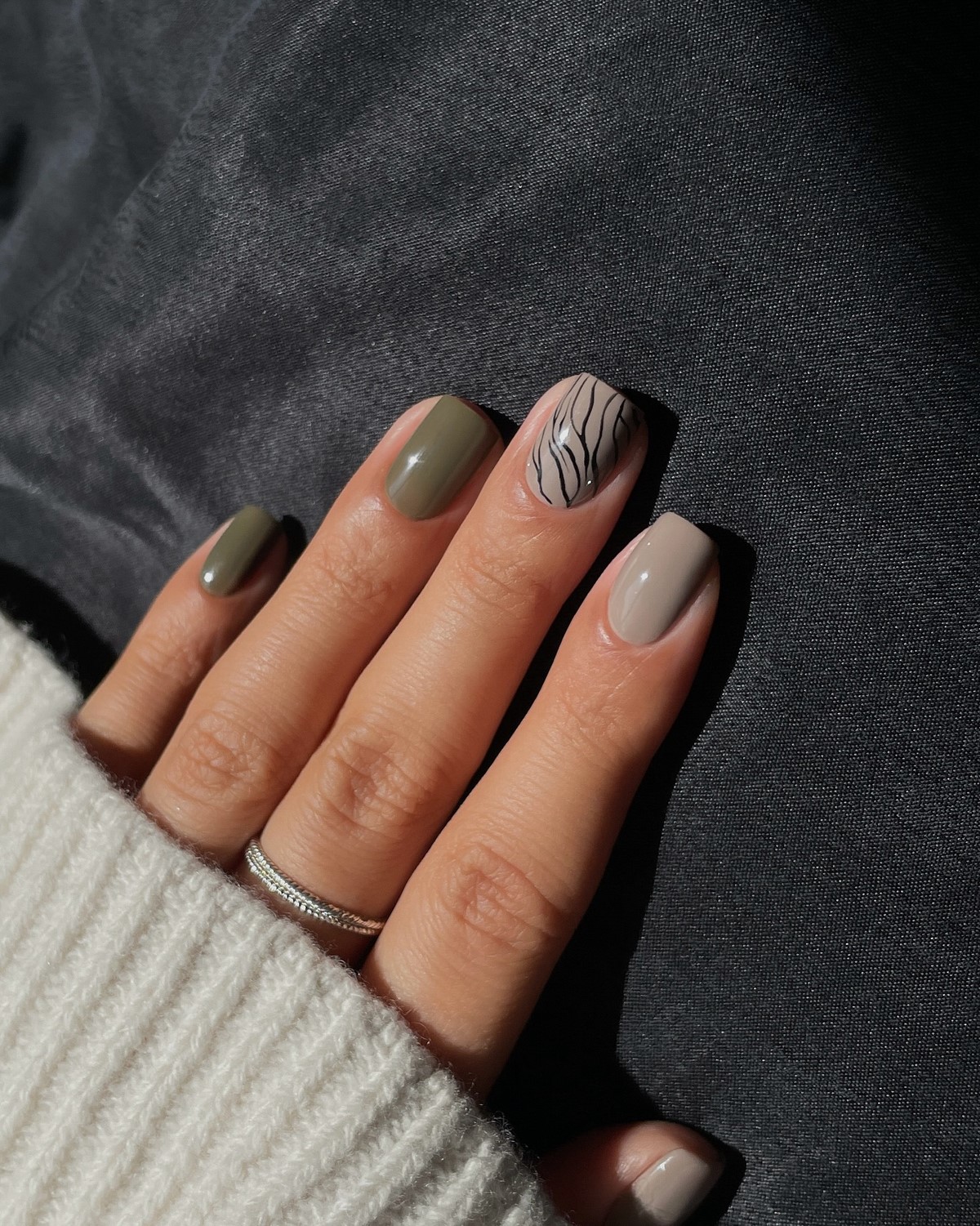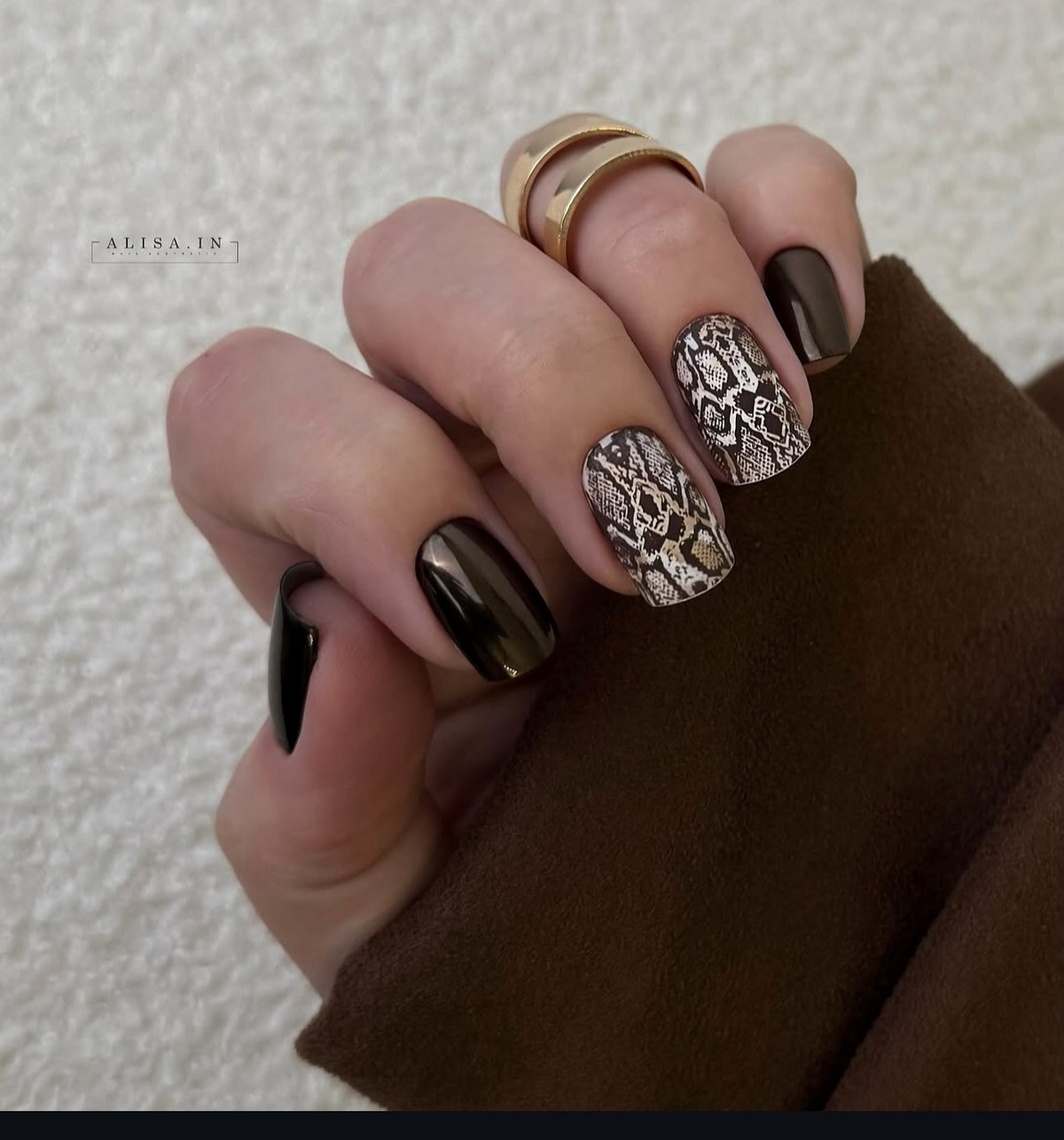 Анималистичные мотивы снова в тренде. Змеиный узор на ногтях добавляет смелости и сексуальности образу. В октябре он особенно хорошо смотрится в темных оттенках с металлическим блеском.