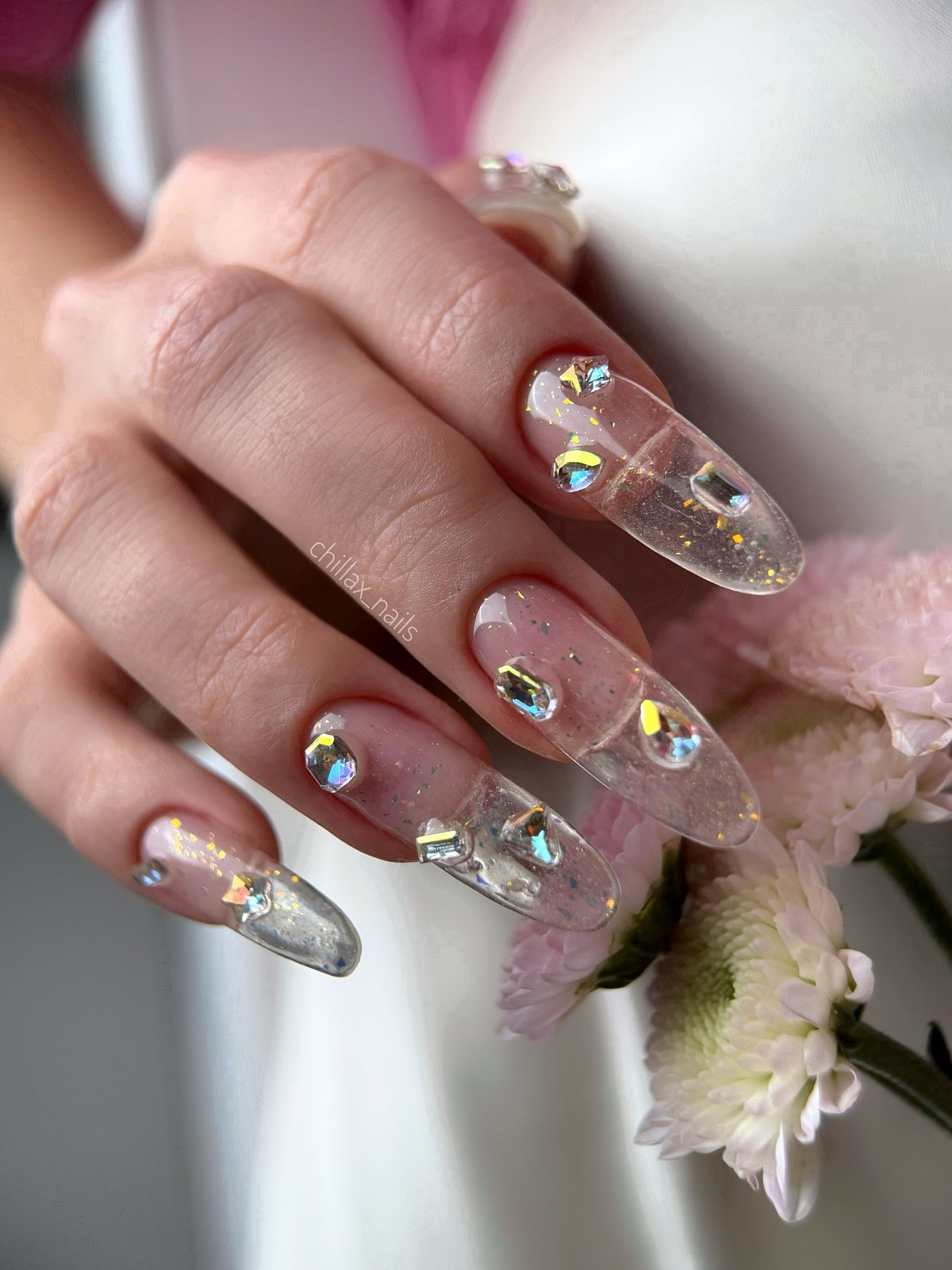Кристаллы и стразы остаются универсальным способом придать ногтям эффектный вид. В октябре 2025 они используются дозированно: одна-две акцентные ногтевые пластины или тонкая дорожка камней. Такой маникюр уместен как в повседневной жизни, так и для особых событий.