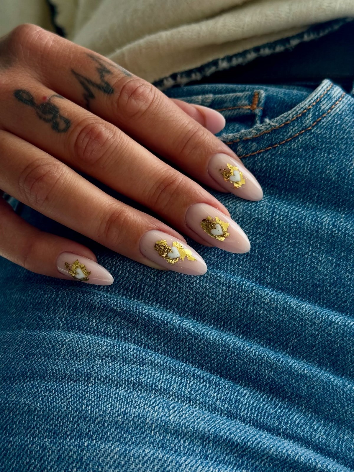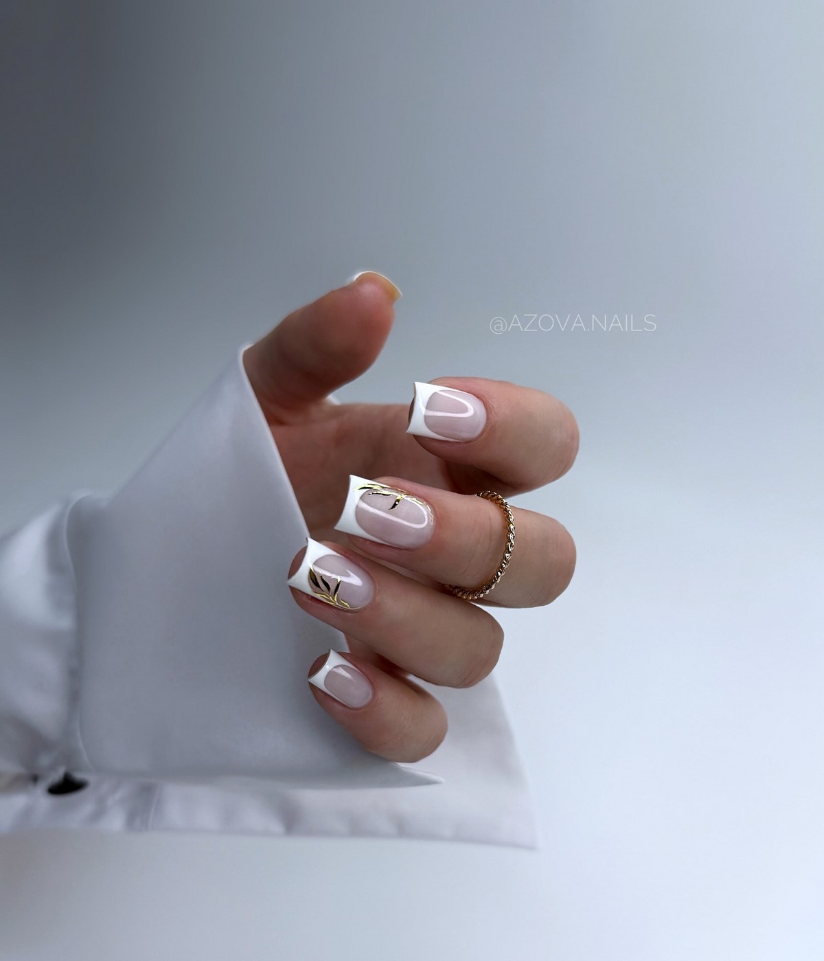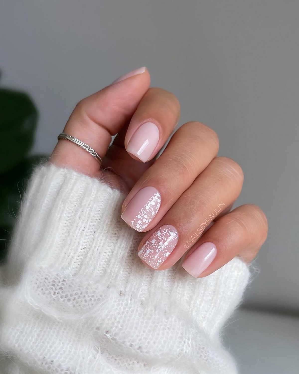 Классический нюдовый маникюр в октябре преображается благодаря акцентам. Бусины, жемчужины и белая паутинка делают его стильным и современным. Такой дизайн подойдет как для офиса, так и для вечерних образов.