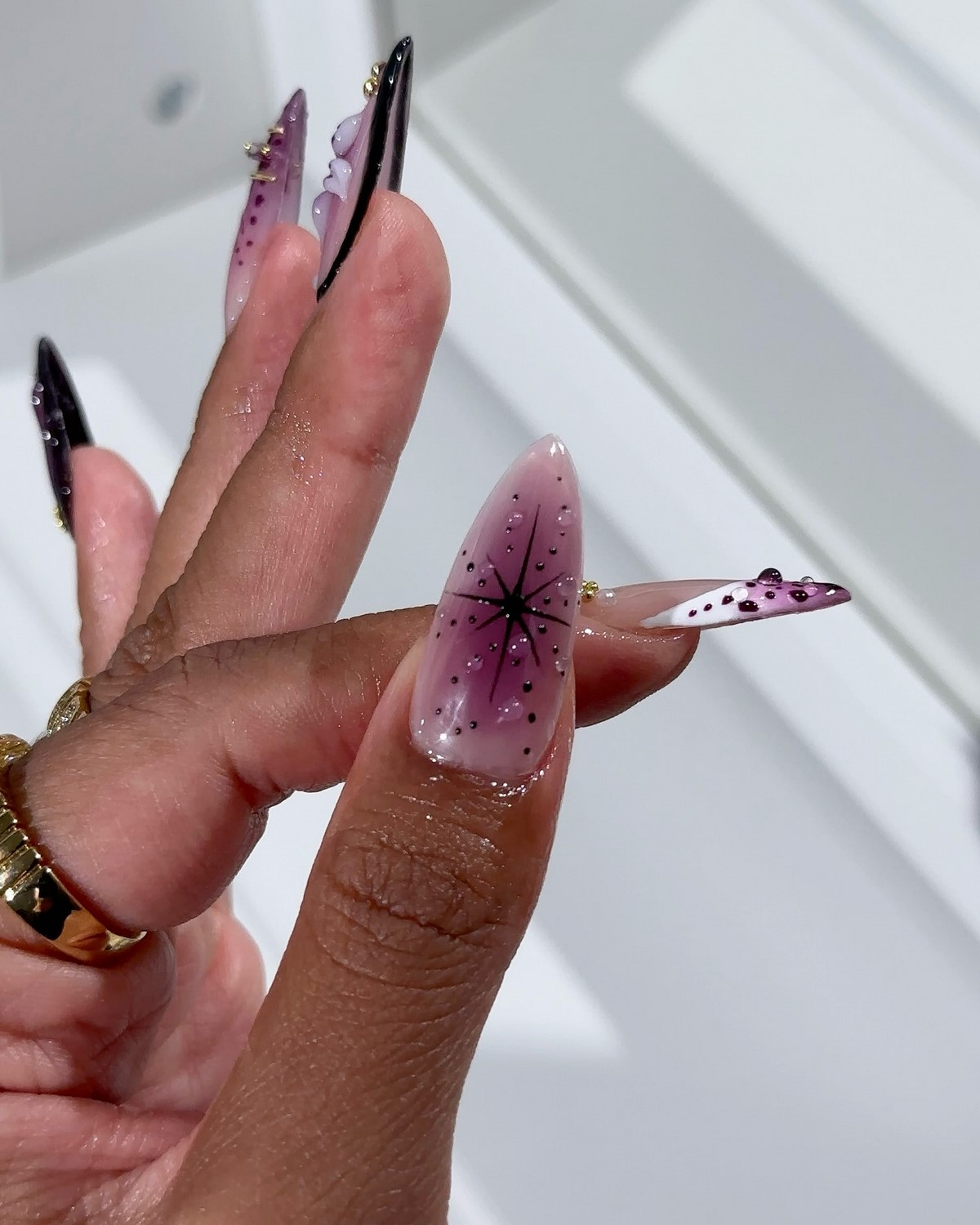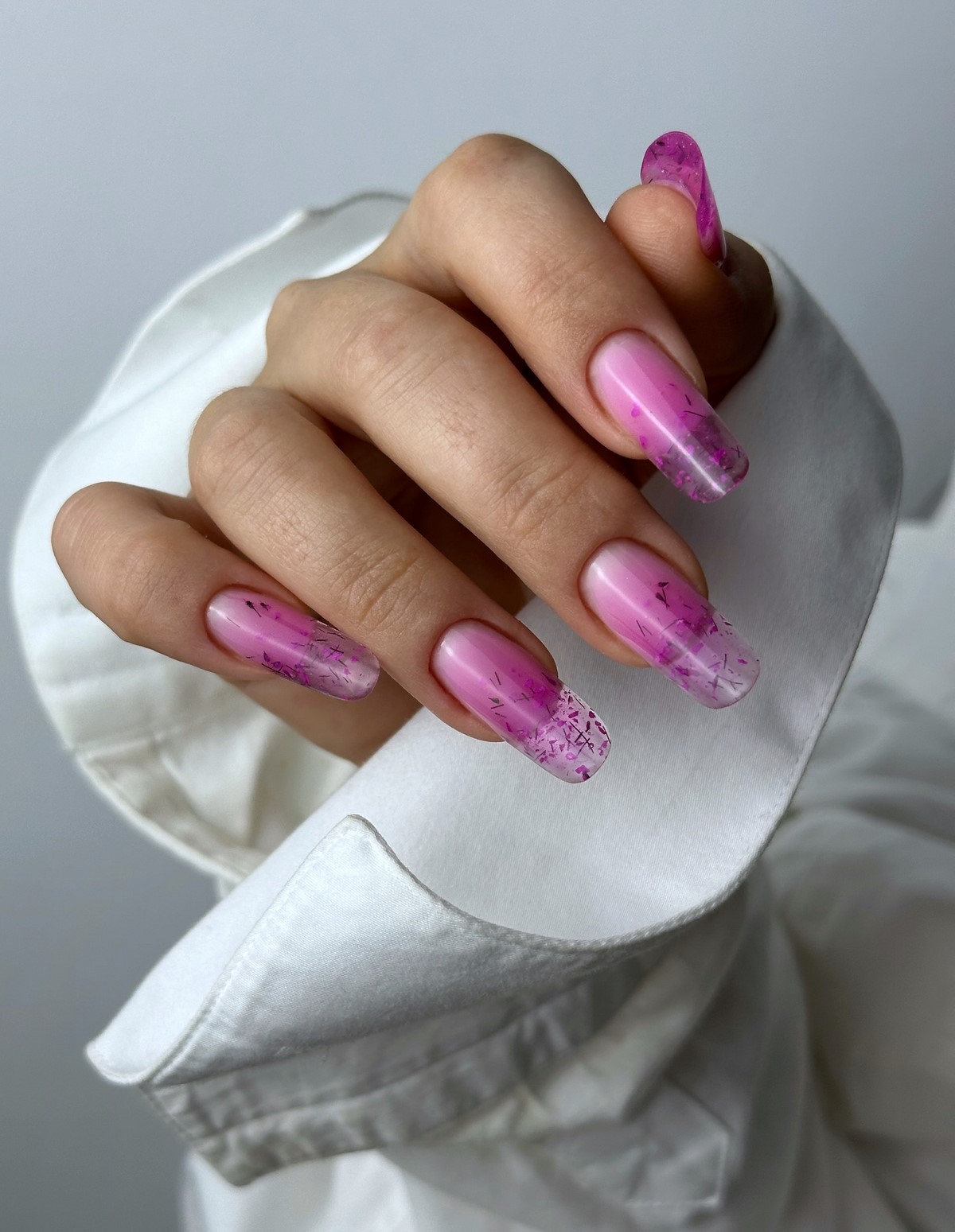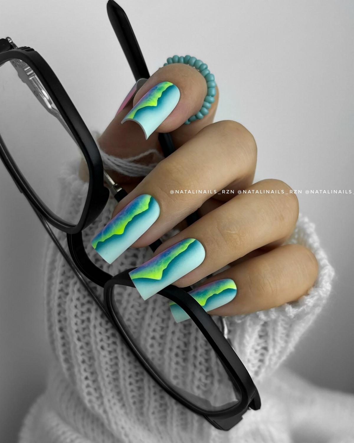 Эффект ауры на ногтях — это плавные переходы оттенков, напоминающие свечение. В комбинации с 3D-декором дизайн выглядит футуристично и ярко. Осенью его часто выполняют в изумрудных, фиолетовых и темно-синих тонах.