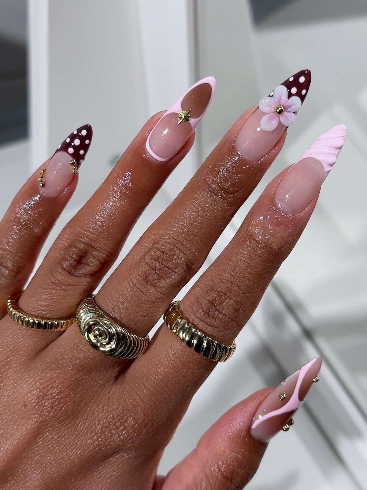 В тренде смешение техник: матовое покрытие с глянцевыми акцентами, минимализм с яркой деталью, использование камней и 3D-элементов. Такой маникюр легко адаптируется под повседневные образы и вечерние выходы, что делает его универсальным для модниц разных возрастов.