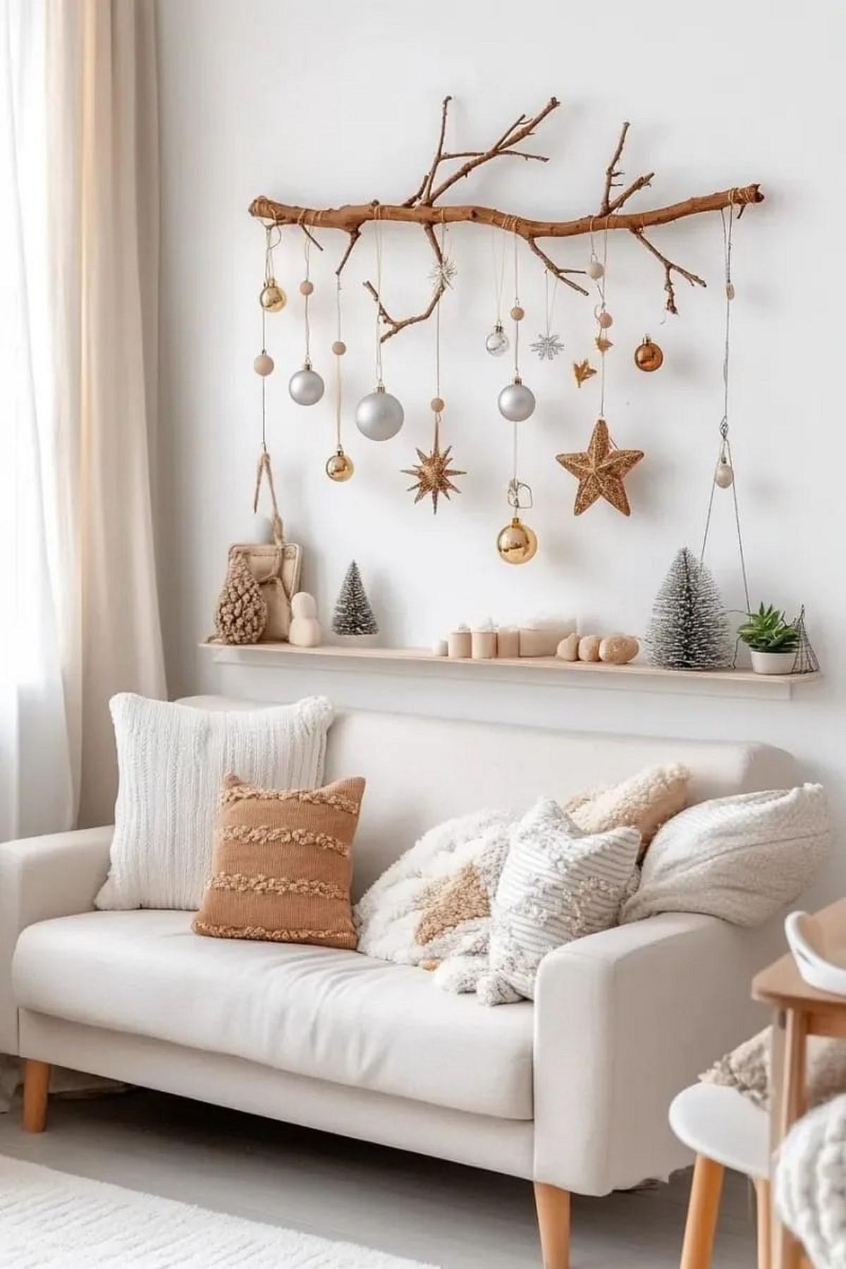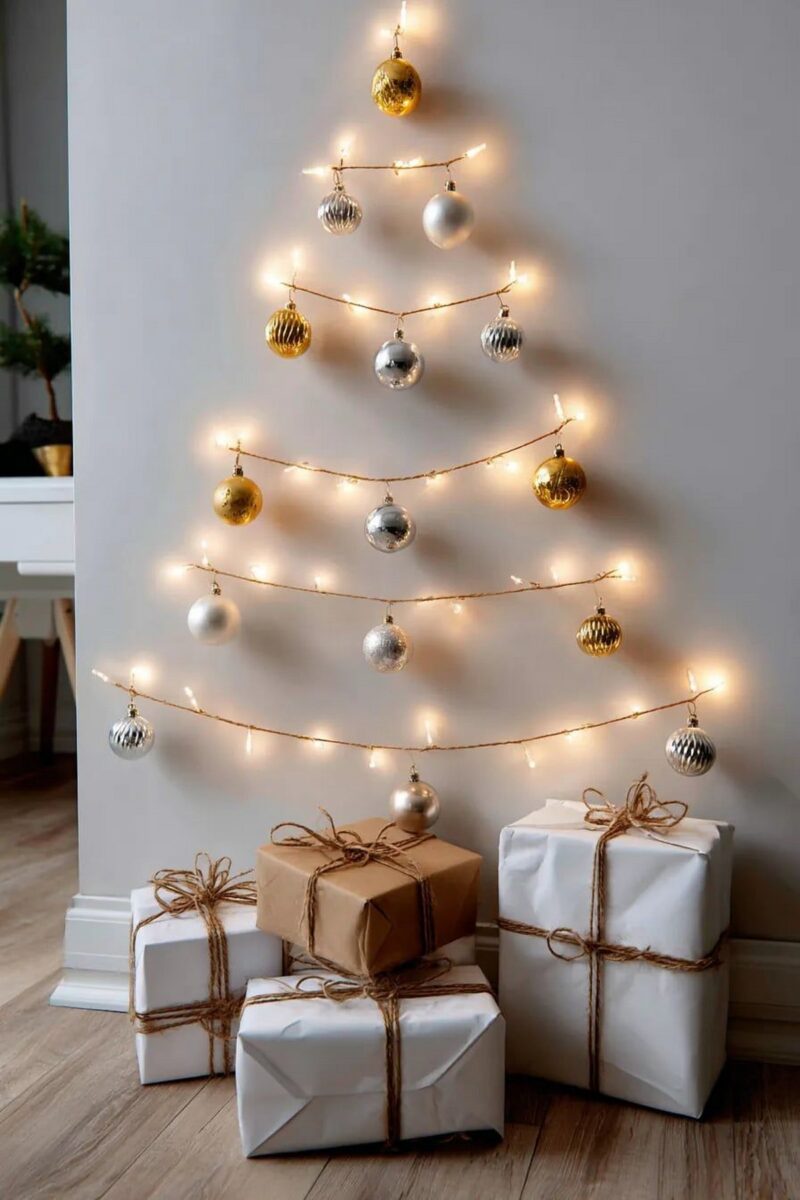 Стены украшают минималистичными композициями — ветви туи или эвкалипта, световые инсталляции, рамки с новогодними принтами. В моде — аккуратные вертикальные гирлянды и световые капли.