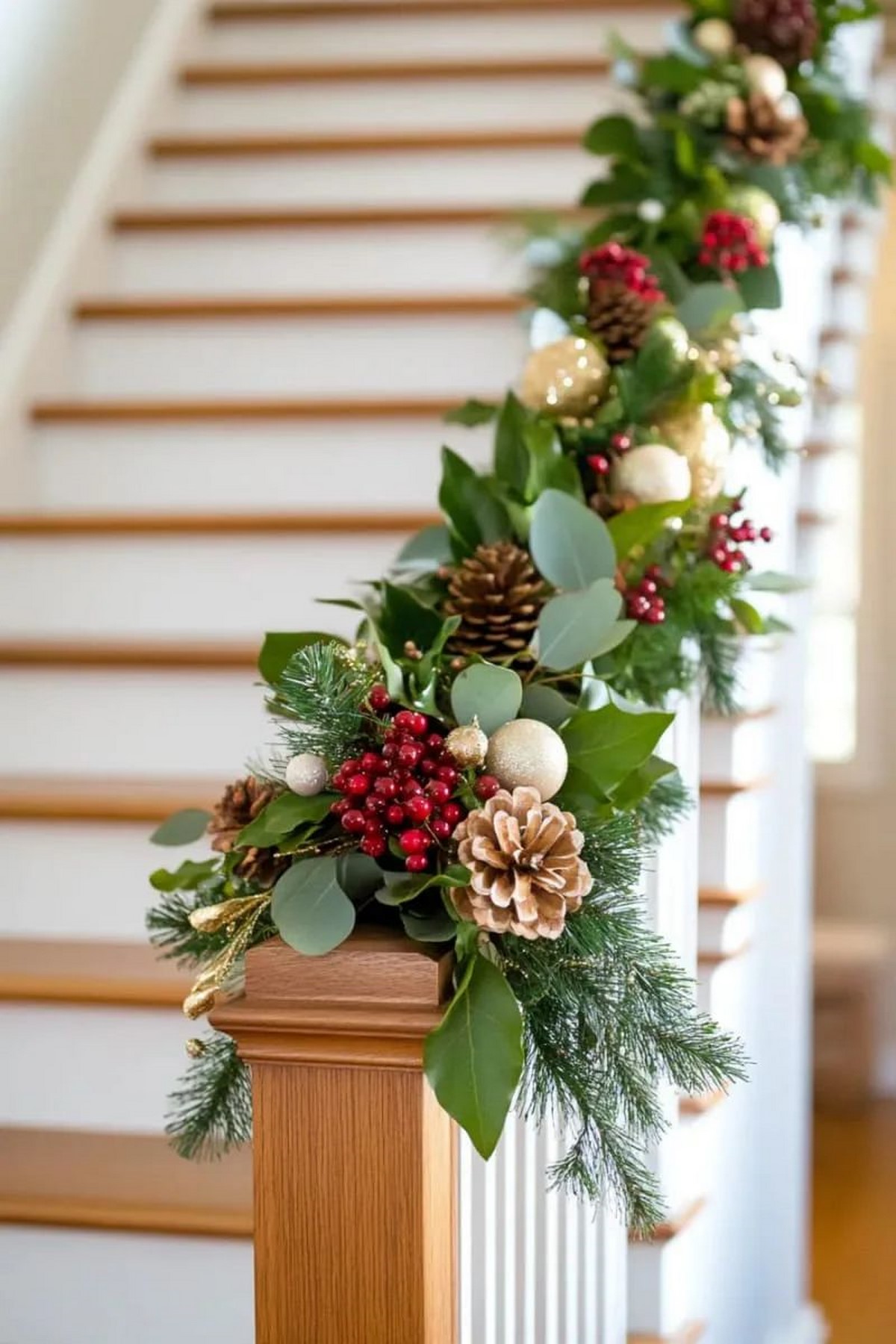 Лестницы украшают живыми хвойными гирляндами, длинными бархатными лентами и мягким тёплым светом. Тренд — «натуральная элегантность»: минимум пластика, максимум хвои и ткани.