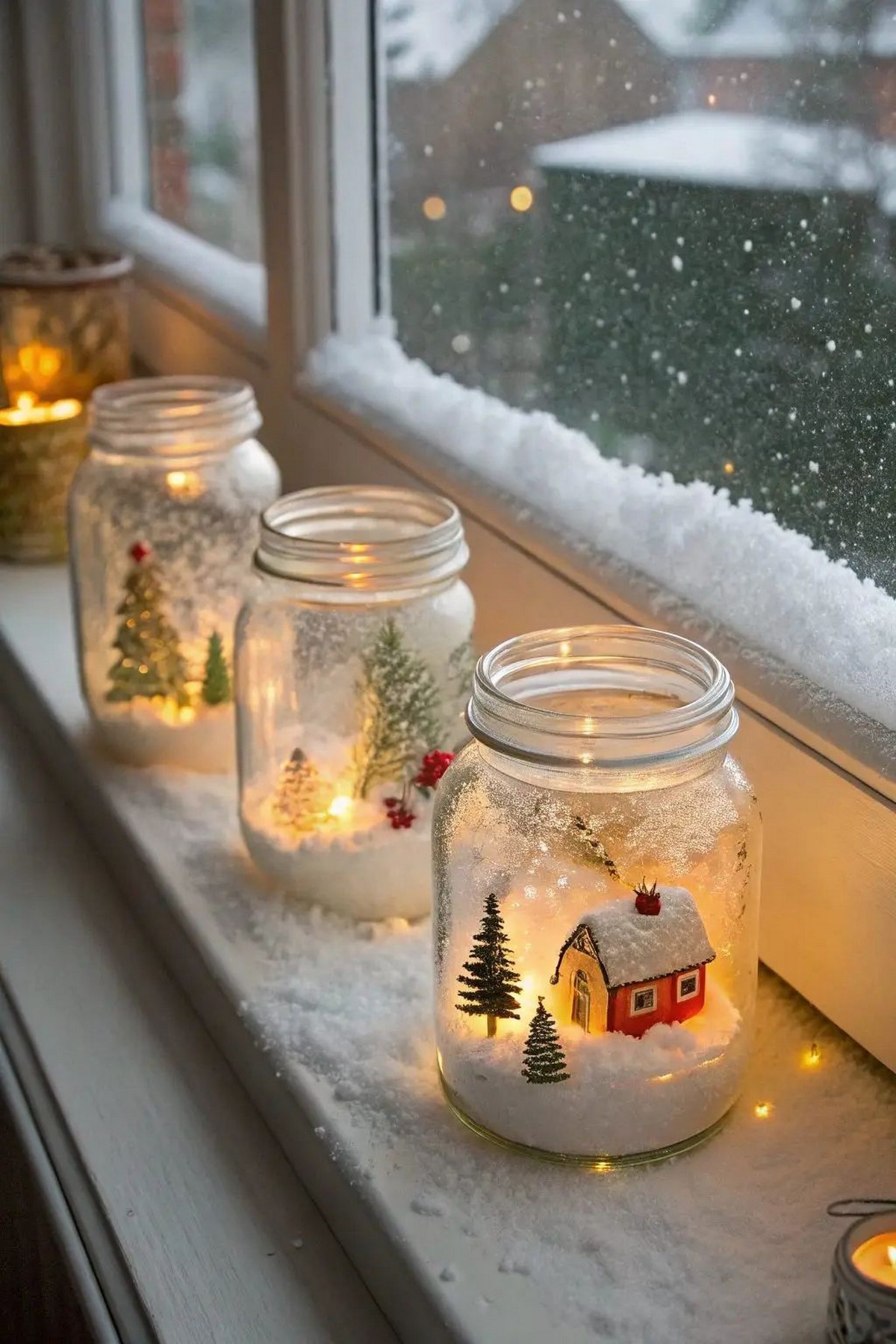 В 2026 году популярны оконные композиции из свечей (LED), небольших ёлочек и мини-игрушек на подоконнике — создают уют улицам и дому одновременно.