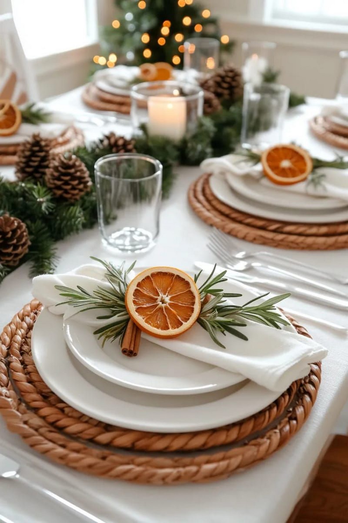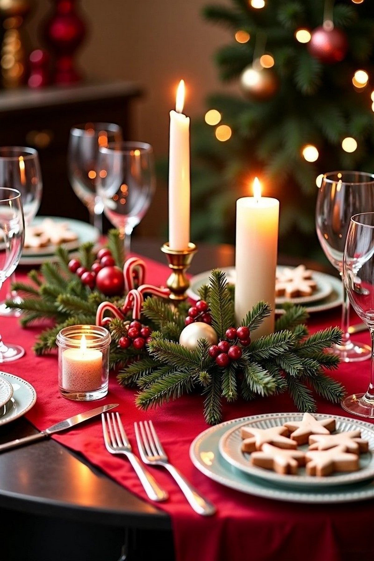 Сервировка строится на многослойности. Актуальны салфетки из хлопка или льна, декоративные кольца, еловые веточки и имитация инея. Свет — мягкий, приглушённый.