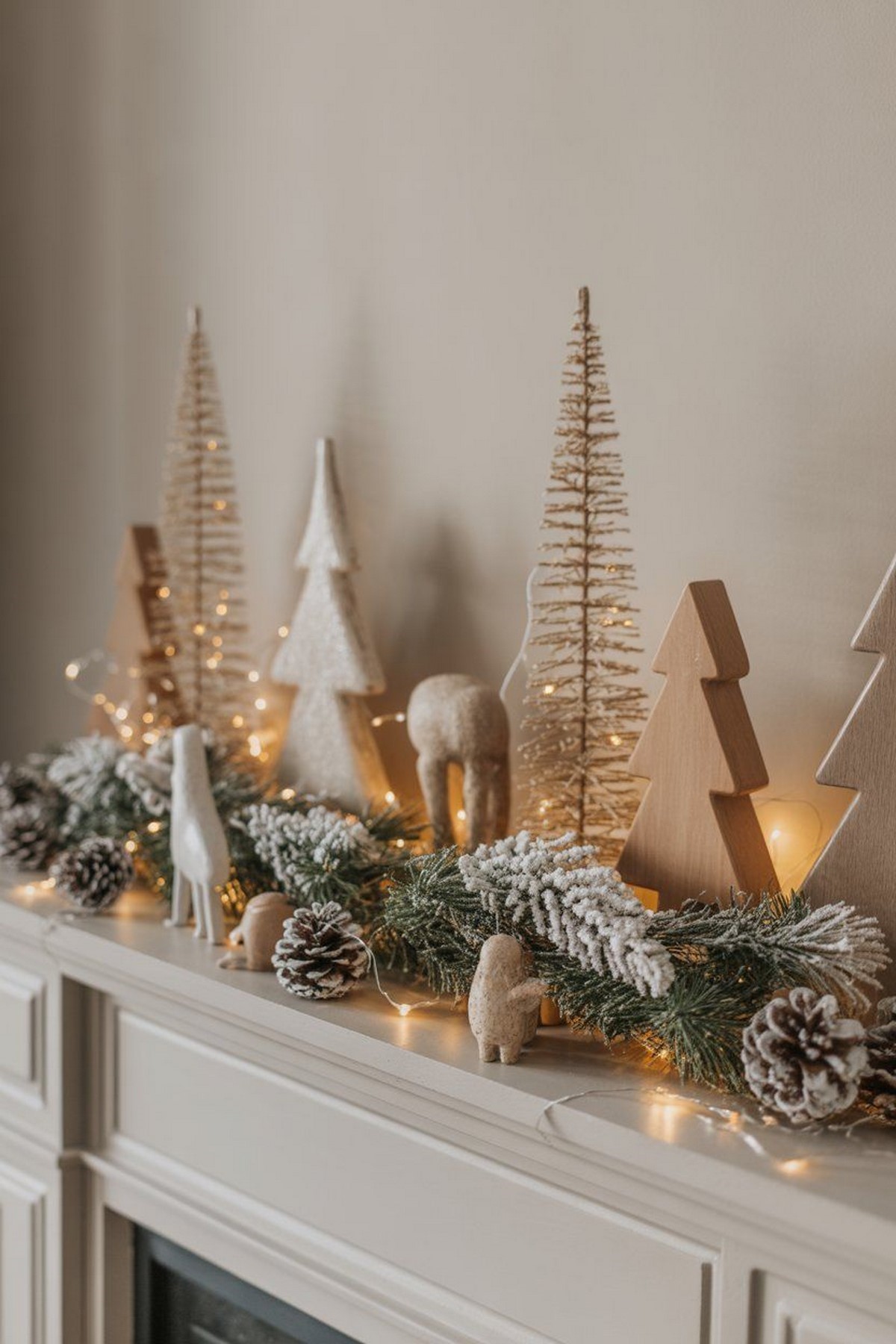Для комодов тренд — минималистичный «зимний натюрморт»: одна декоративная ёлка, небольшая лампа, свеча и пара игрушек. В 2026 году перегружать поверхность большим количеством мелких предметов не модно.