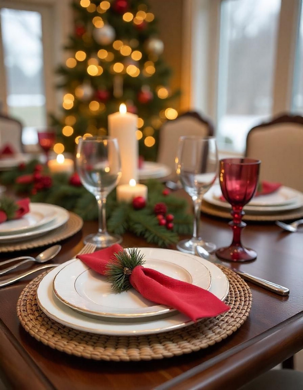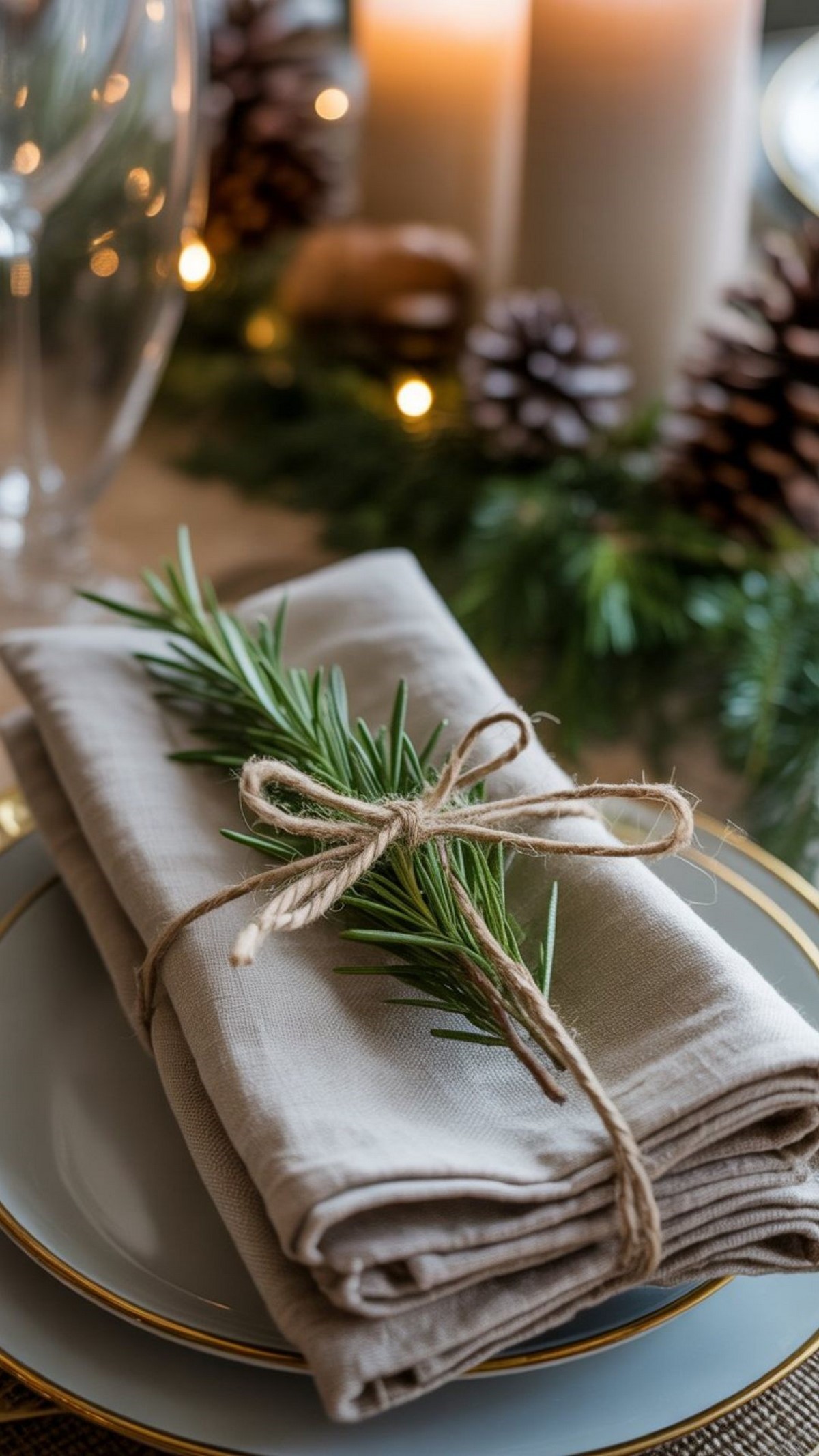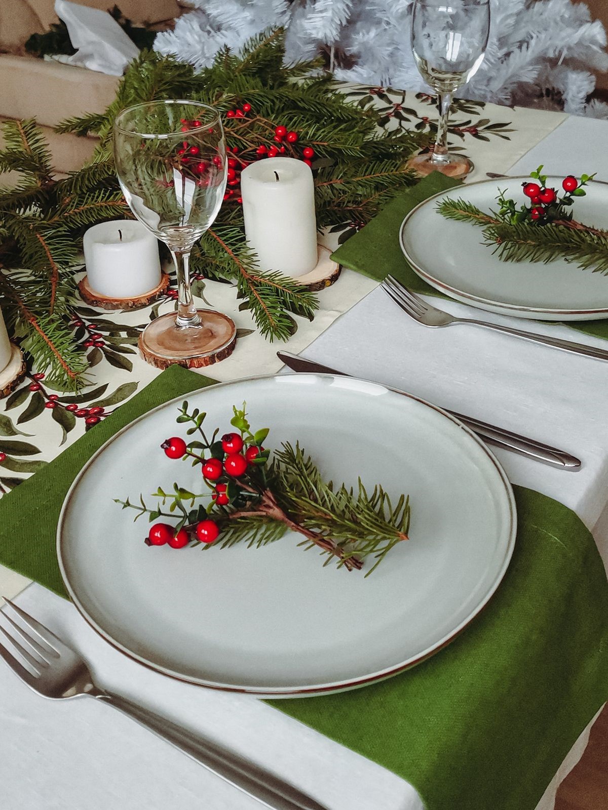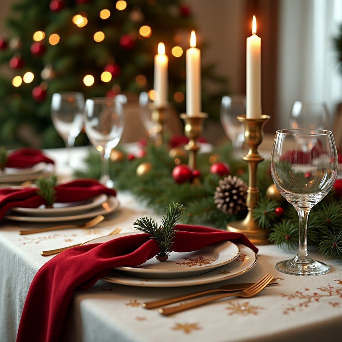 Сервировка строится на многослойности. Актуальны салфетки из хлопка или льна, декоративные кольца, еловые веточки и имитация инея. Свет — мягкий, приглушённый.