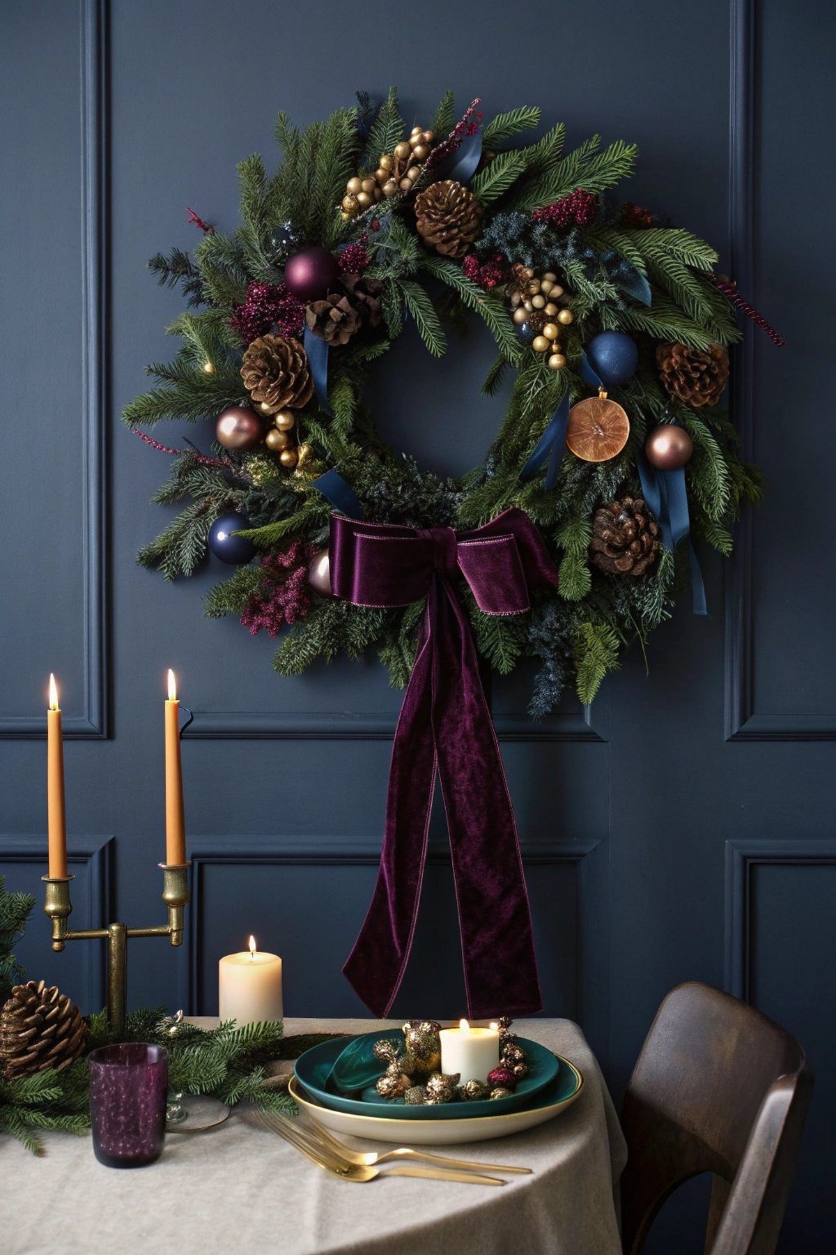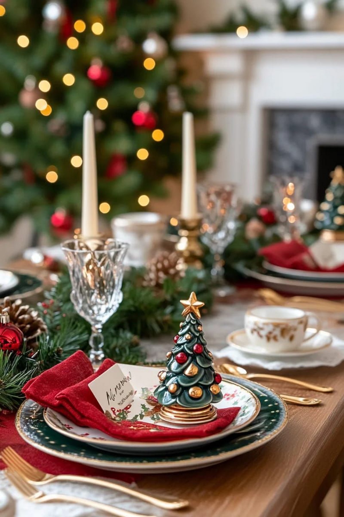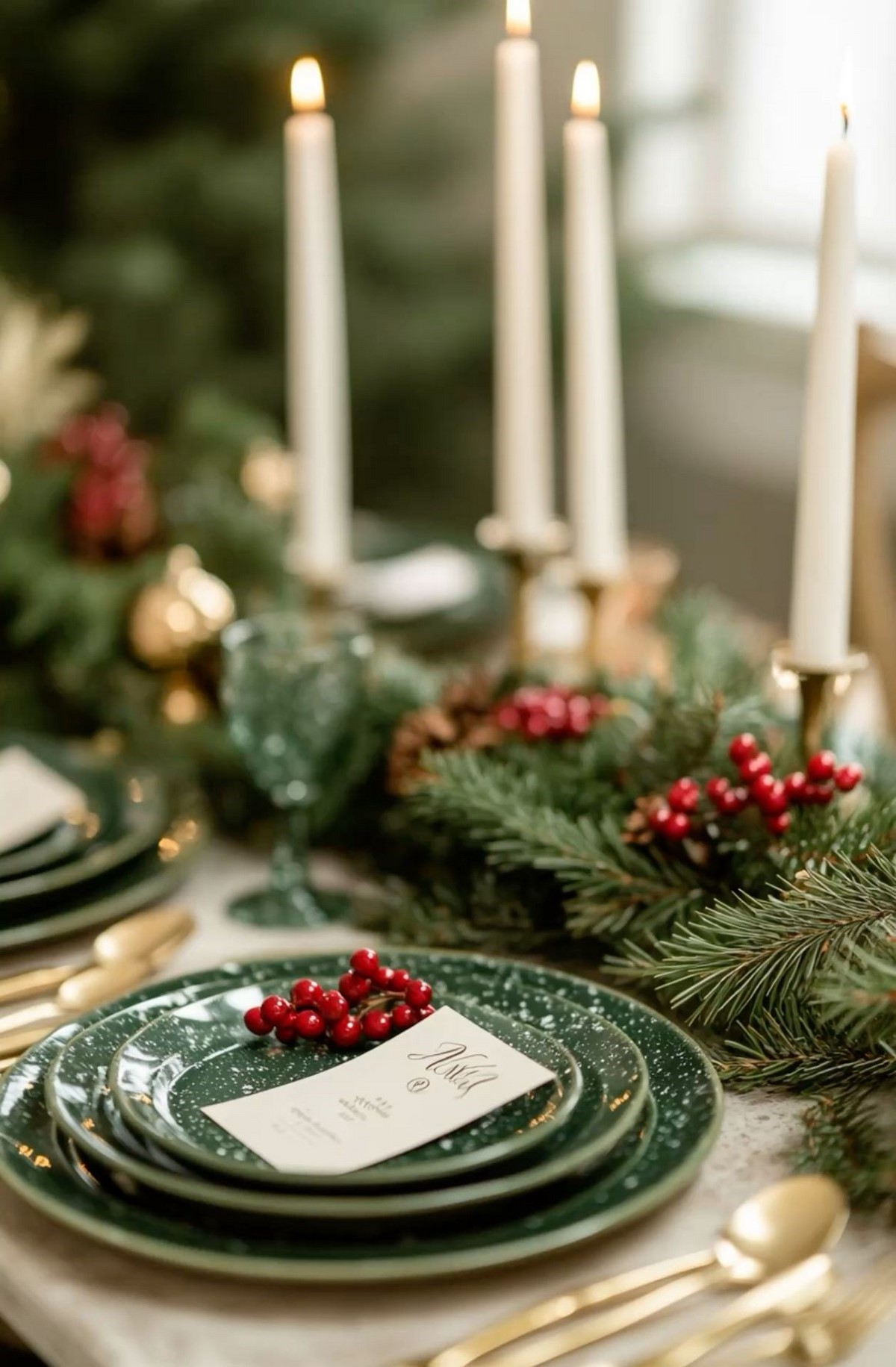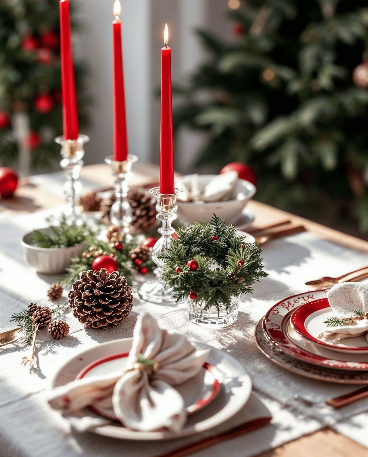 Сервировка строится на многослойности. Актуальны салфетки из хлопка или льна, декоративные кольца, еловые веточки и имитация инея. Свет — мягкий, приглушённый.