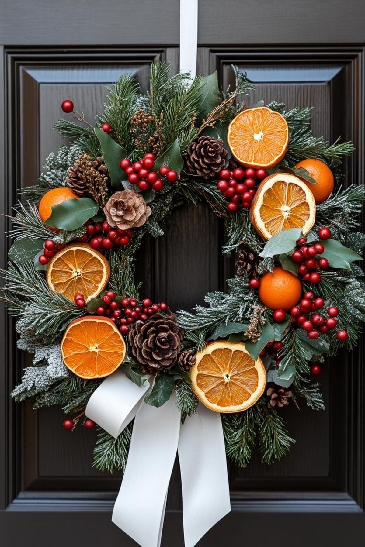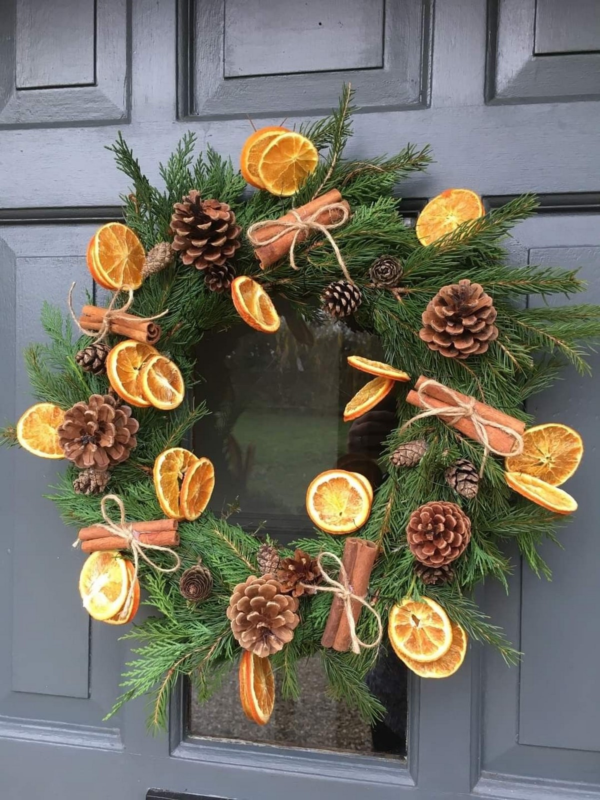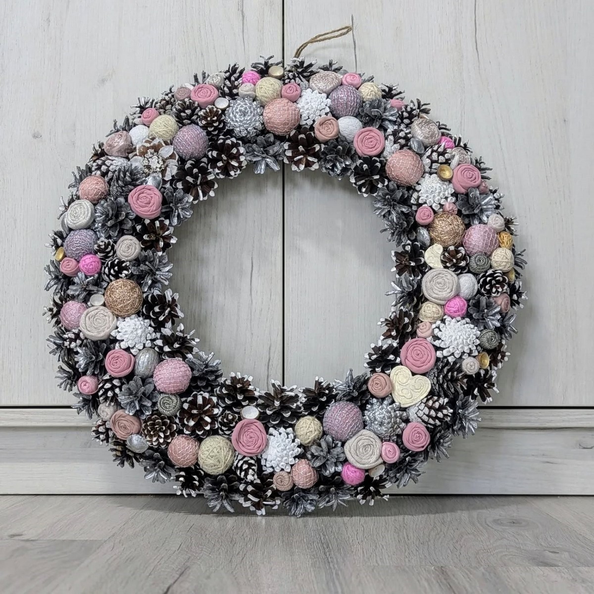 Новогодний венок в 2026 году выполнен преимущественно из натуральных материалов: хвоя, эвкалипт, еловые шишки, корица. Цвет — преимущественно природный с лёгким серебристым инеем.